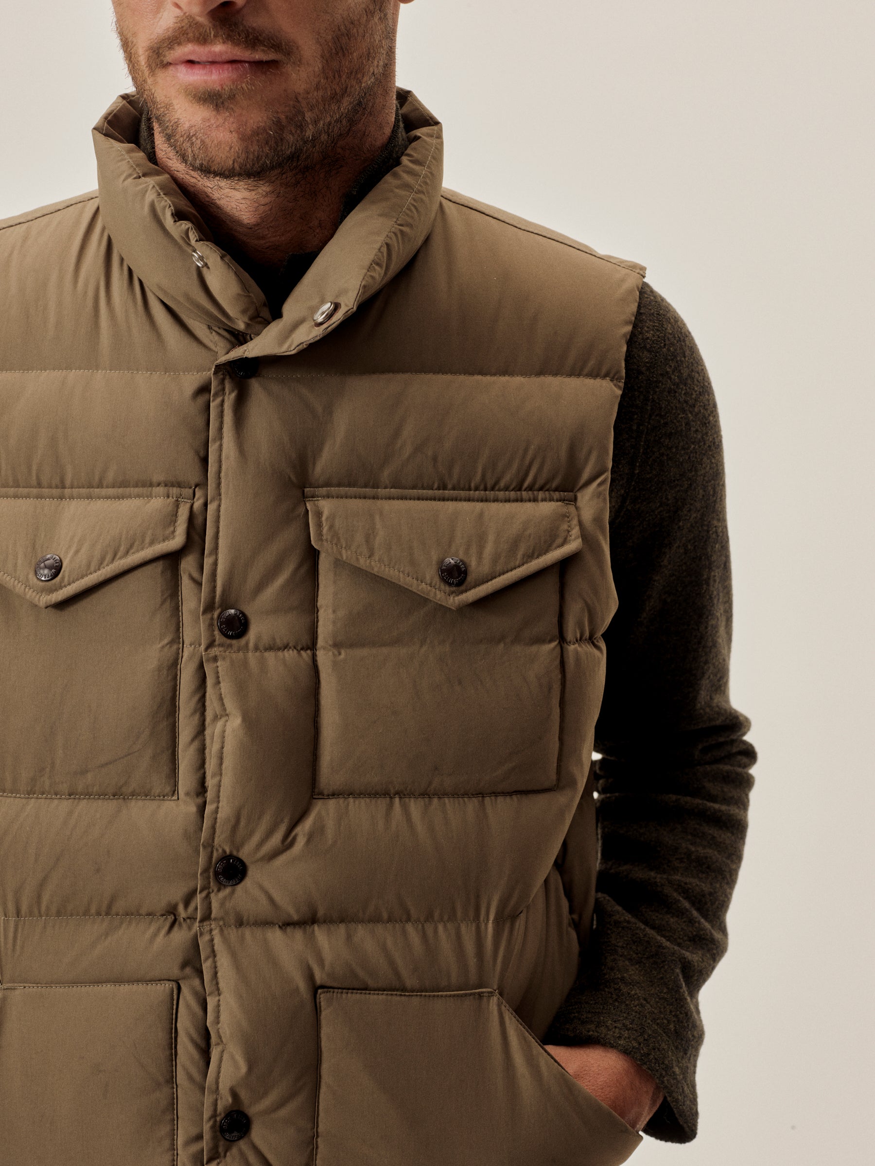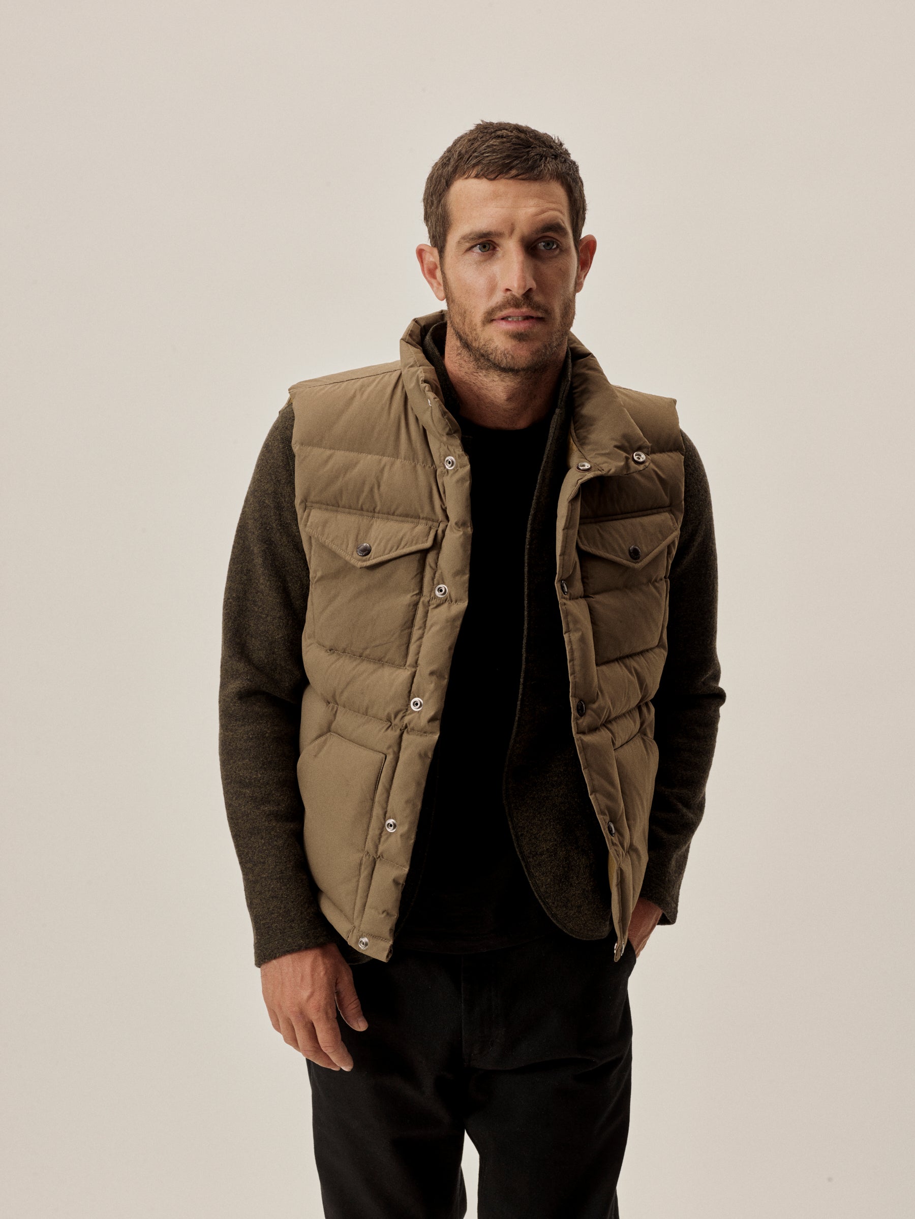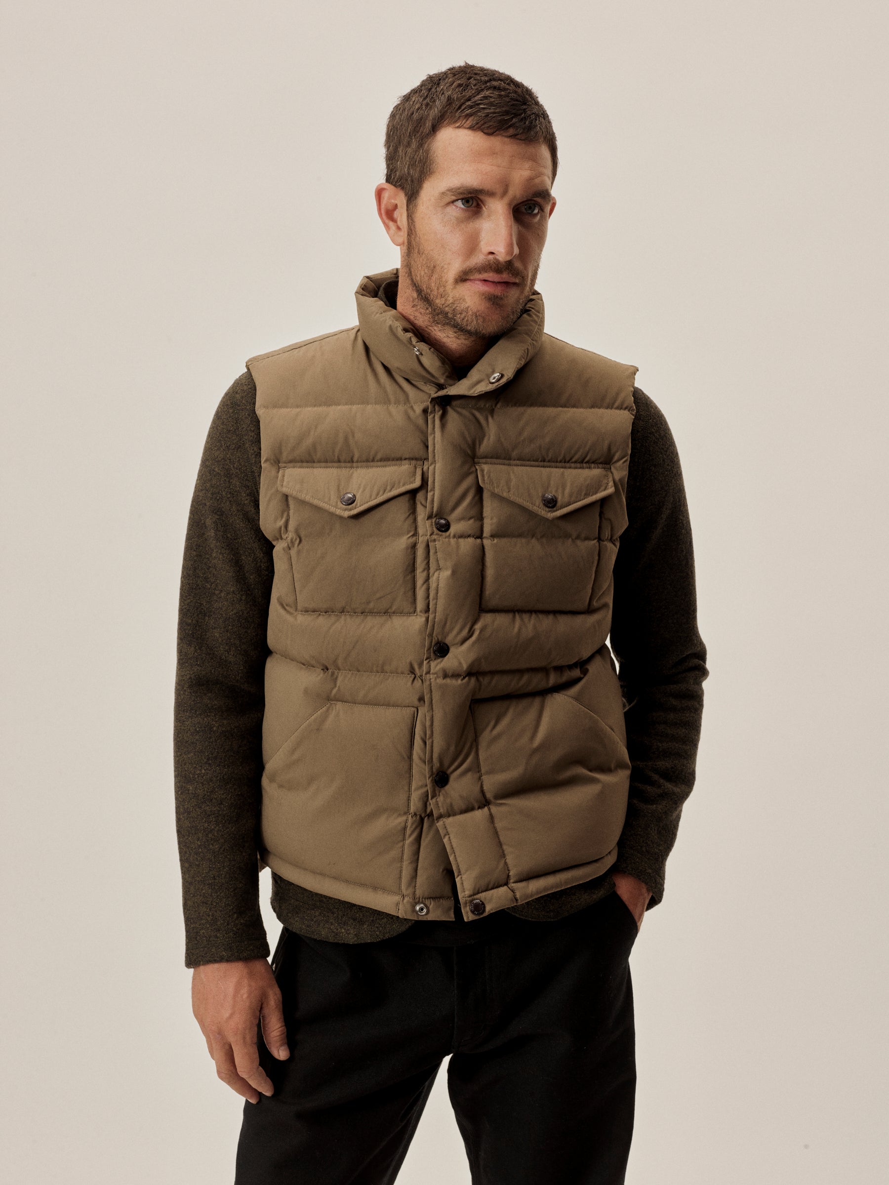 Vintage-inspired down vest cut from a recycled nylon shell with a durable water resistant coating. 650 fill-power traceable duck down.