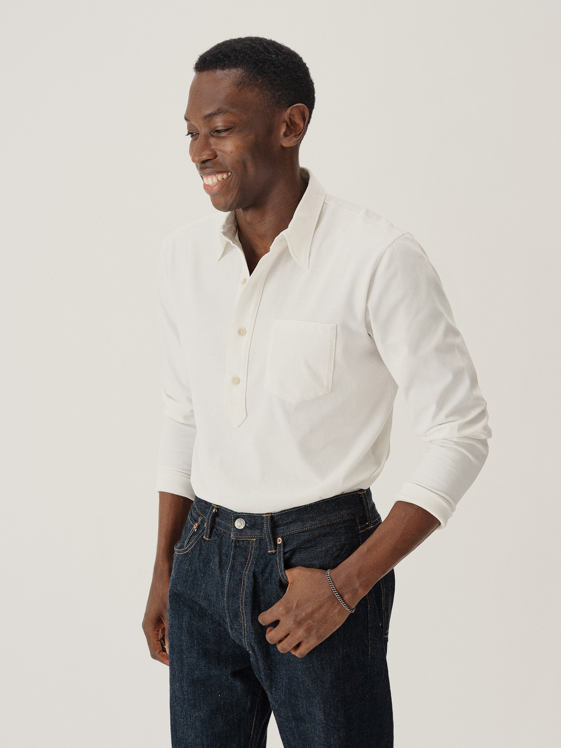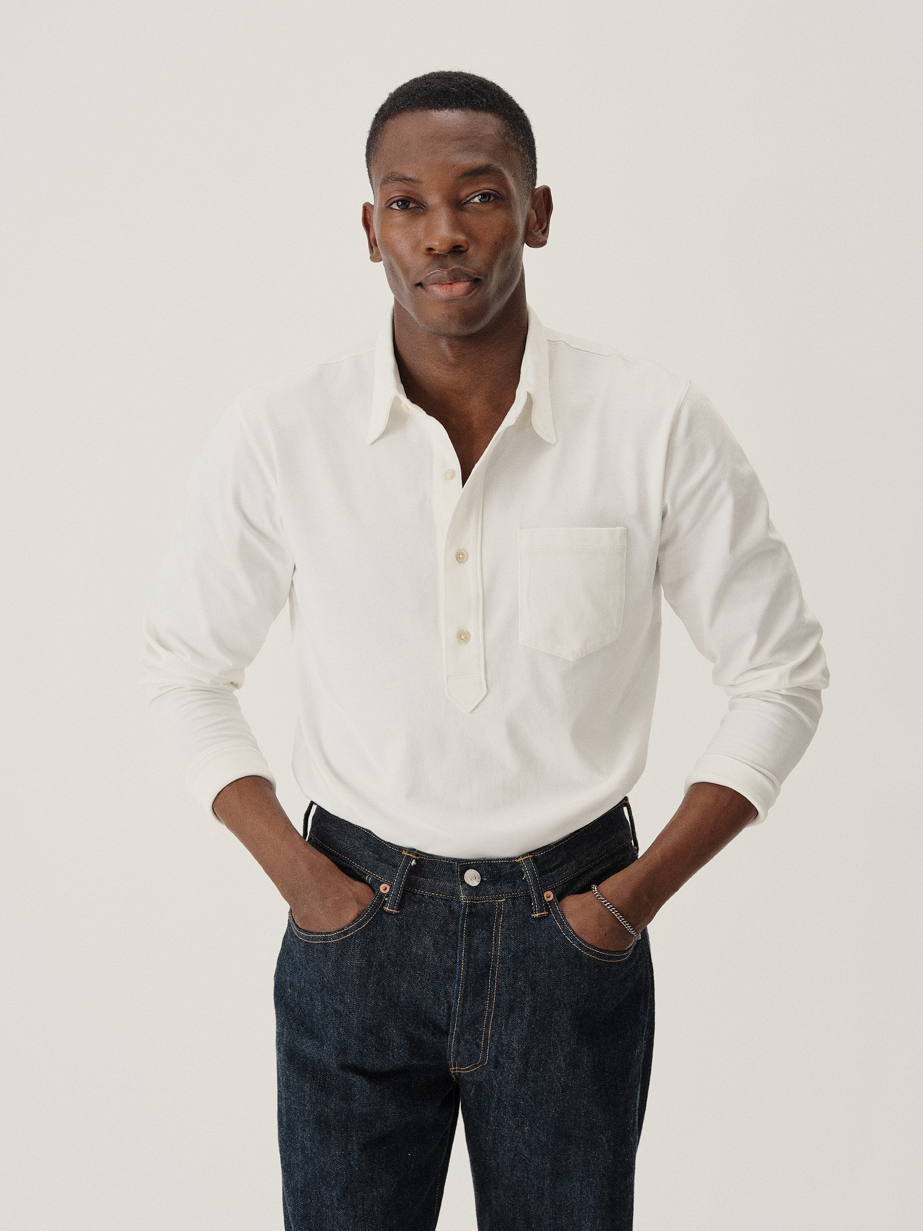 Ivy-style collared pullover shirt in a cool-to-the-touch compact cotton jersey.