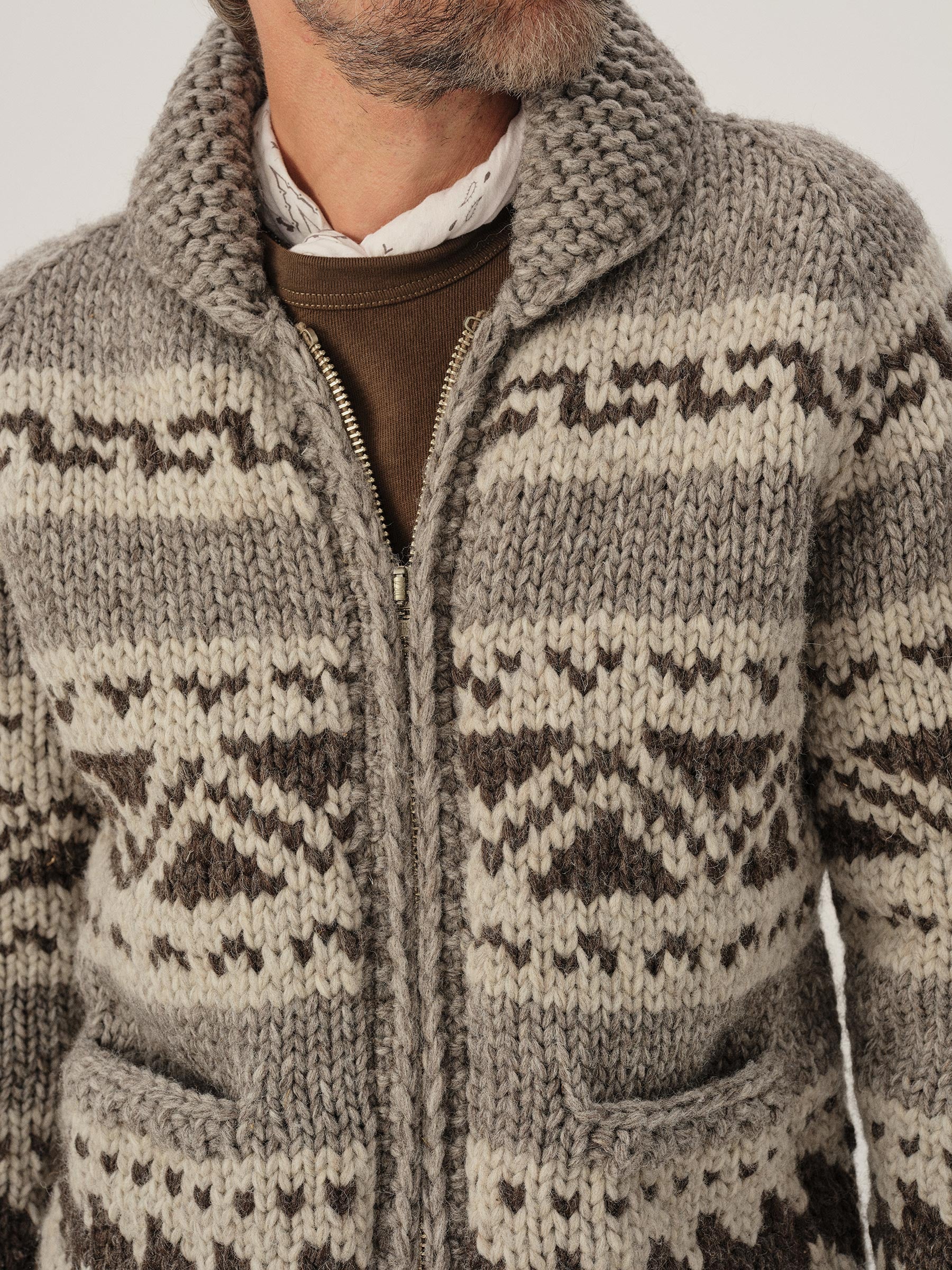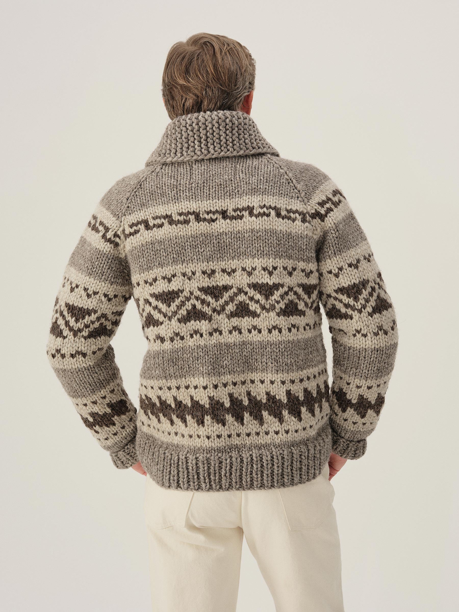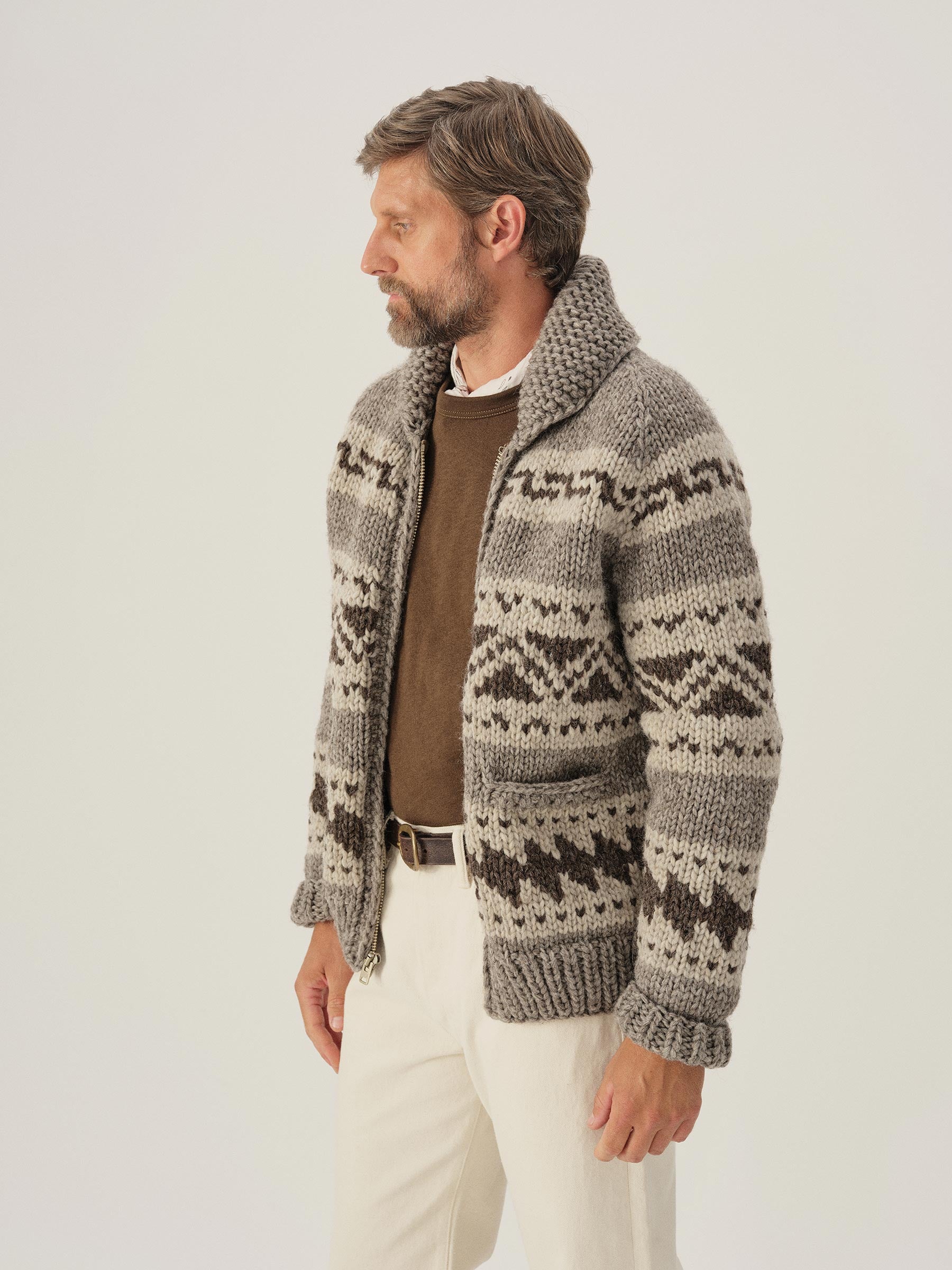 Traditional handknit wool zip cardigan made in Vancouver, BC for over a century and a half.