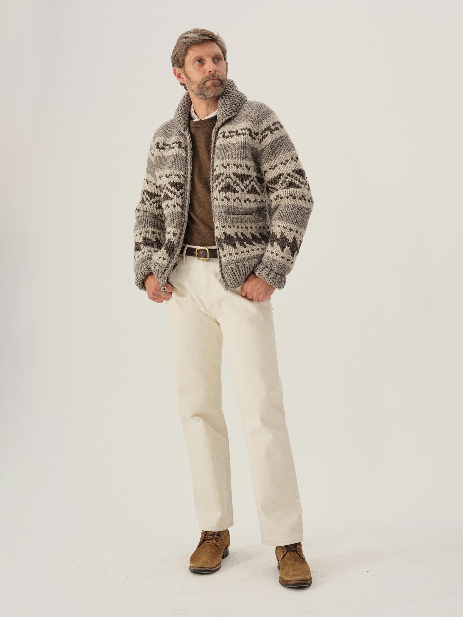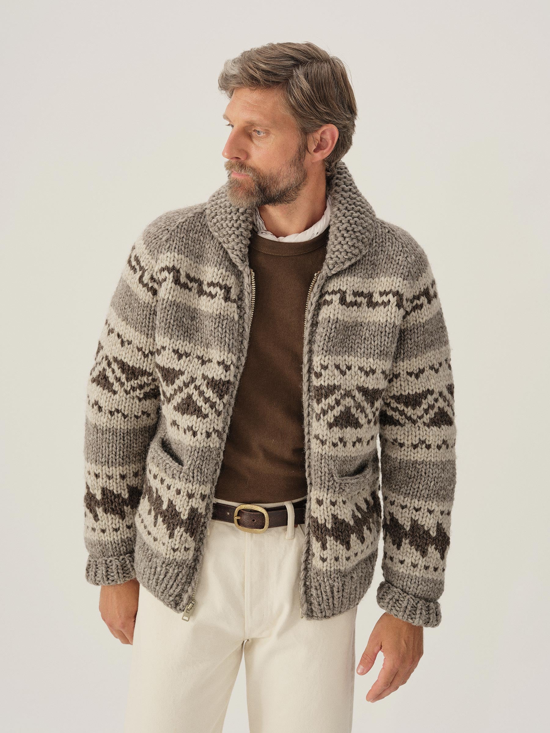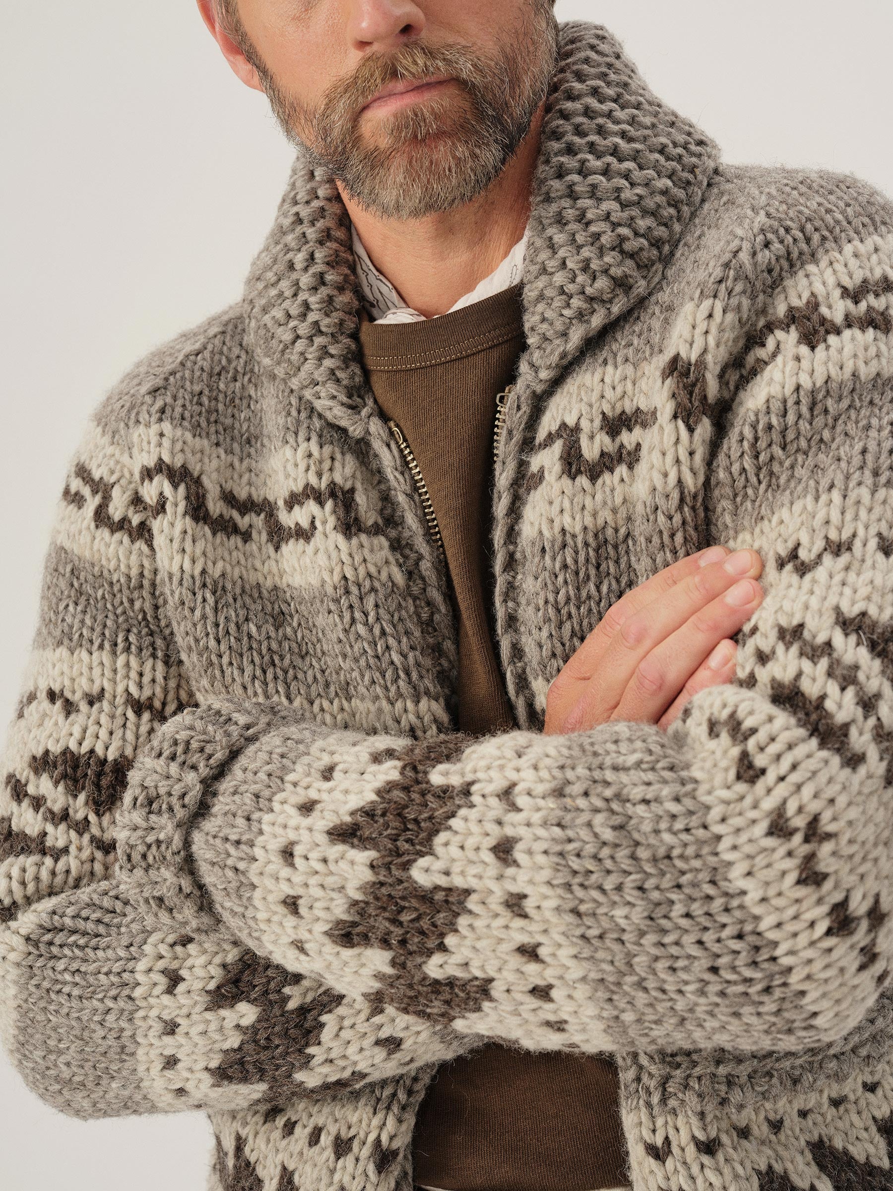 Traditional handknit wool zip cardigan made in Vancouver, BC for over a century and a half.