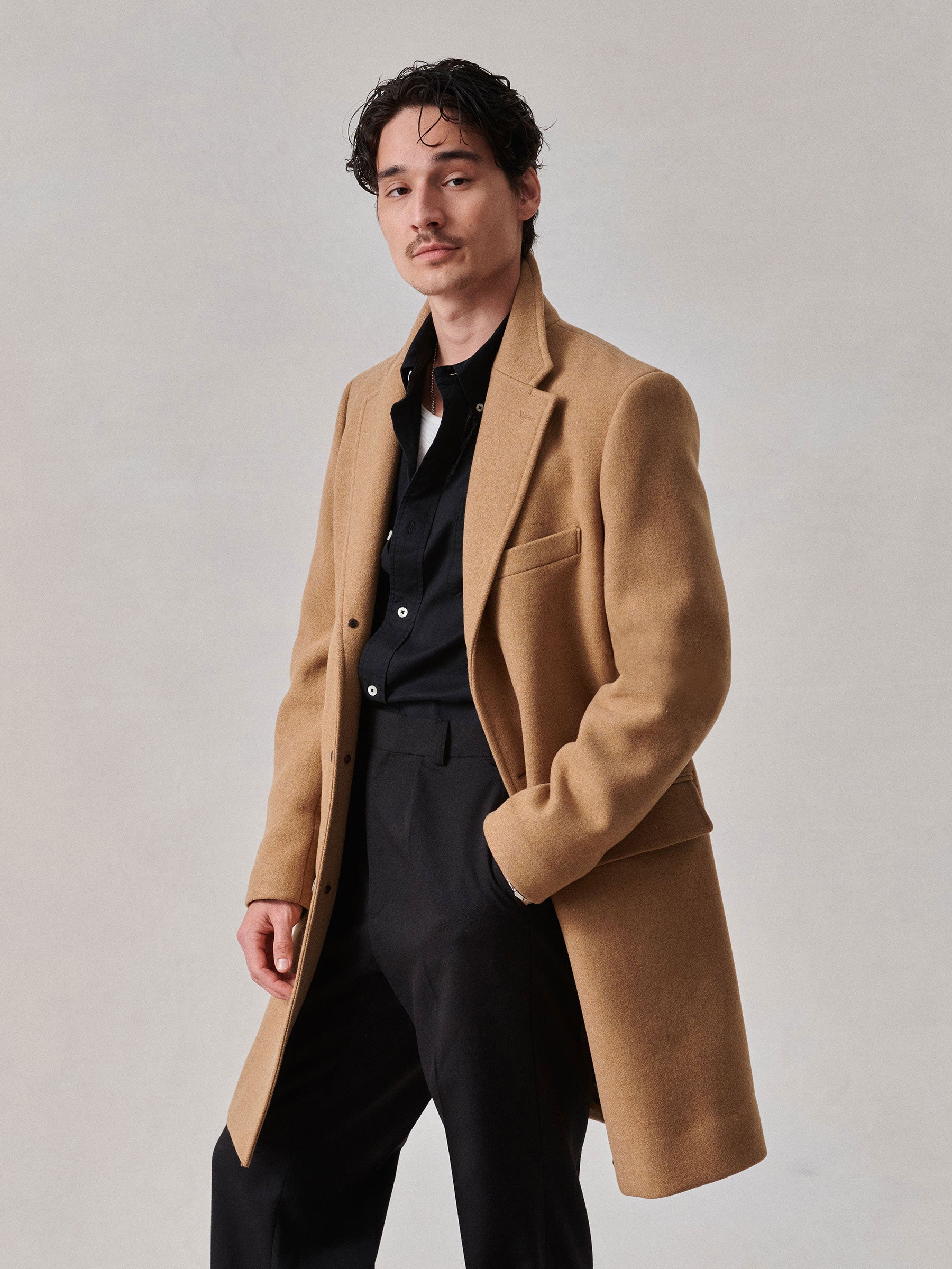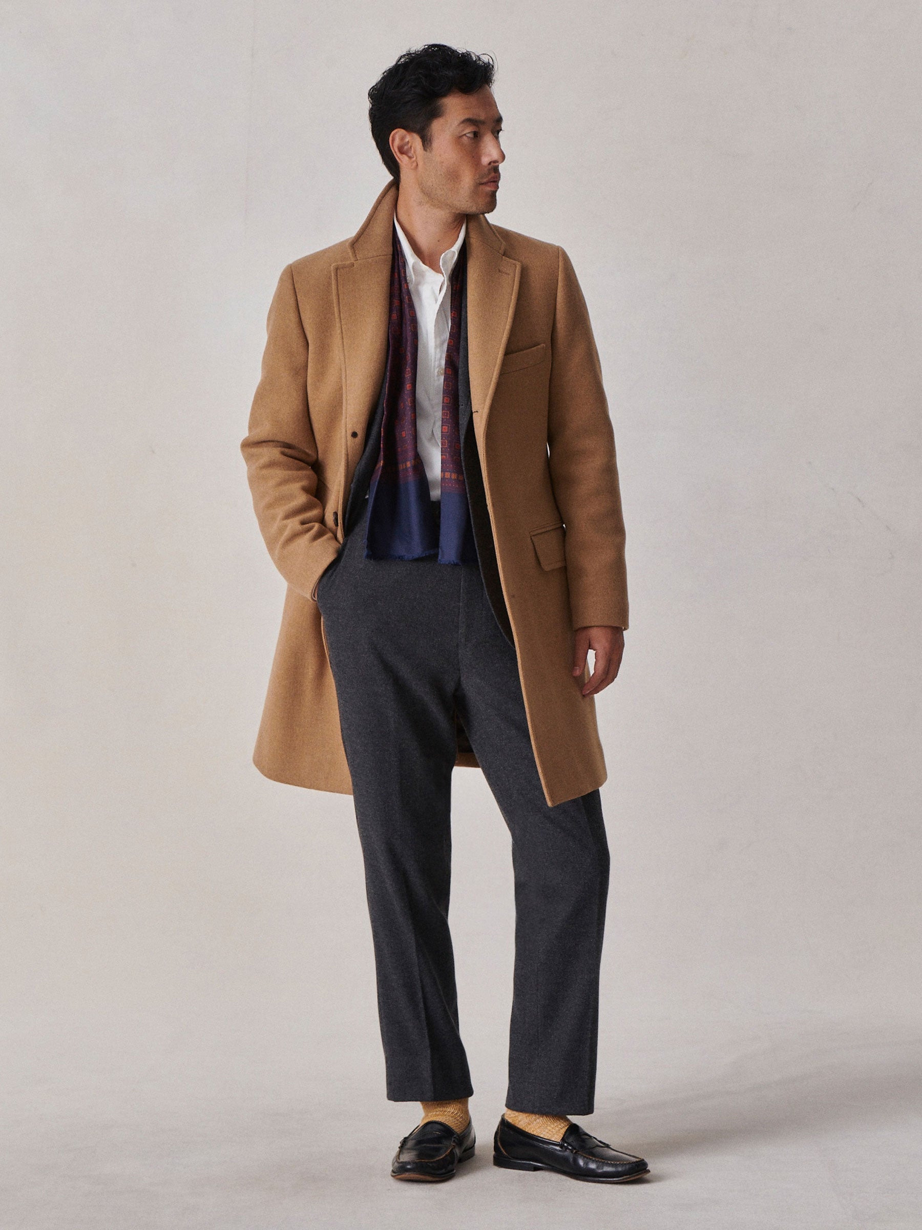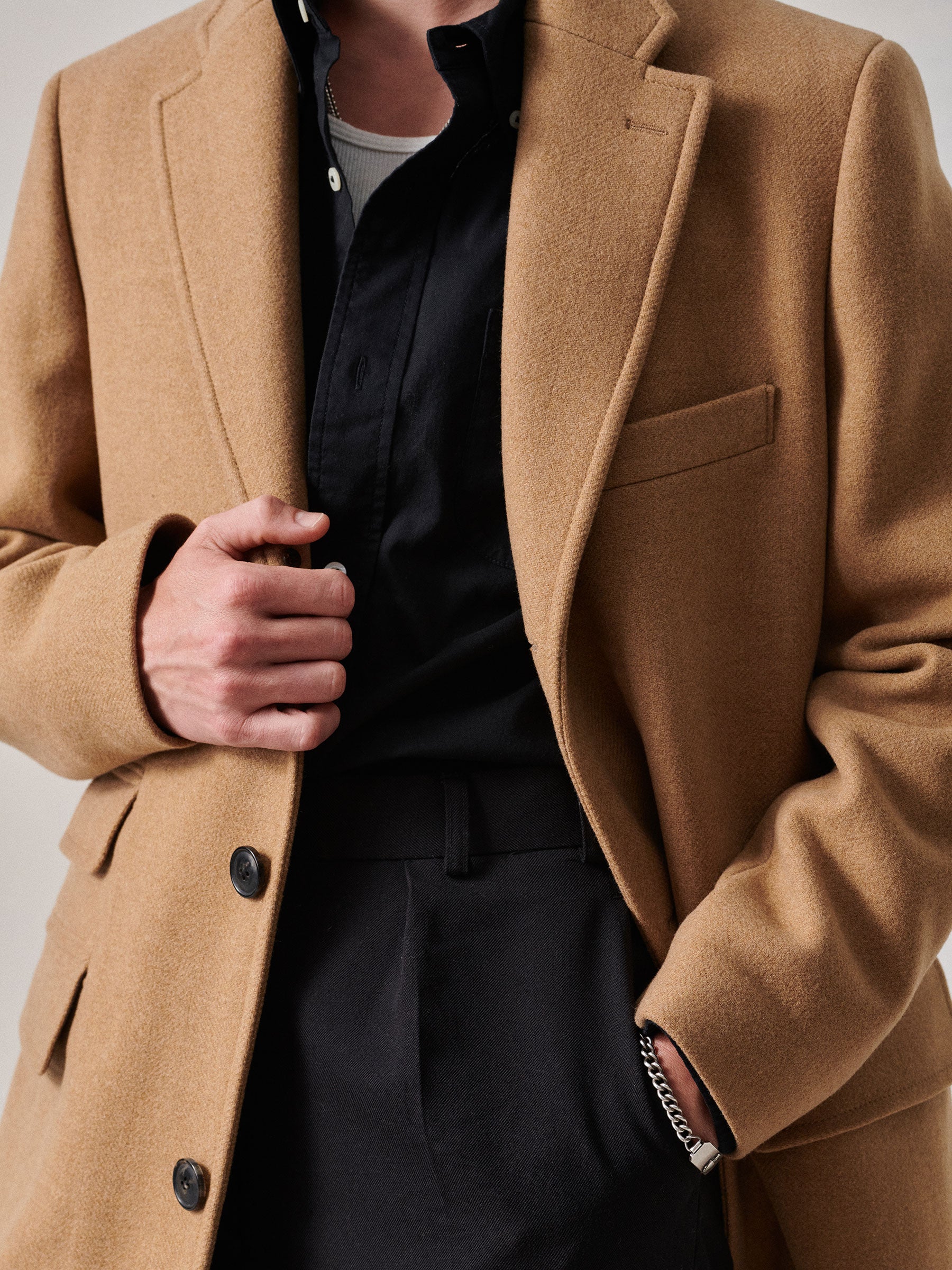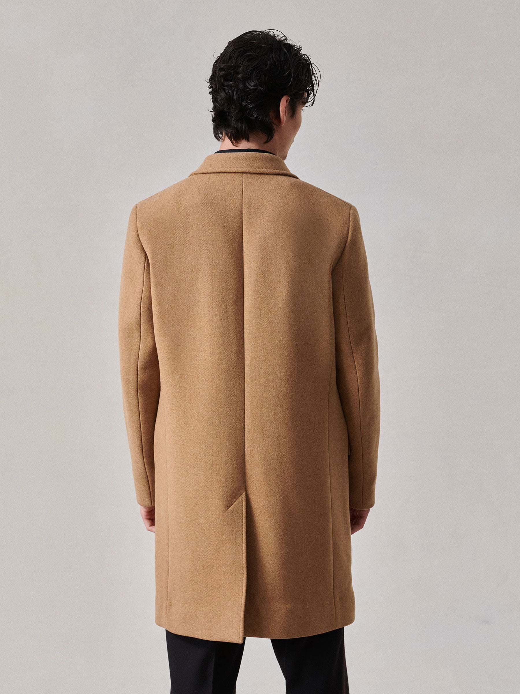 Classic fit, fully lined half canvas topcoat cut from 13 oz. Italian double-faced wool.
