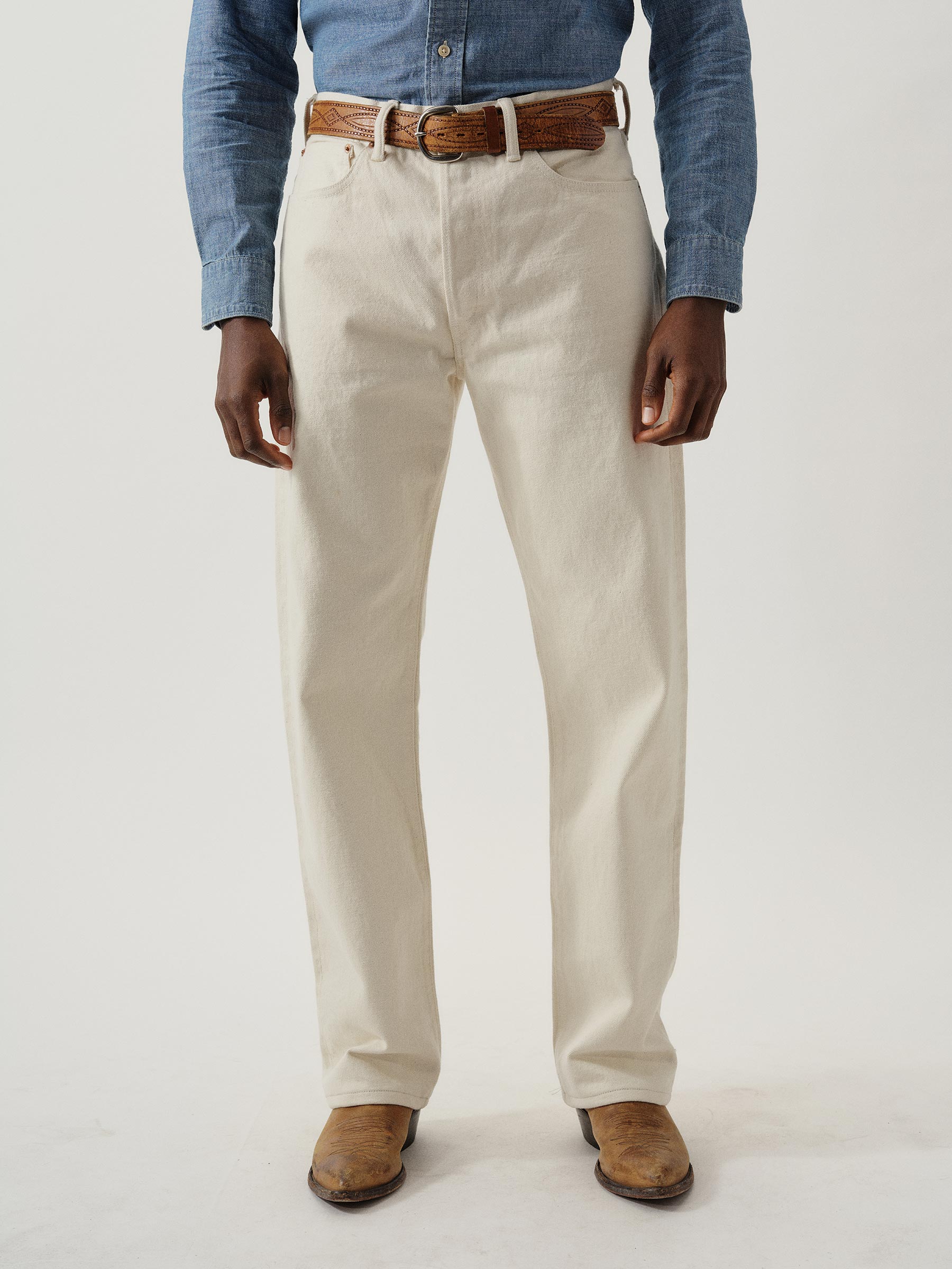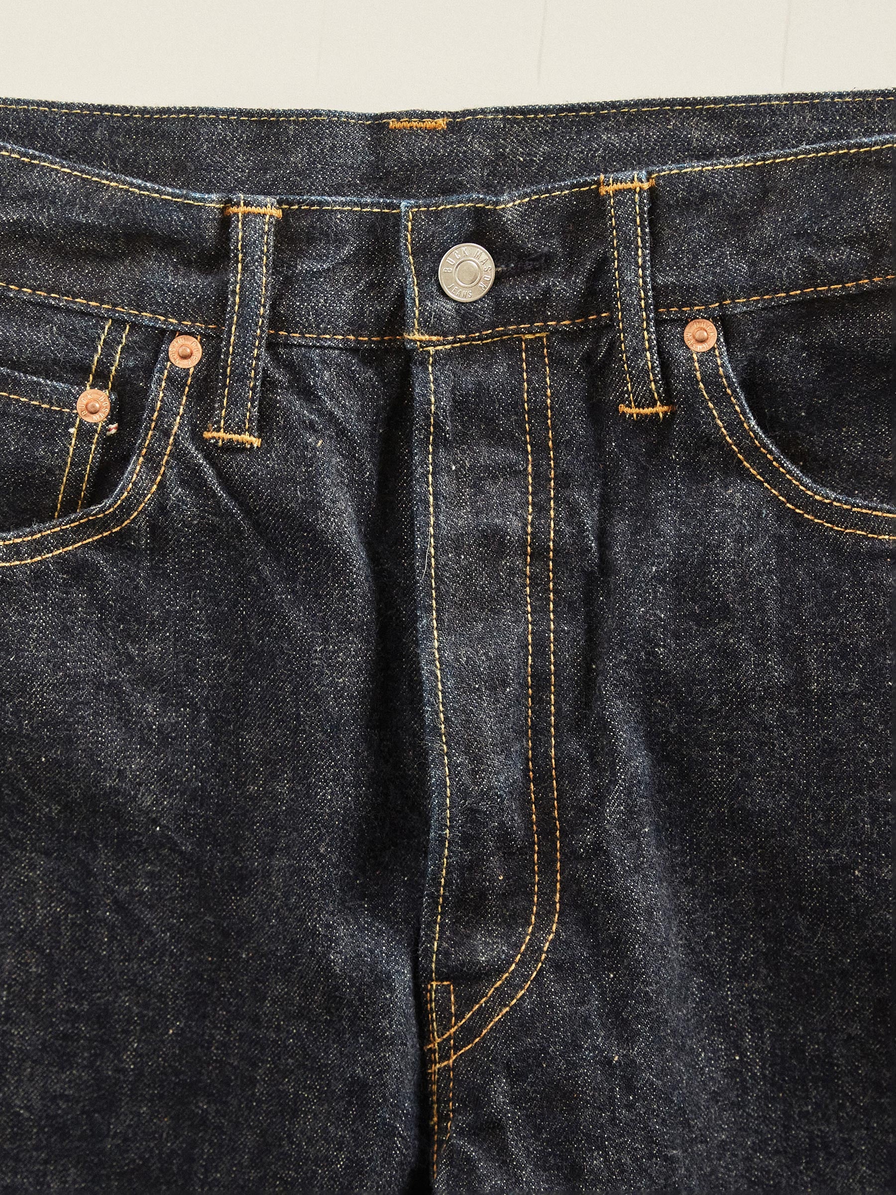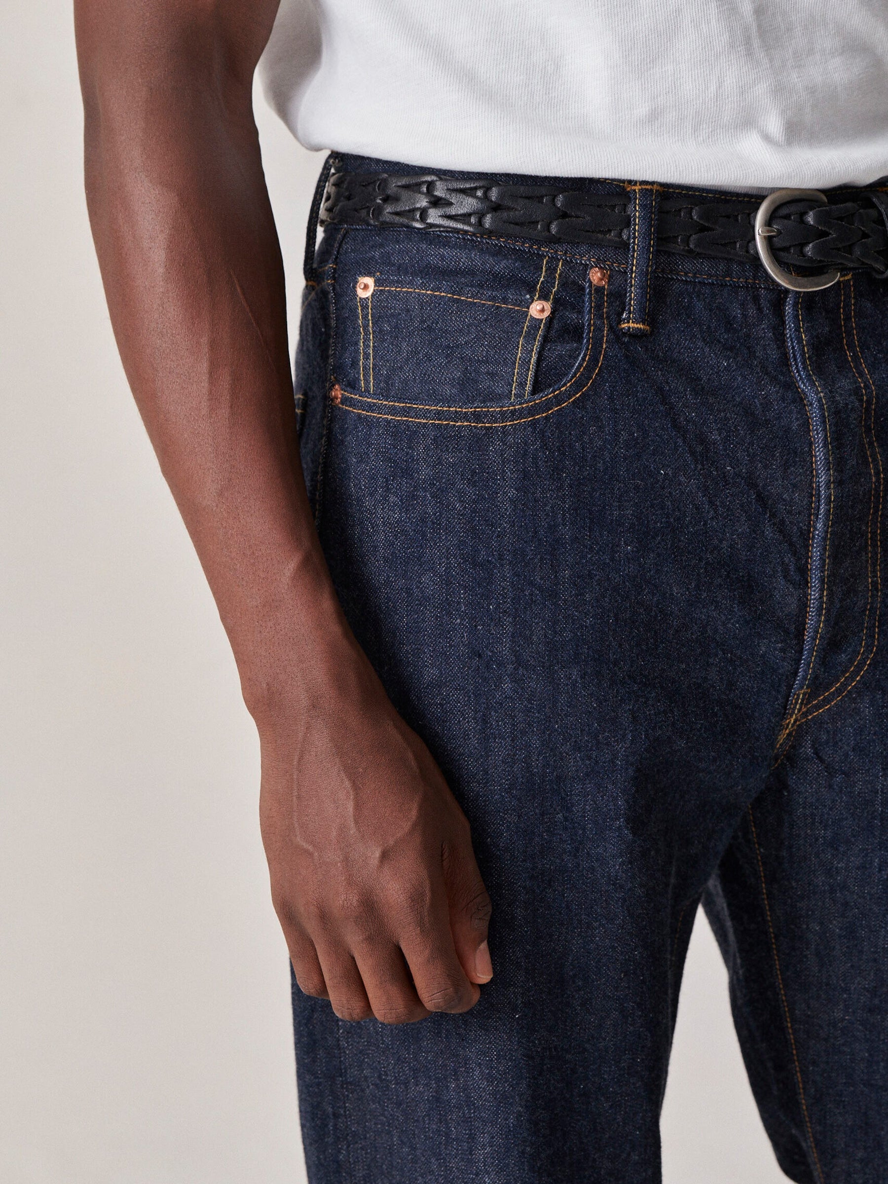 Vintage-inspired, unsanforized selvedge denim in a higher rise with a straight fit through the thigh and leg. Button fly. Washed to control shrinkage.