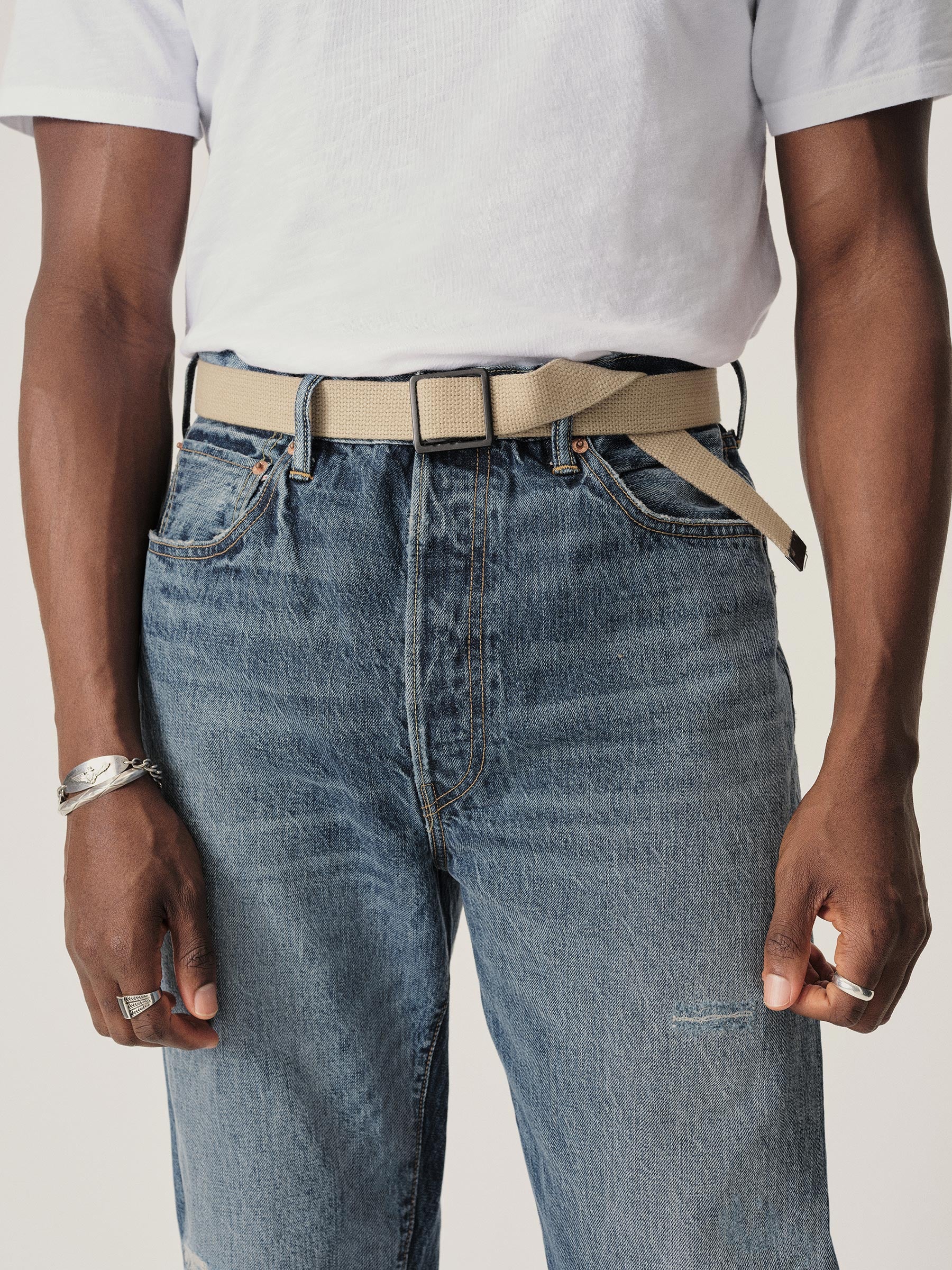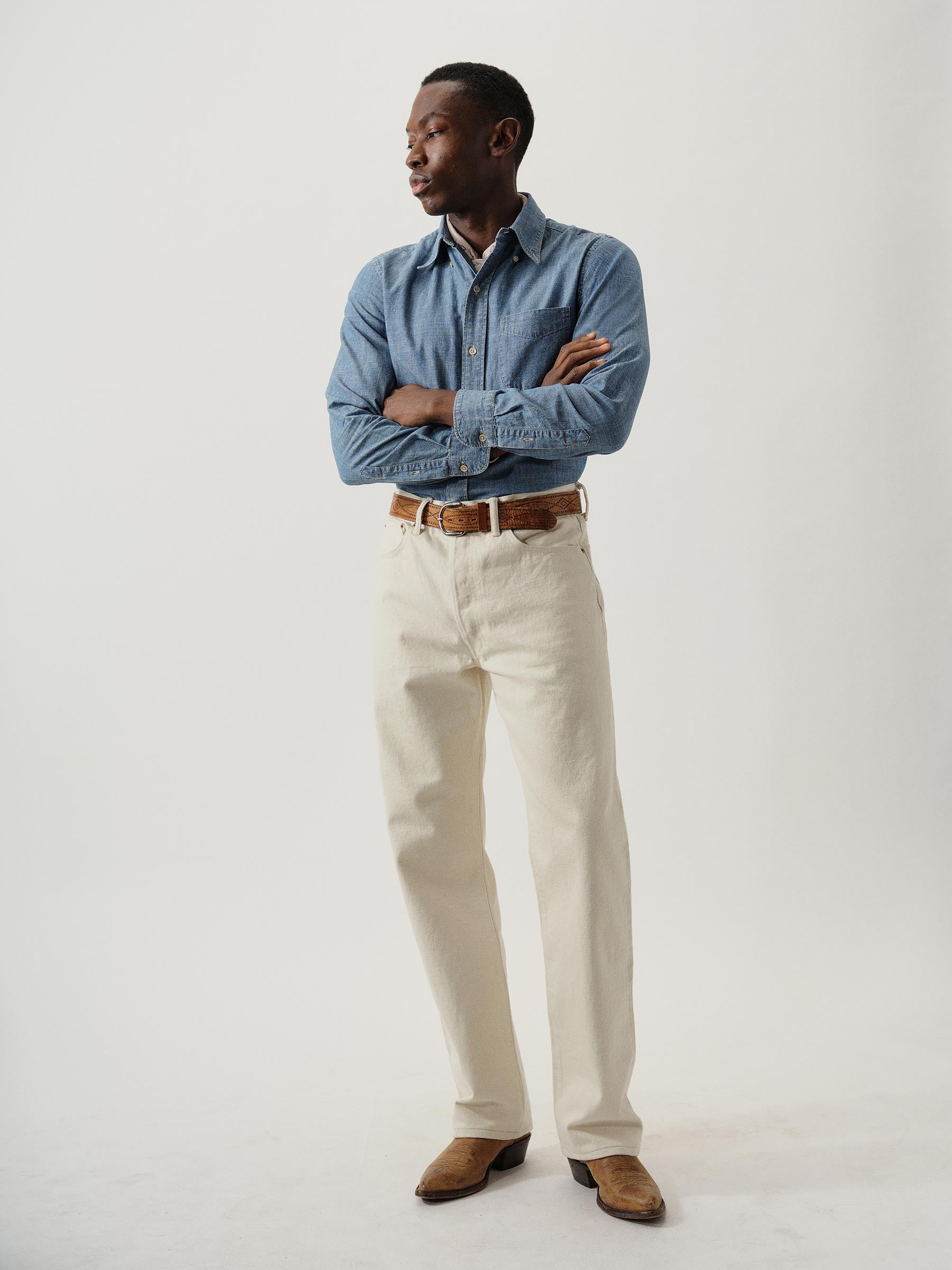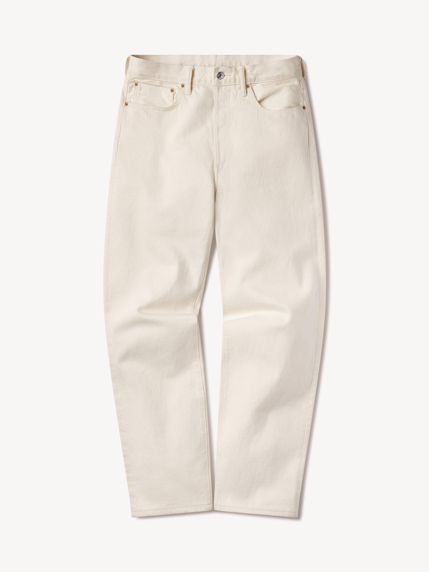Vintage-inspired, unsanforized selvedge denim in a higher rise with a straight fit through the thigh and leg. Button fly. Washed to control shrinkage.