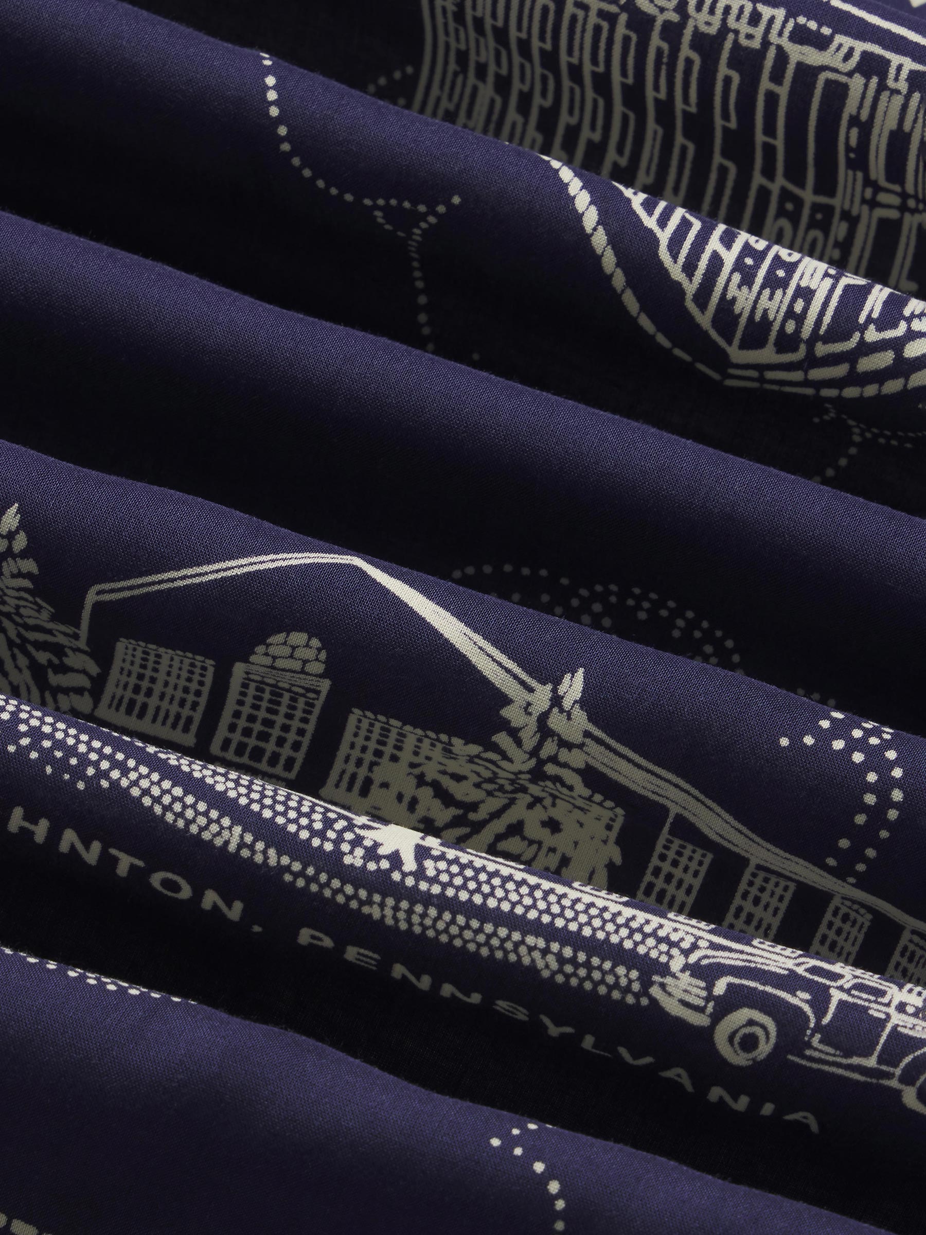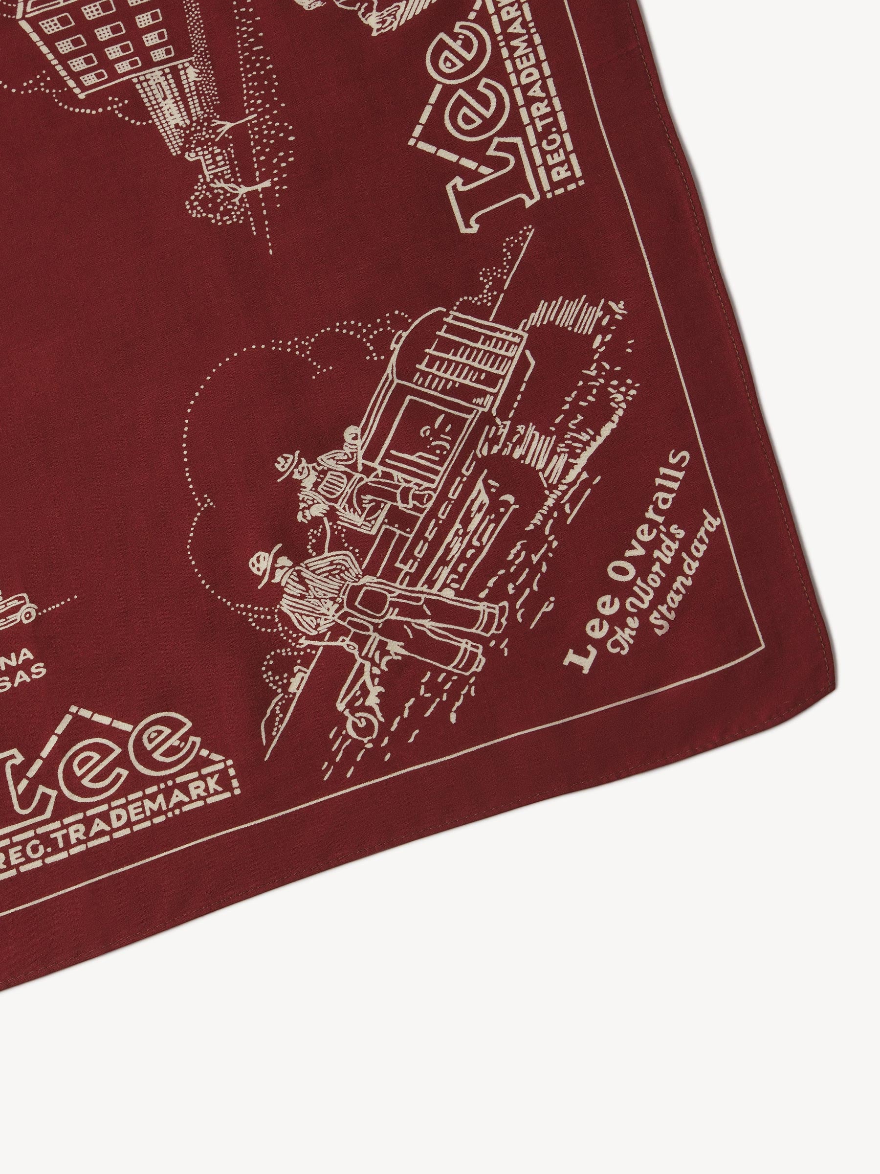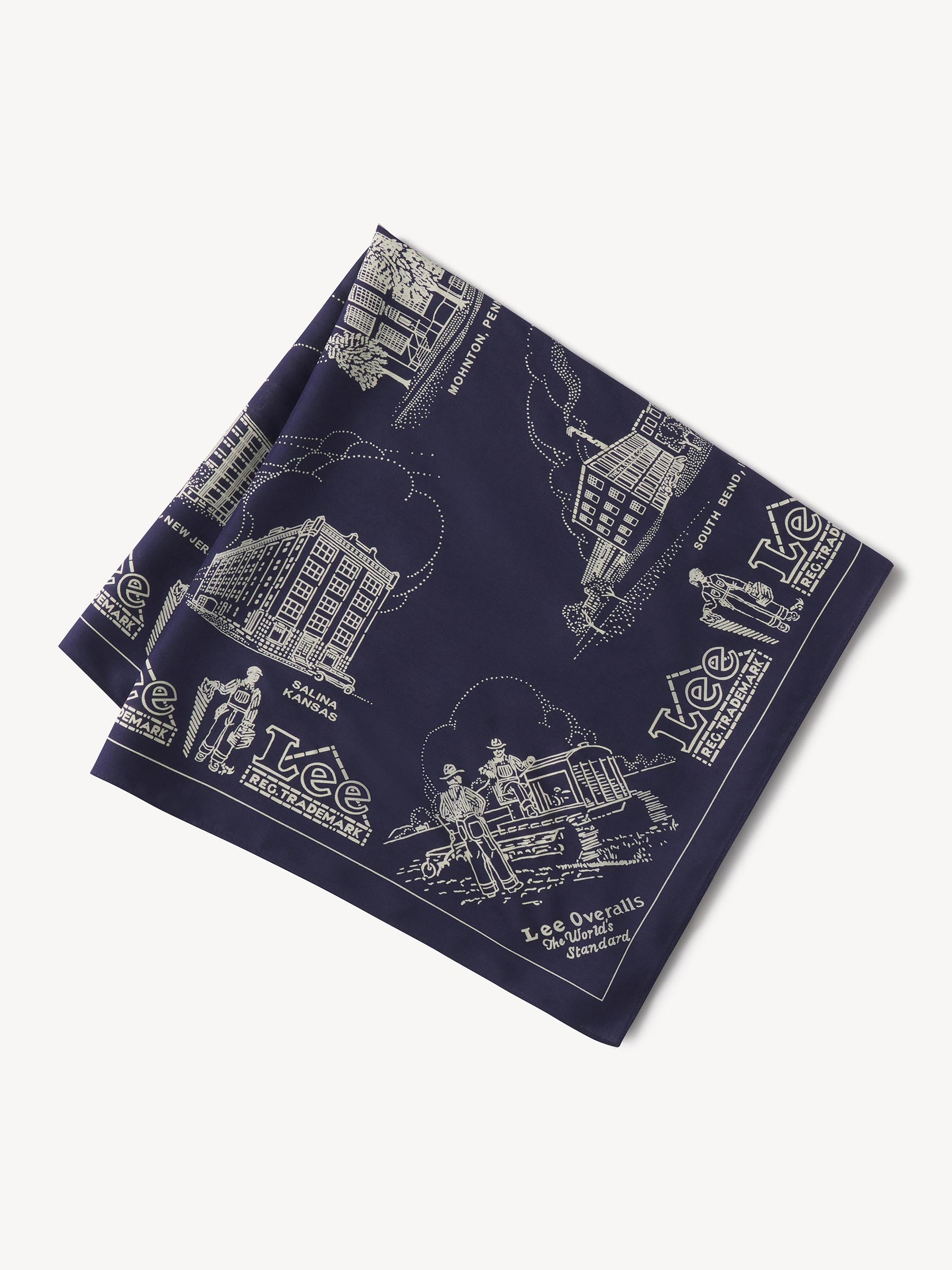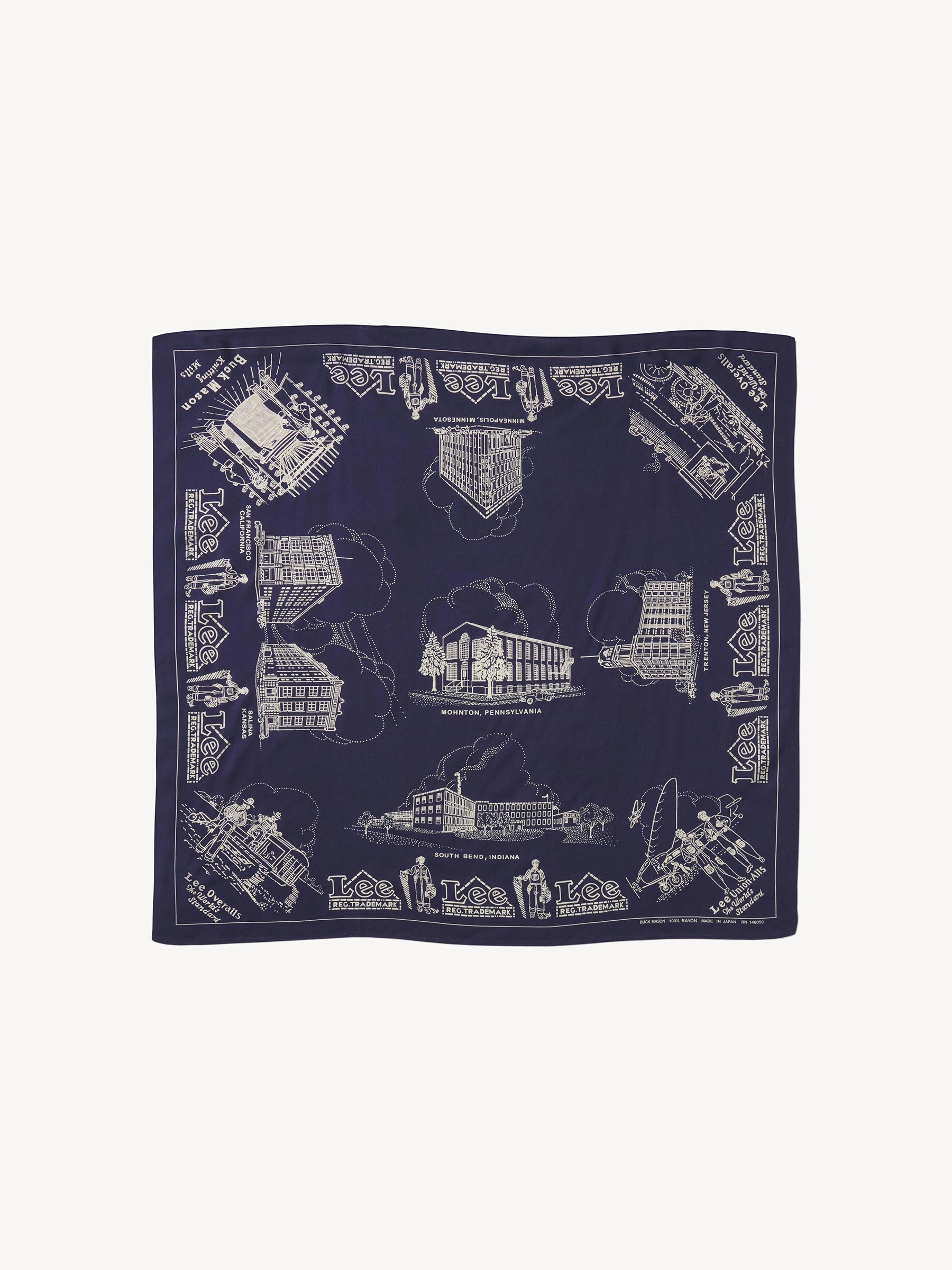Japanese rayon bandana depicting Buck Mason Knitting Mills and the original Lee factories.
