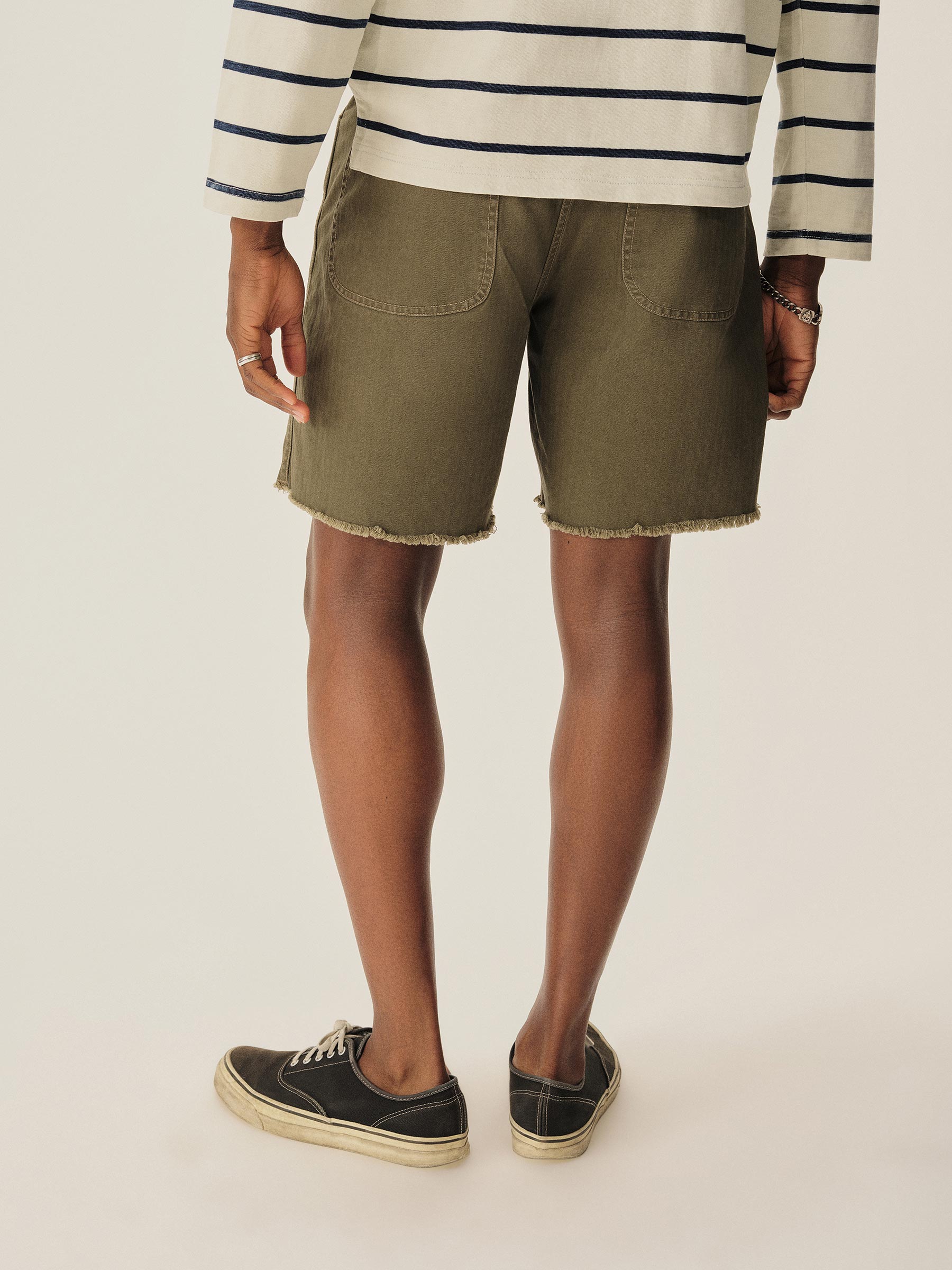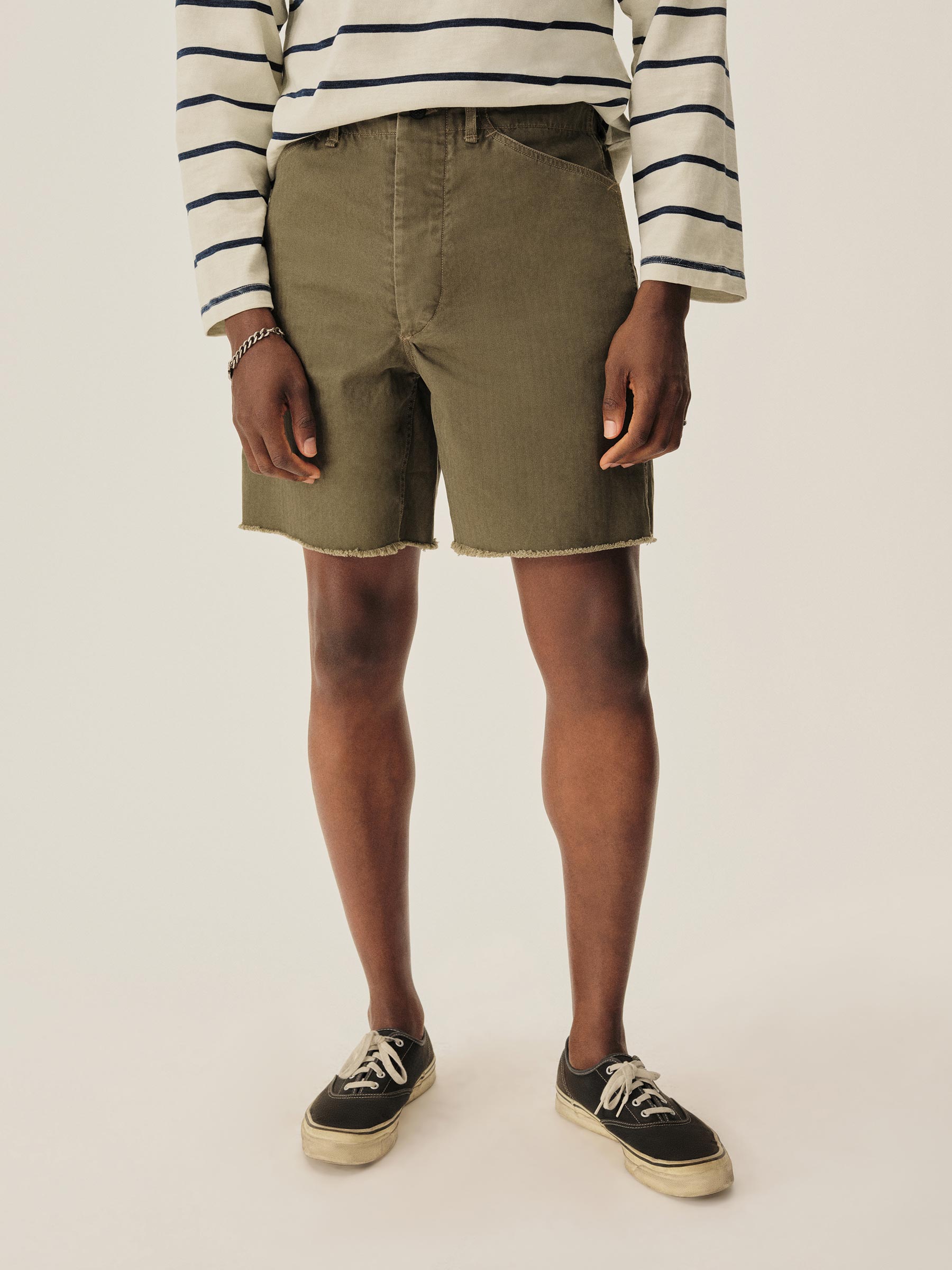 A faithful rendition of WW2-era military style cut-offs in a washed cotton herringbone twill.