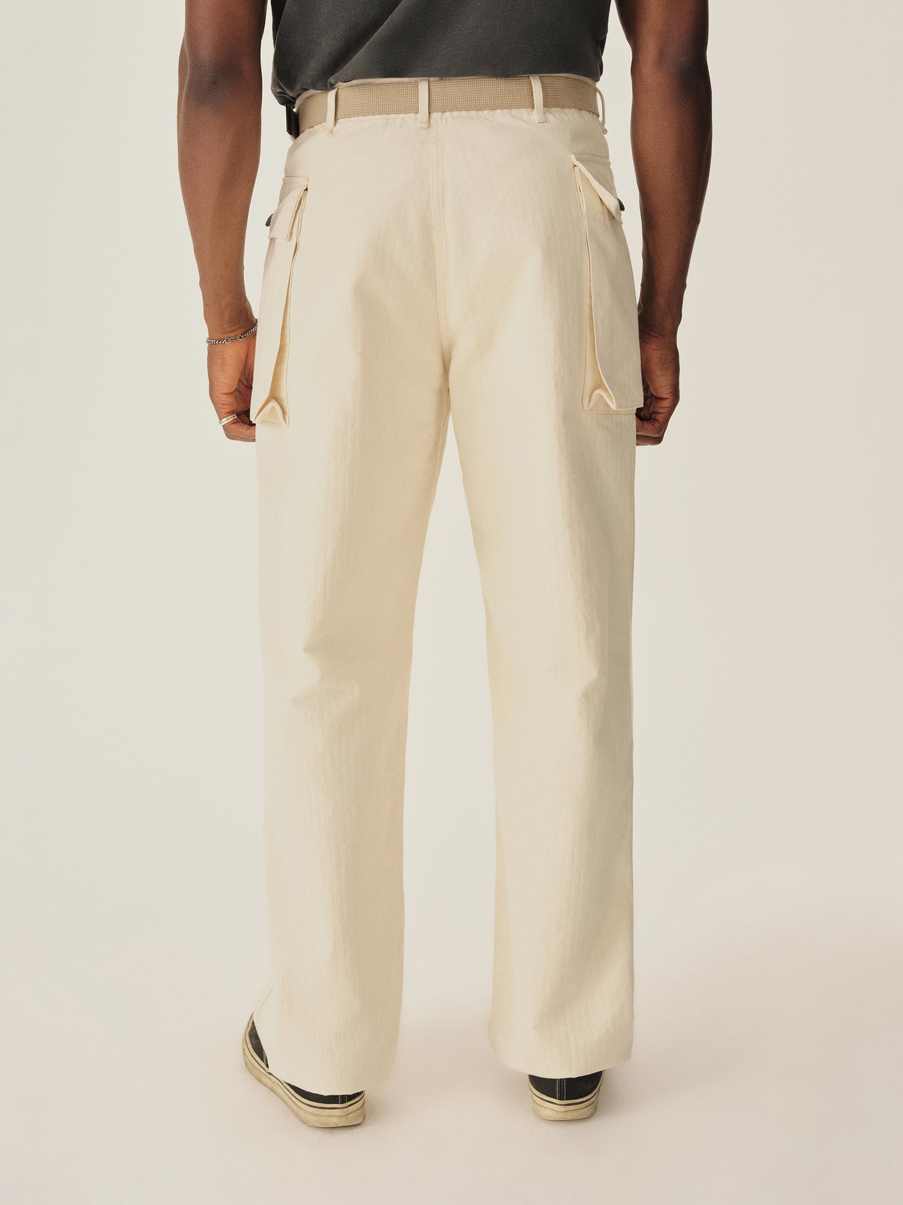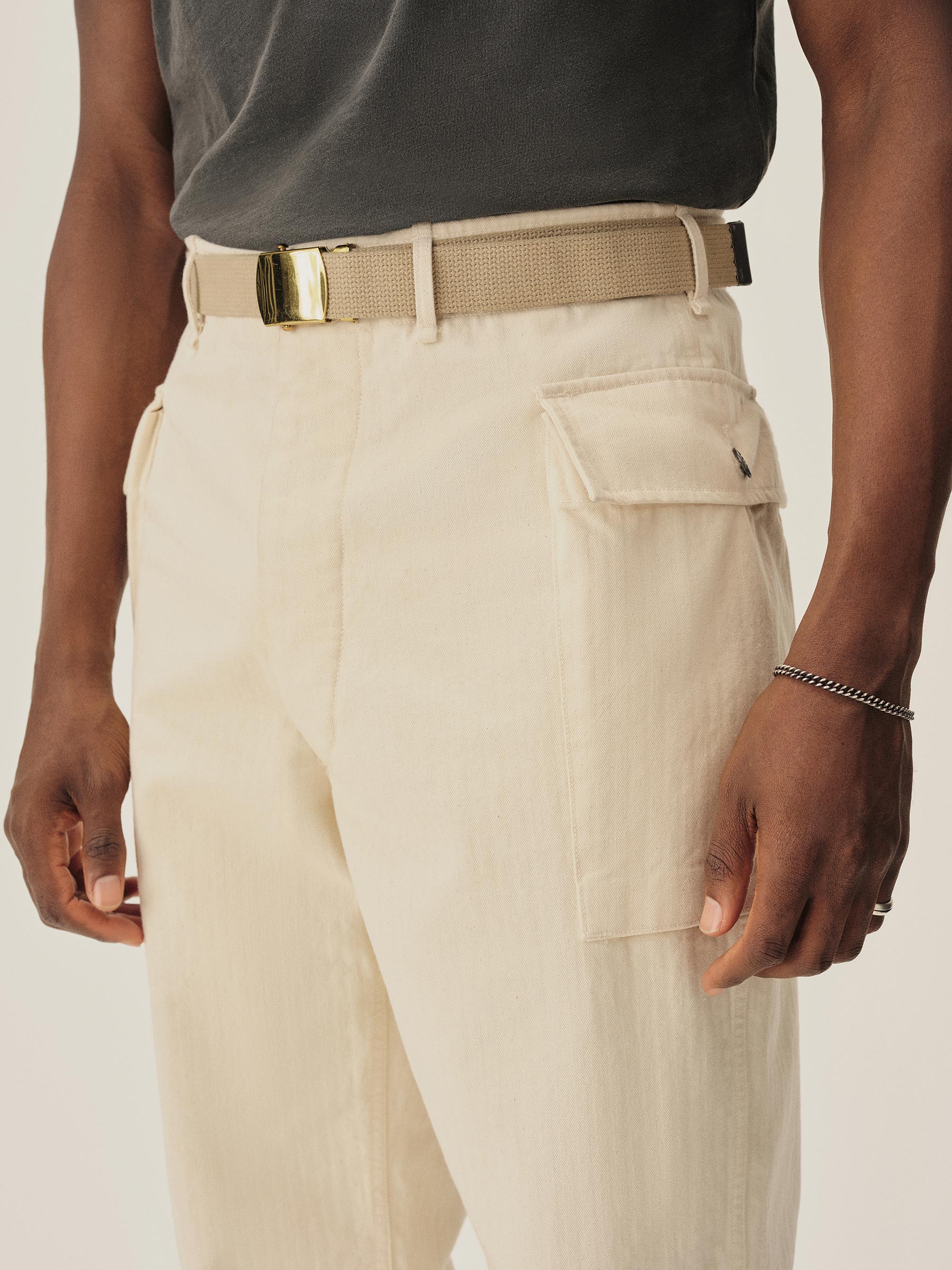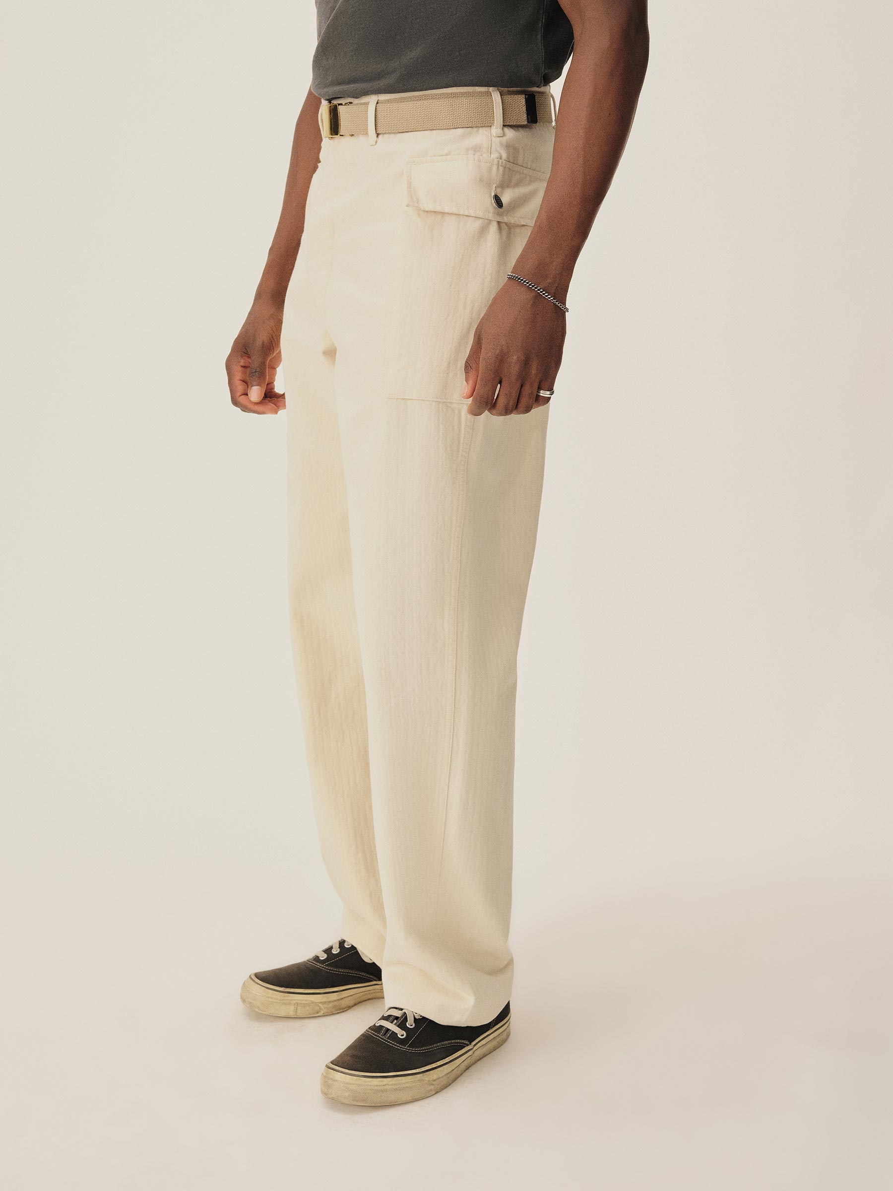A WW2-era style fatigue pant with two large cargo pockets, cut from lightweight herringbone twill cotton.