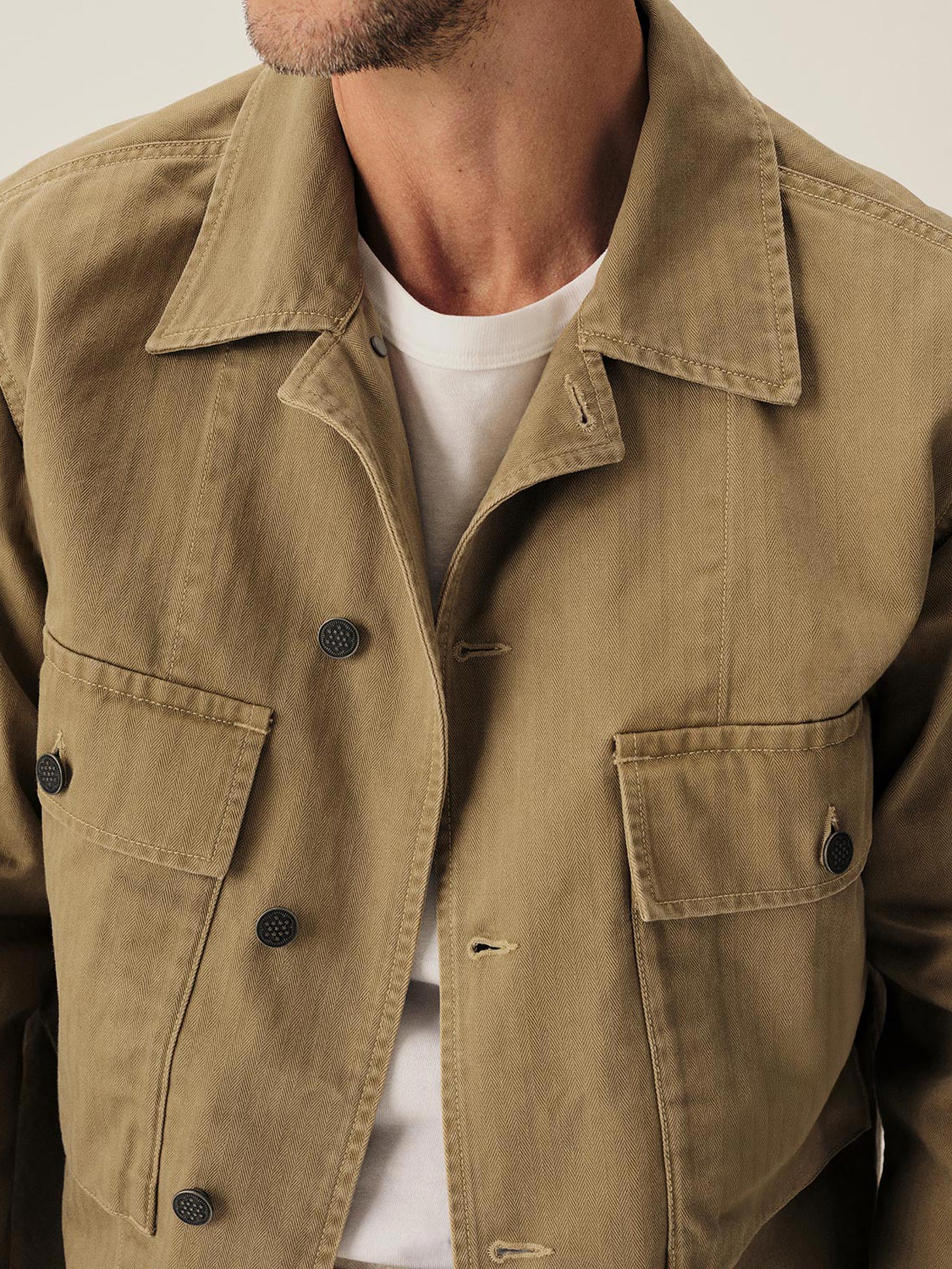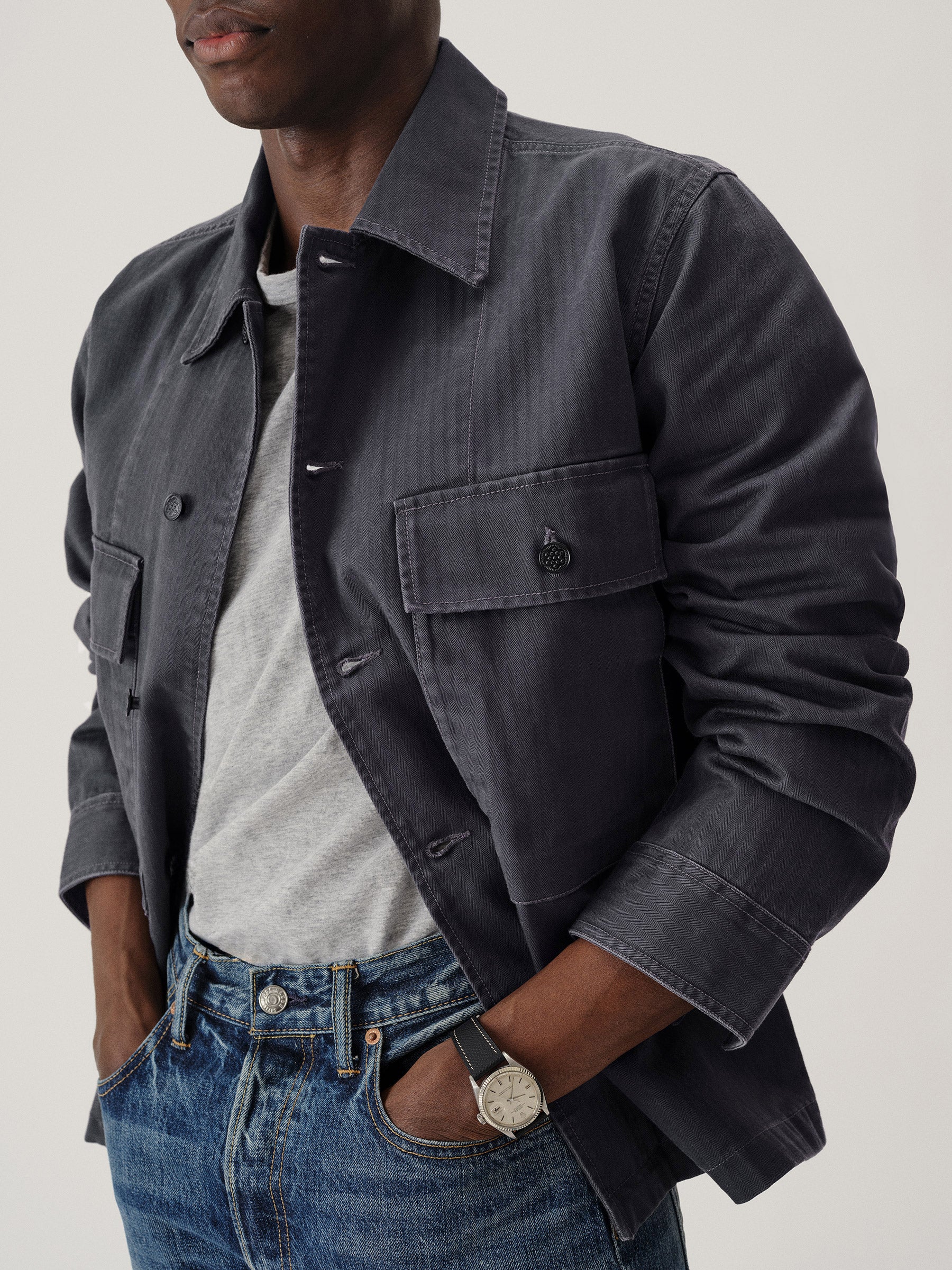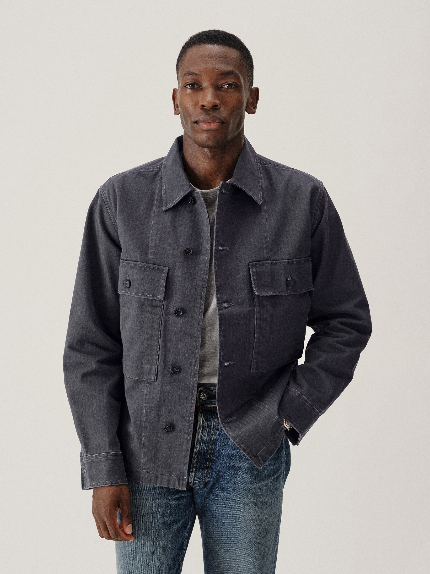 A faithful rendition of an early WW2-era military fatigue shirt in a washed cotton herringbone twill.