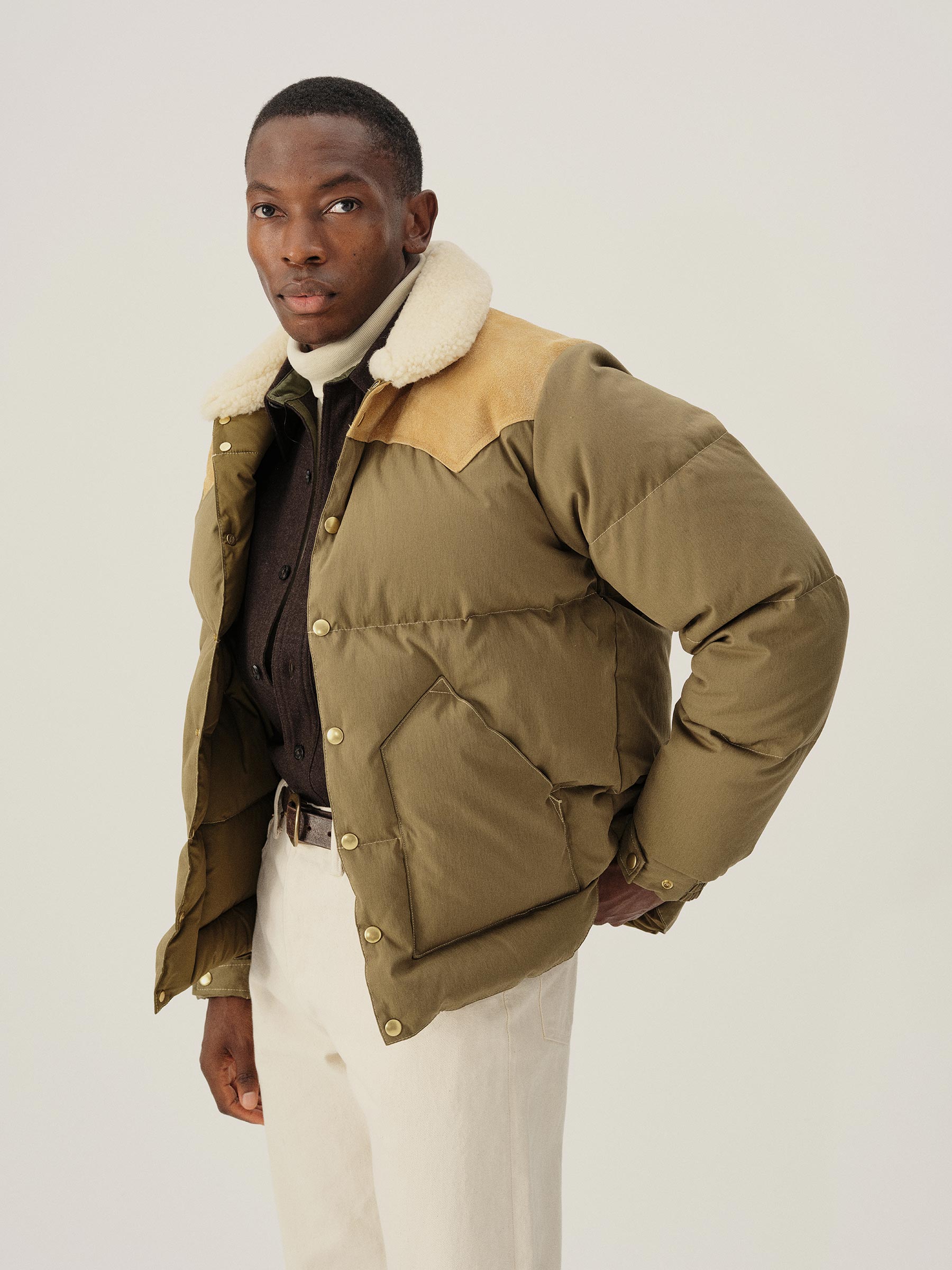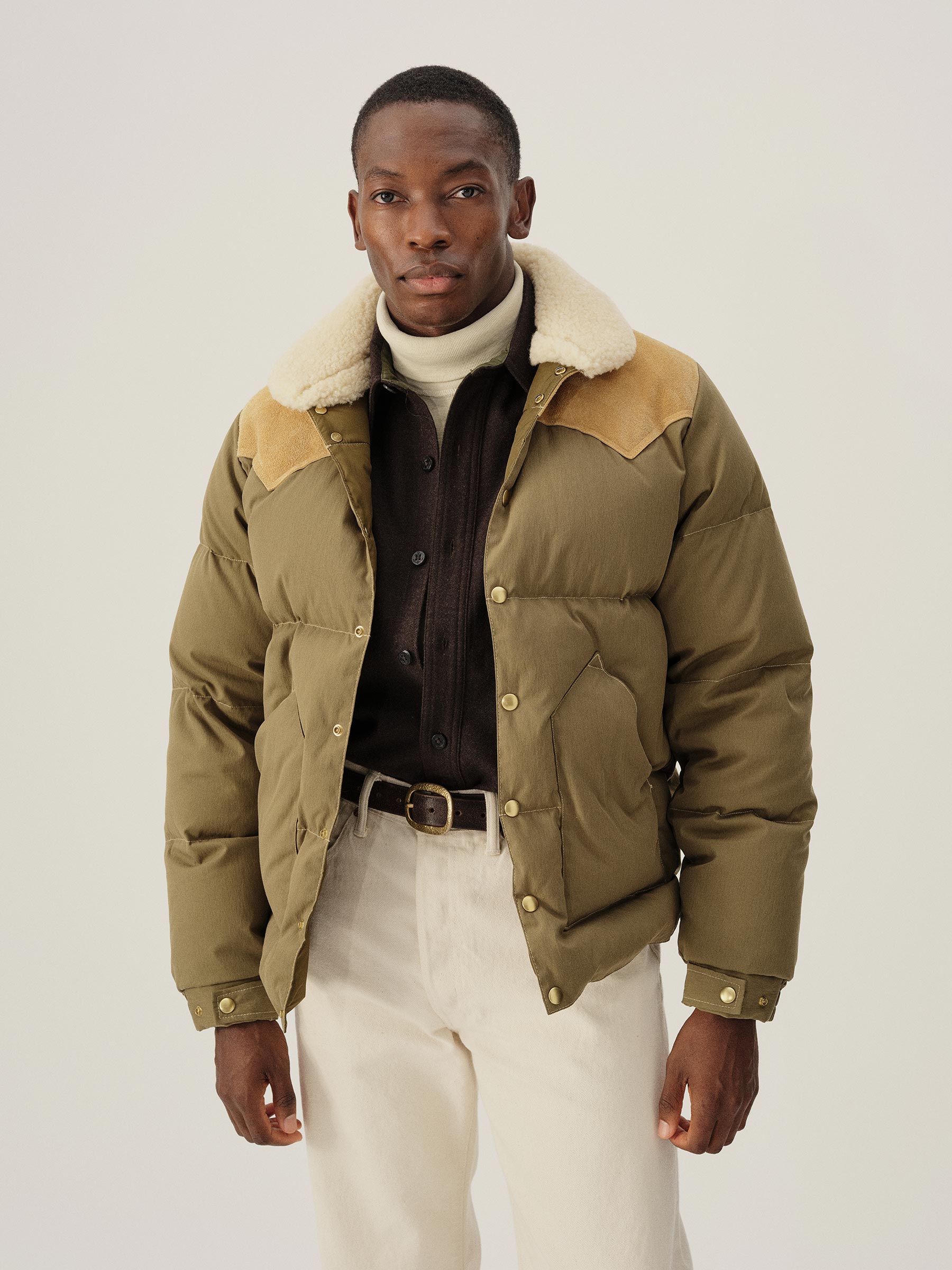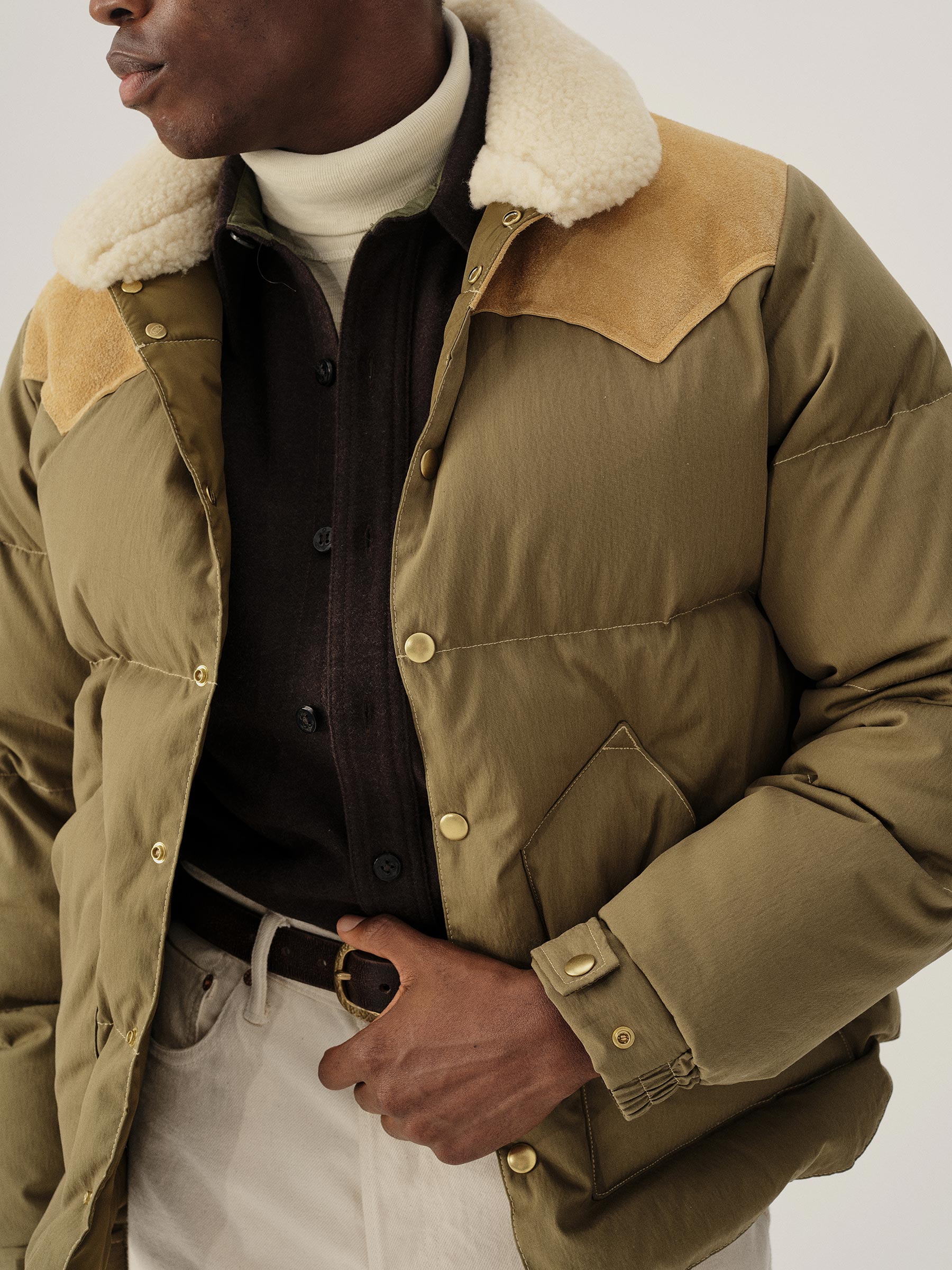 A vintage inspired, Rocky Mountain Featherbed western down fill jacket recut in a military repro, 65% cotton, 35% nylon poplin with a matte finish and an authentic shearling collar.