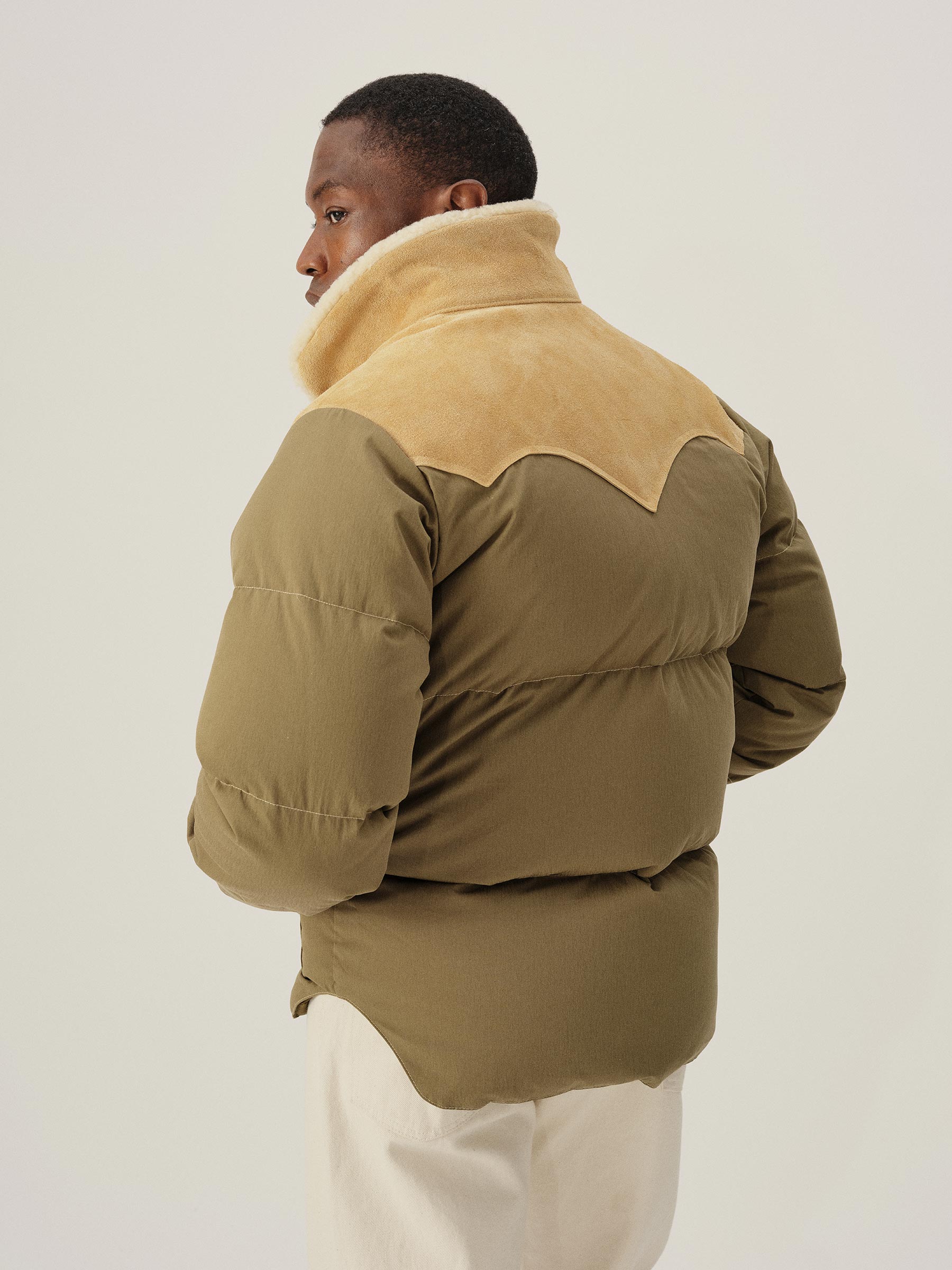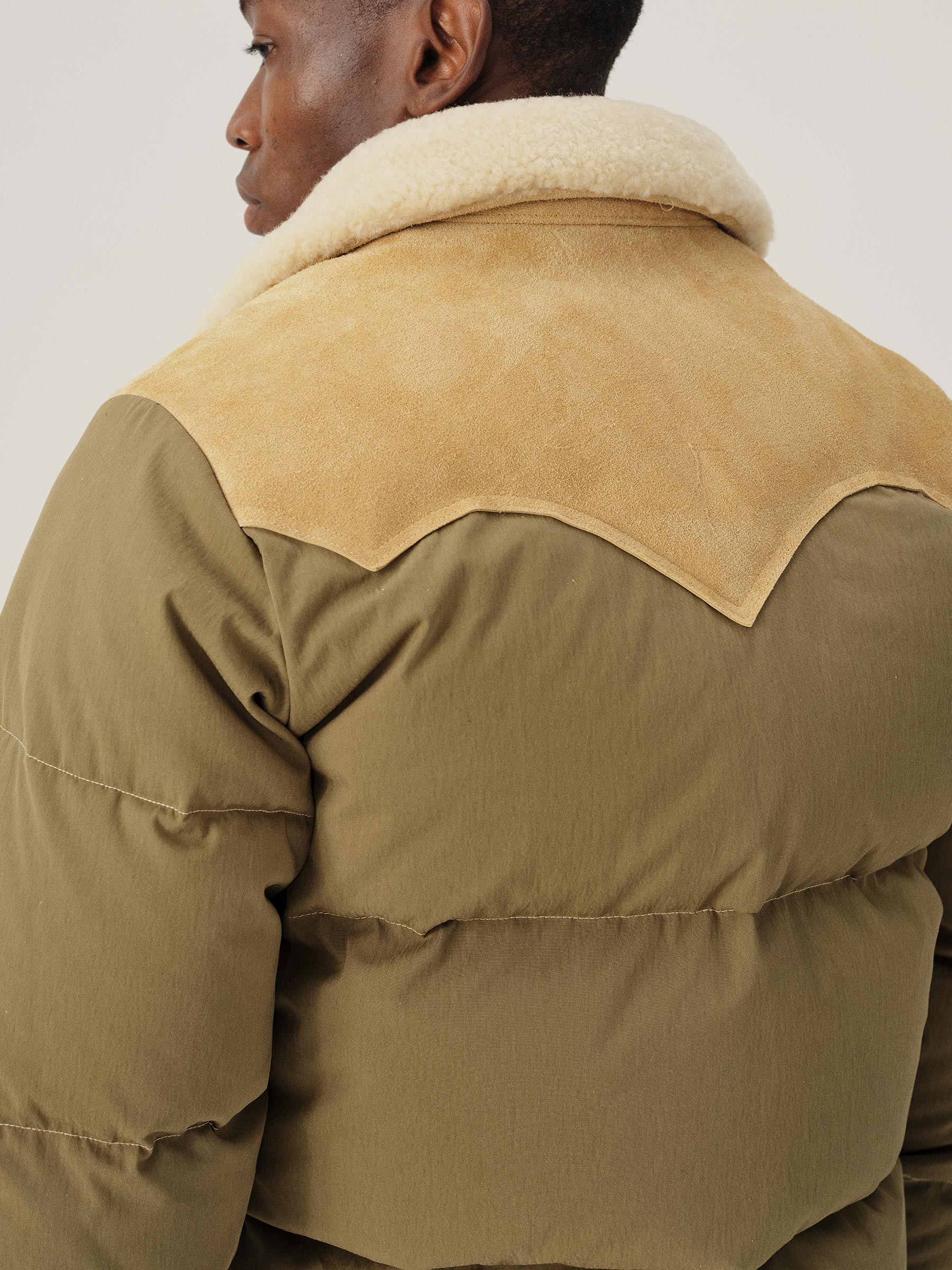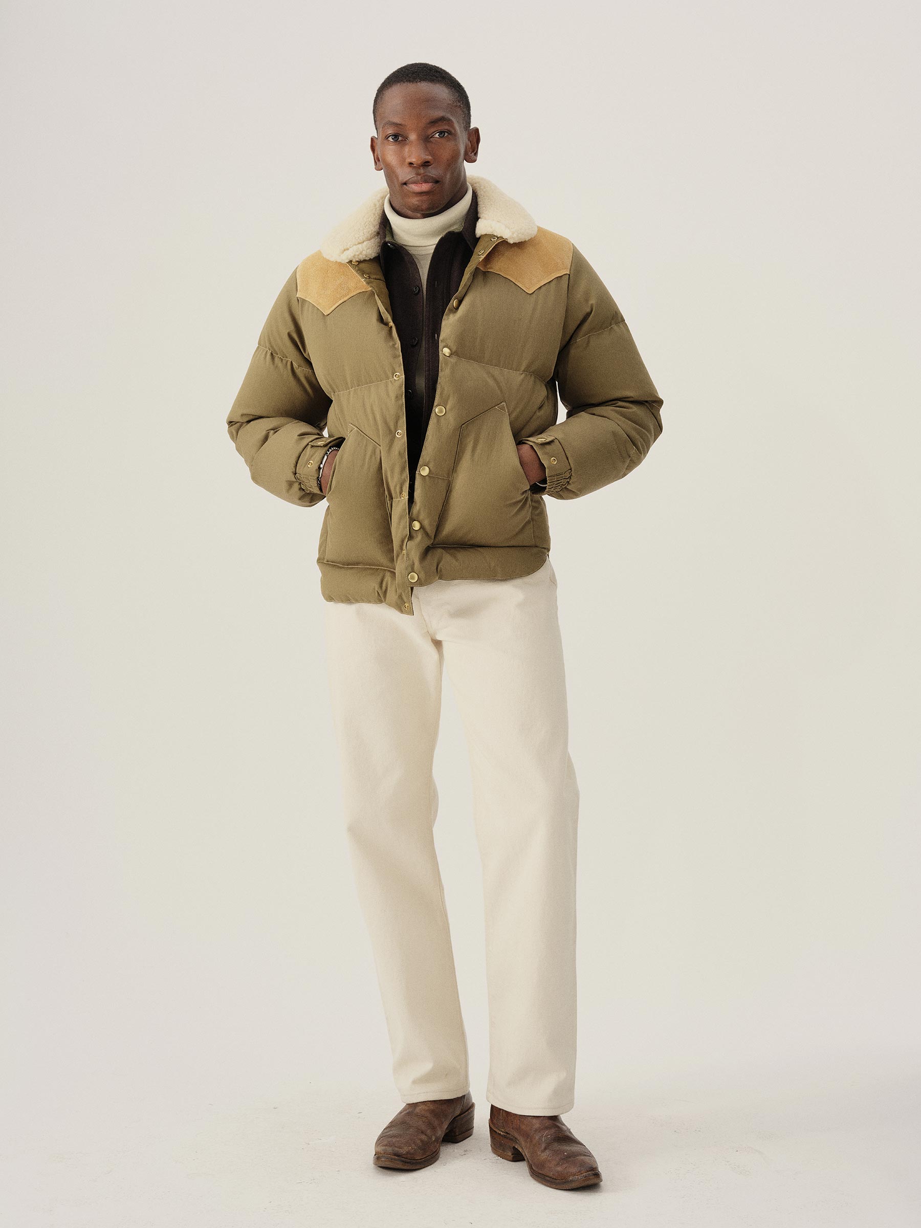 A vintage inspired, Rocky Mountain Featherbed western down fill jacket recut in a military repro, 65% cotton, 35% nylon poplin with a matte finish and an authentic shearling collar.