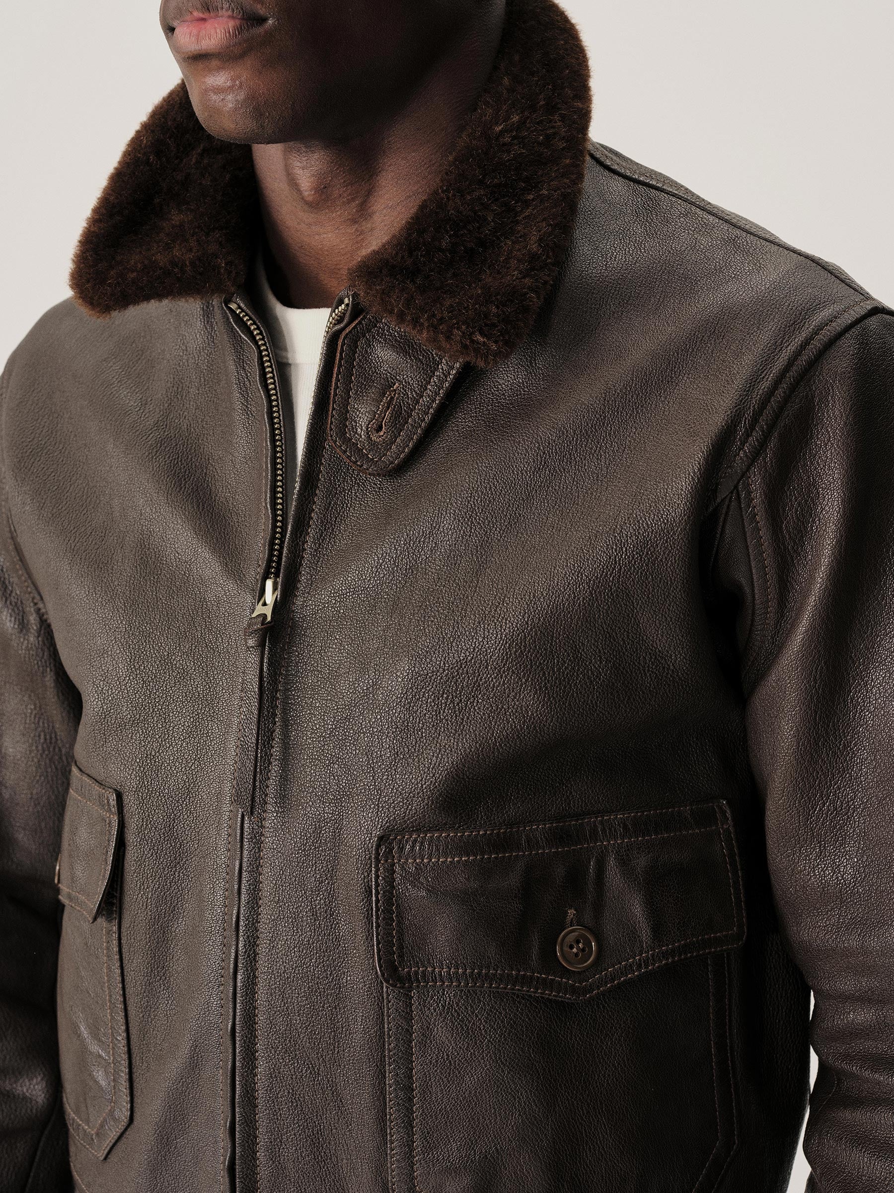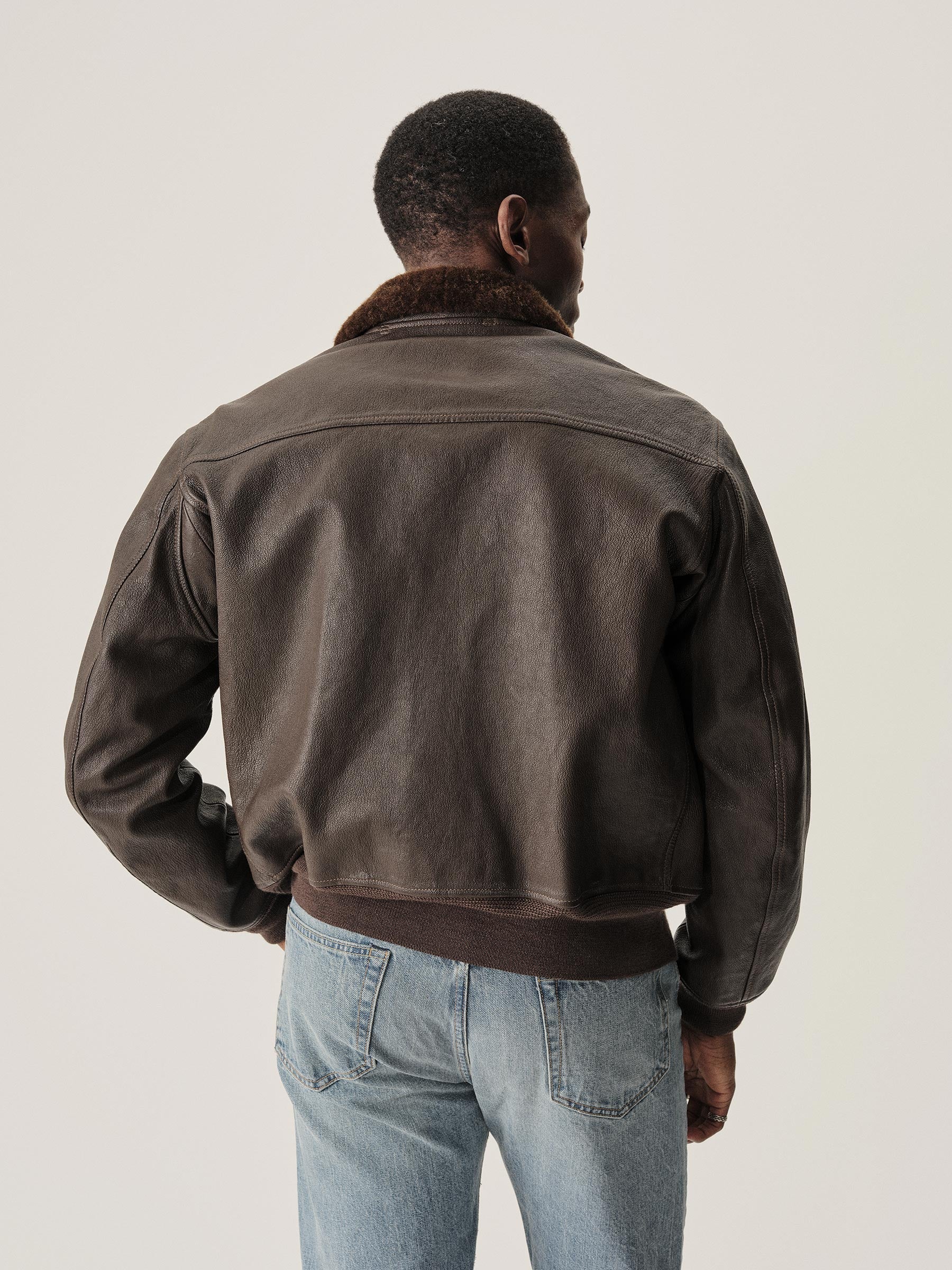 A faithful interpretation of the navy’s G-1 flight jacket. Crafted from vegetable-tanned goatskin with a bold shearling collar.