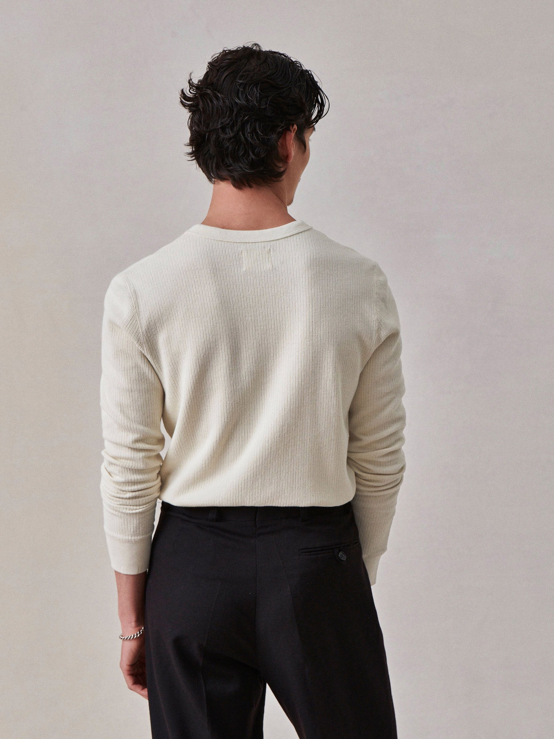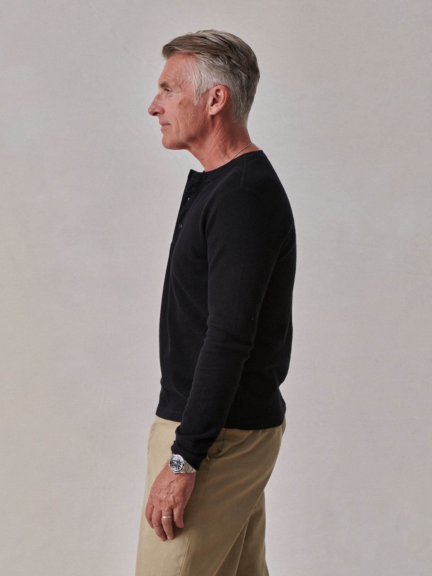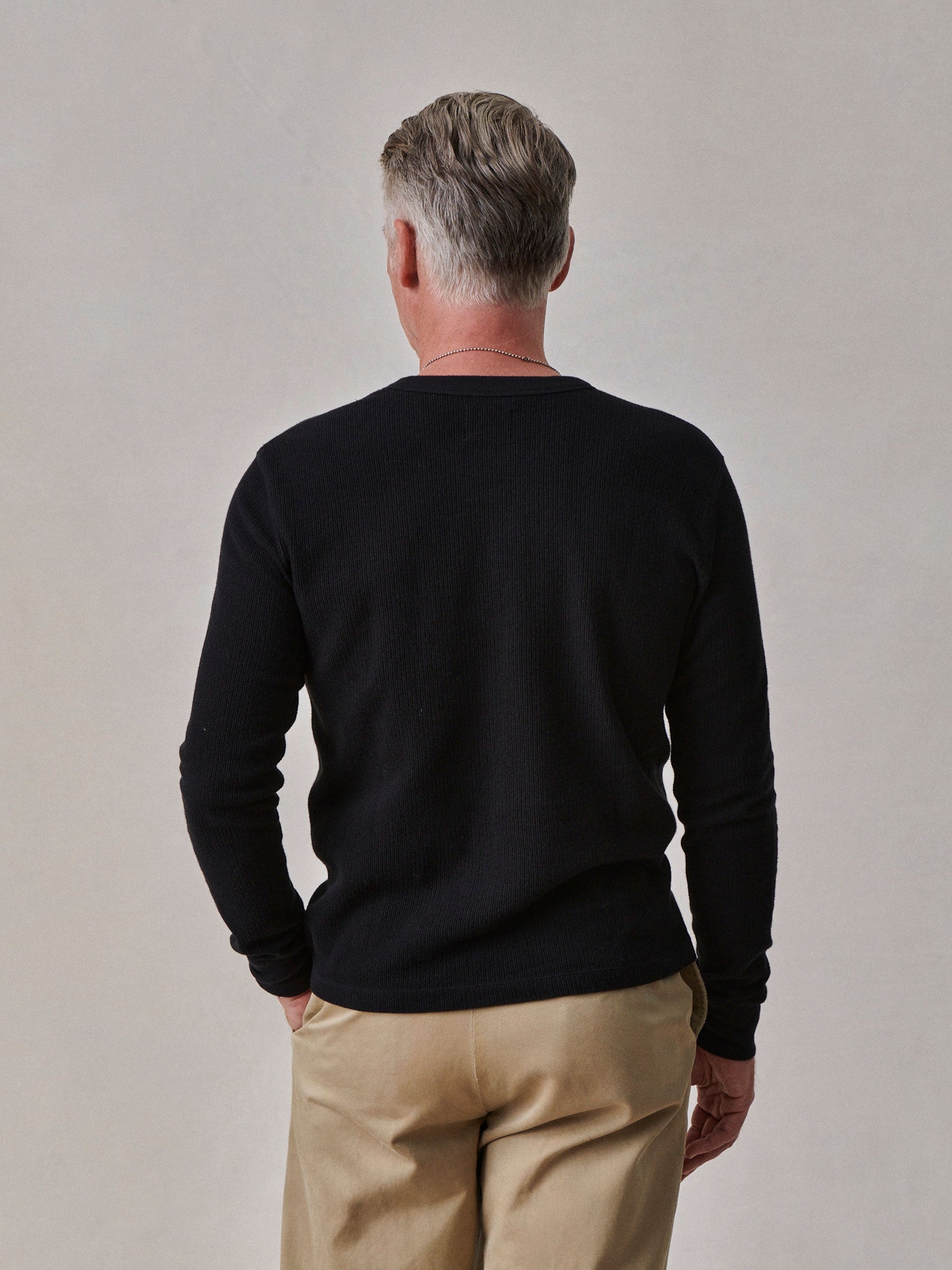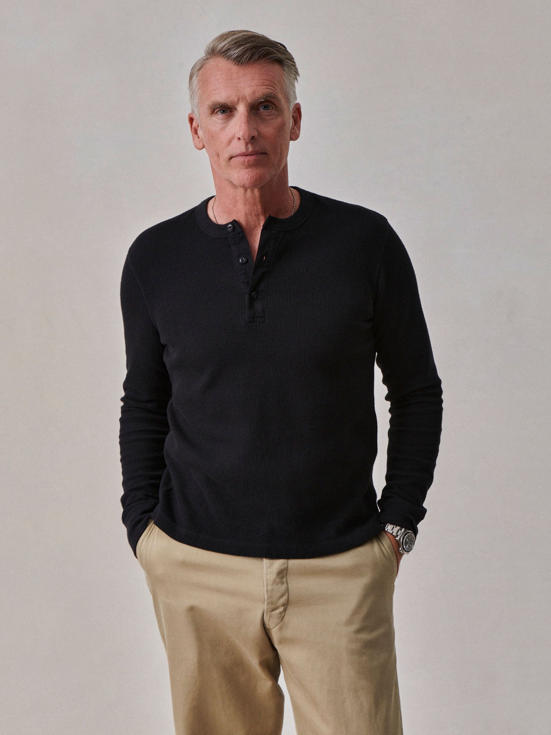 Inspired by vintage military pieces, our thermal henley has a woven placket and classic cat-eye buttons.