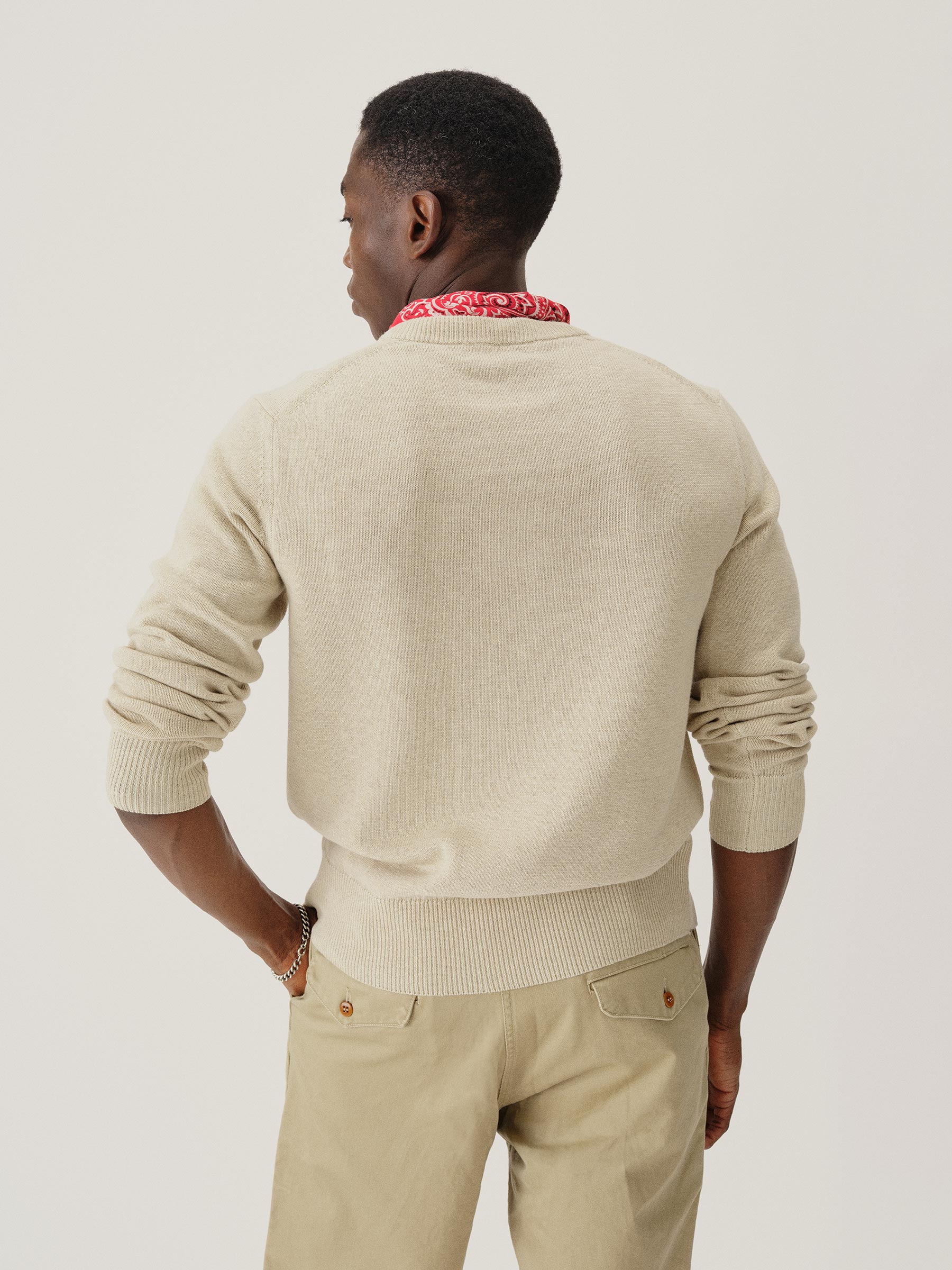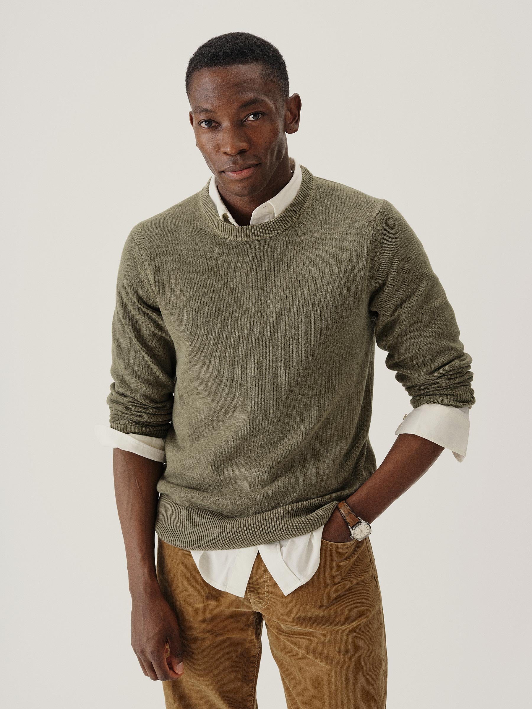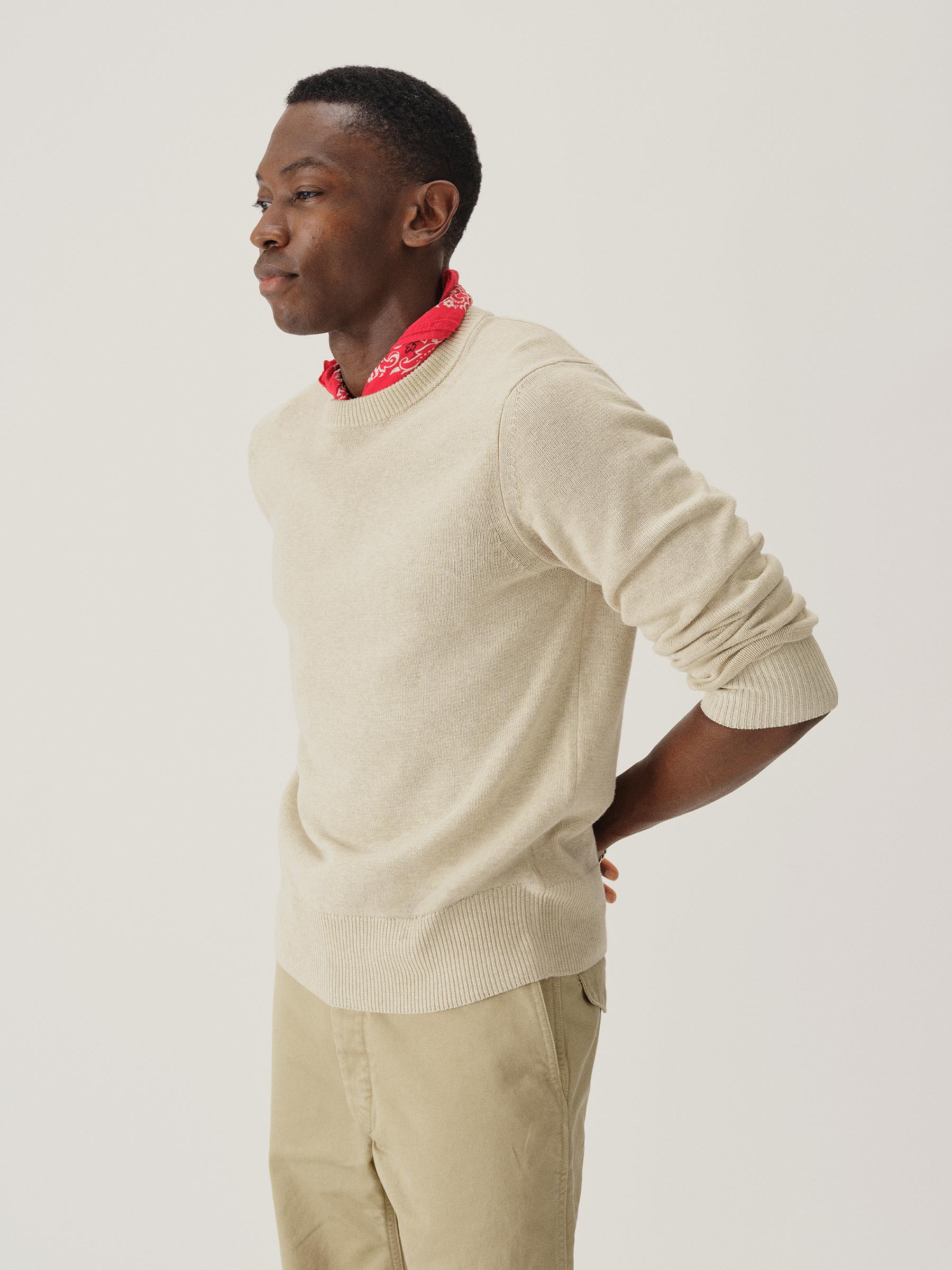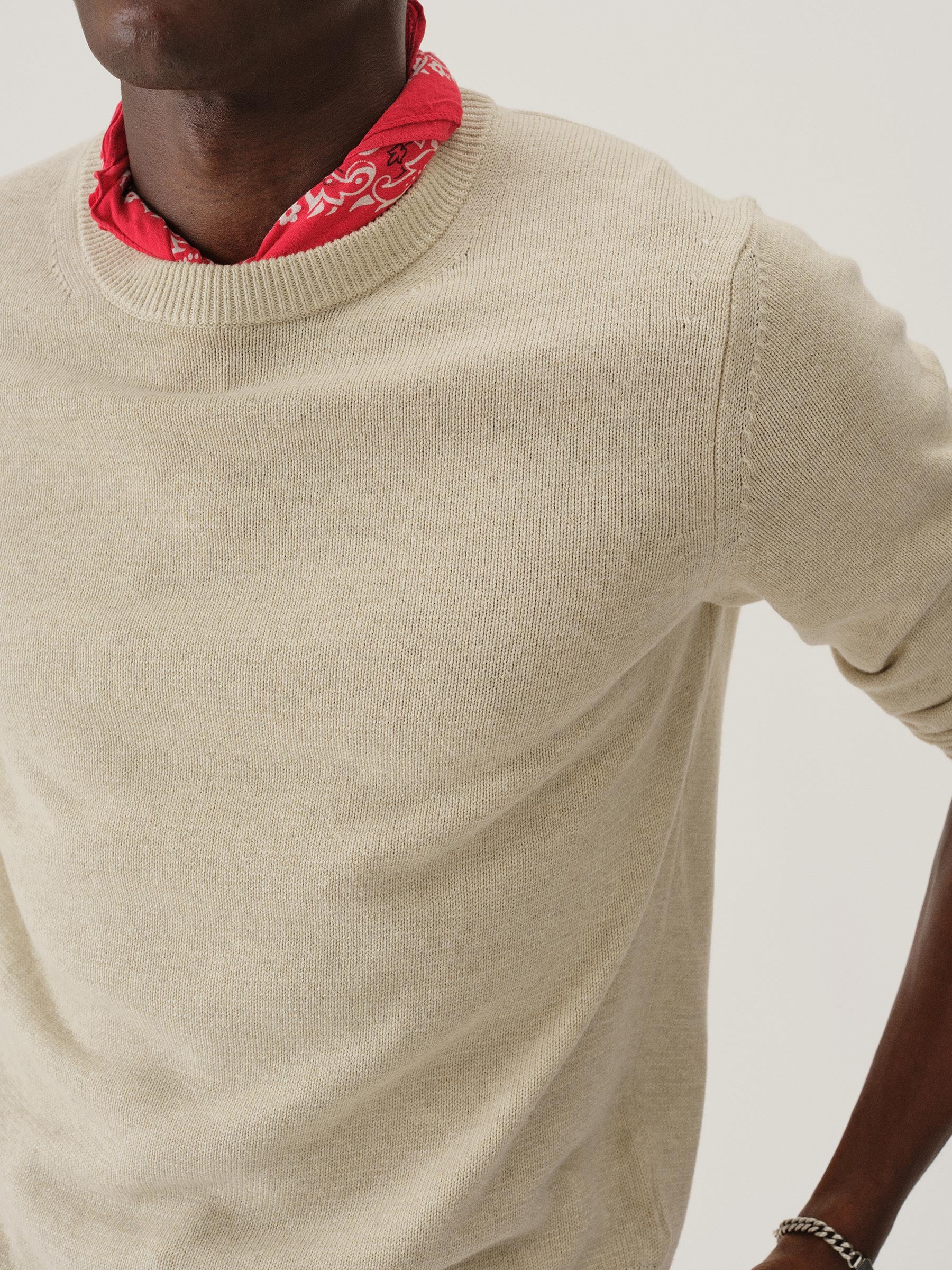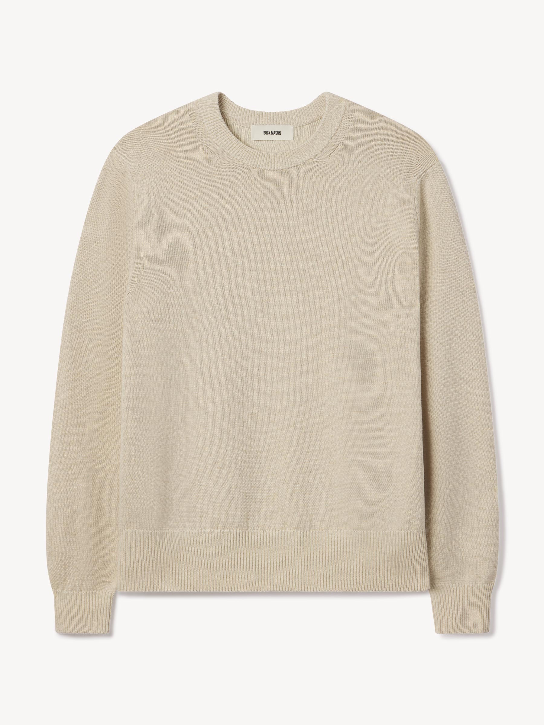 A lightweight knit crewneck sweater made from a blend of cotton, wool, and hemp.