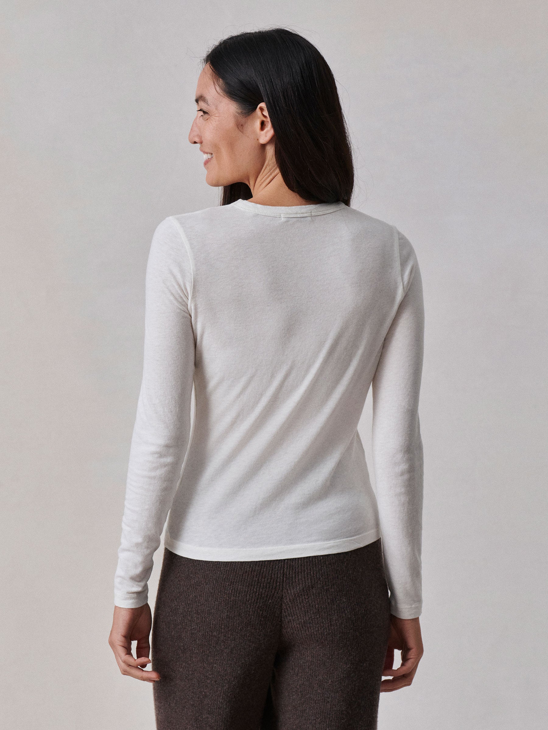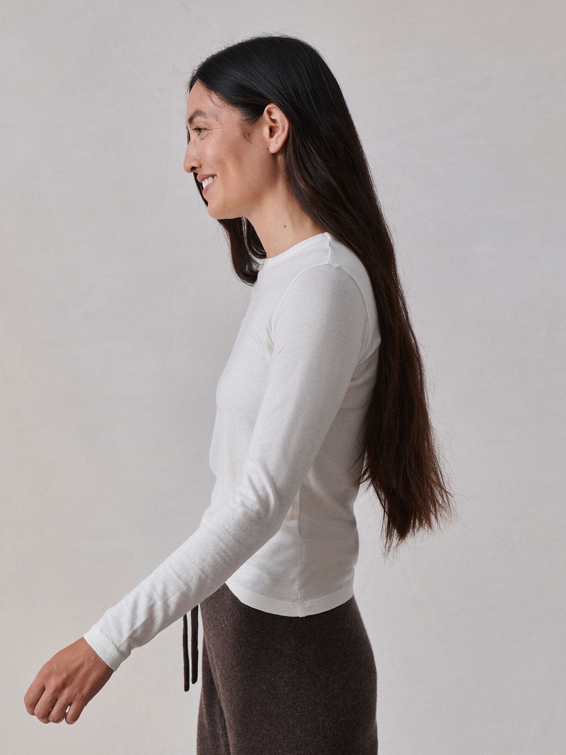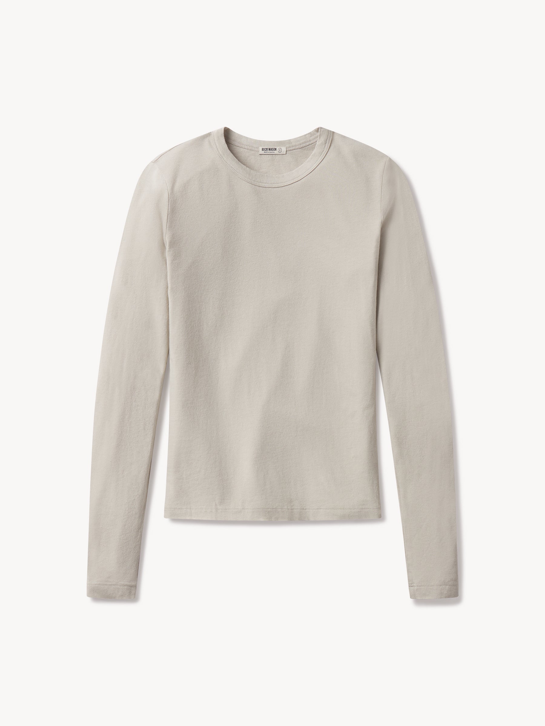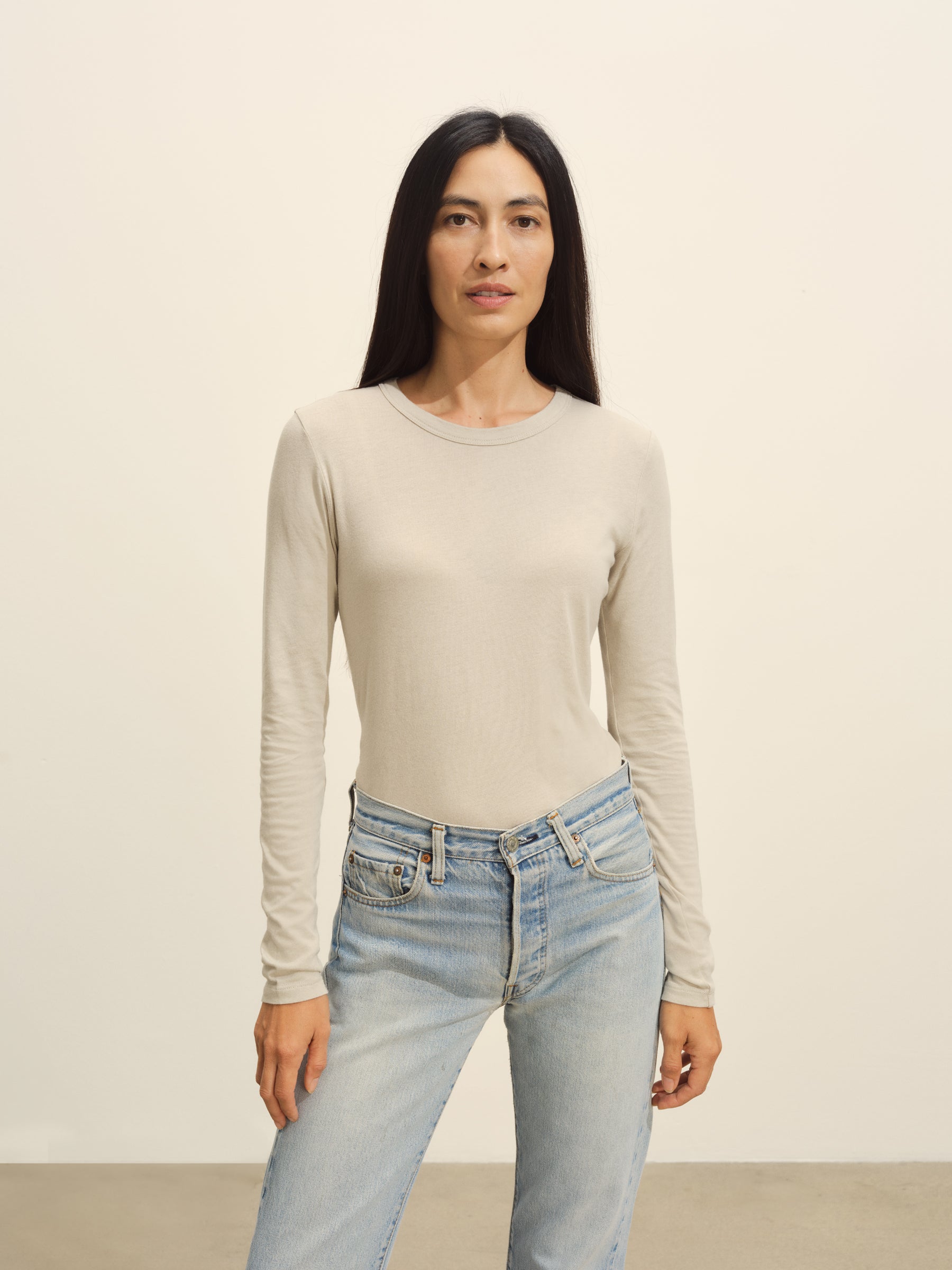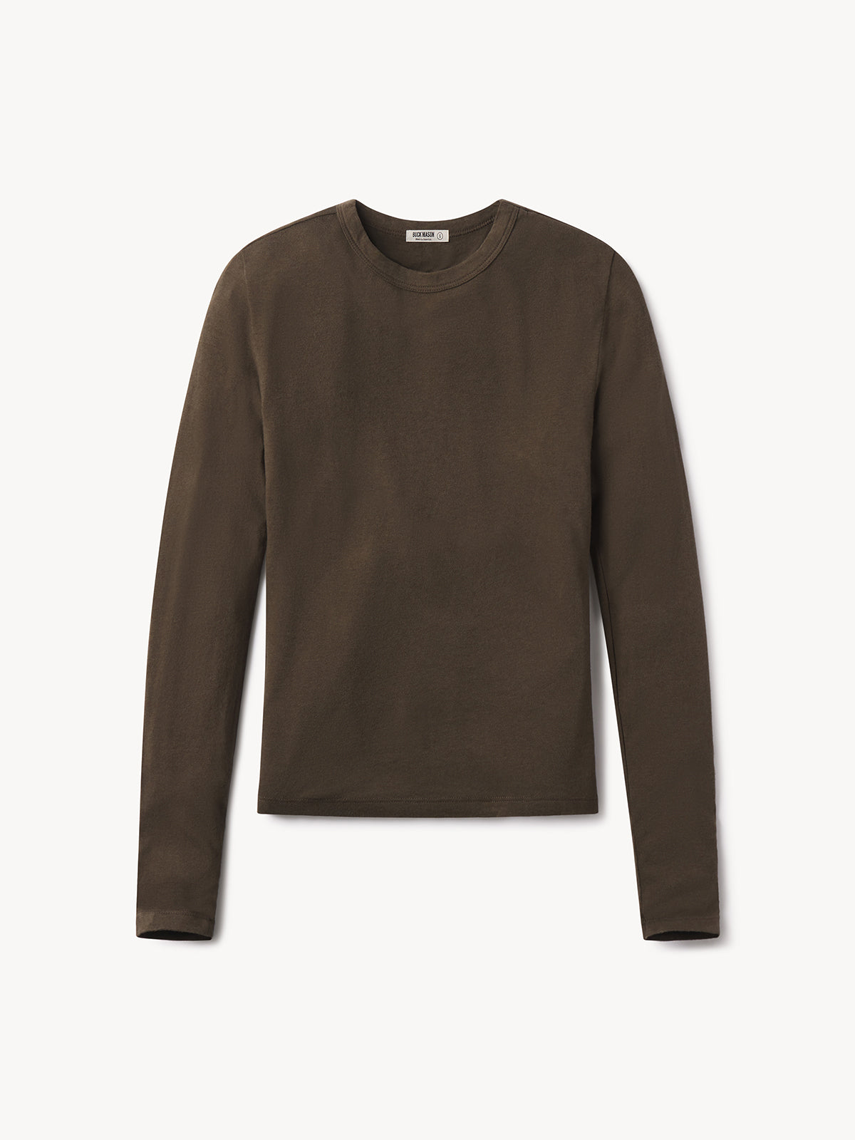 Slim fit long sleeve crewneck tee cut from a supersoft 130 GSM bamboo/cotton/wool blend.