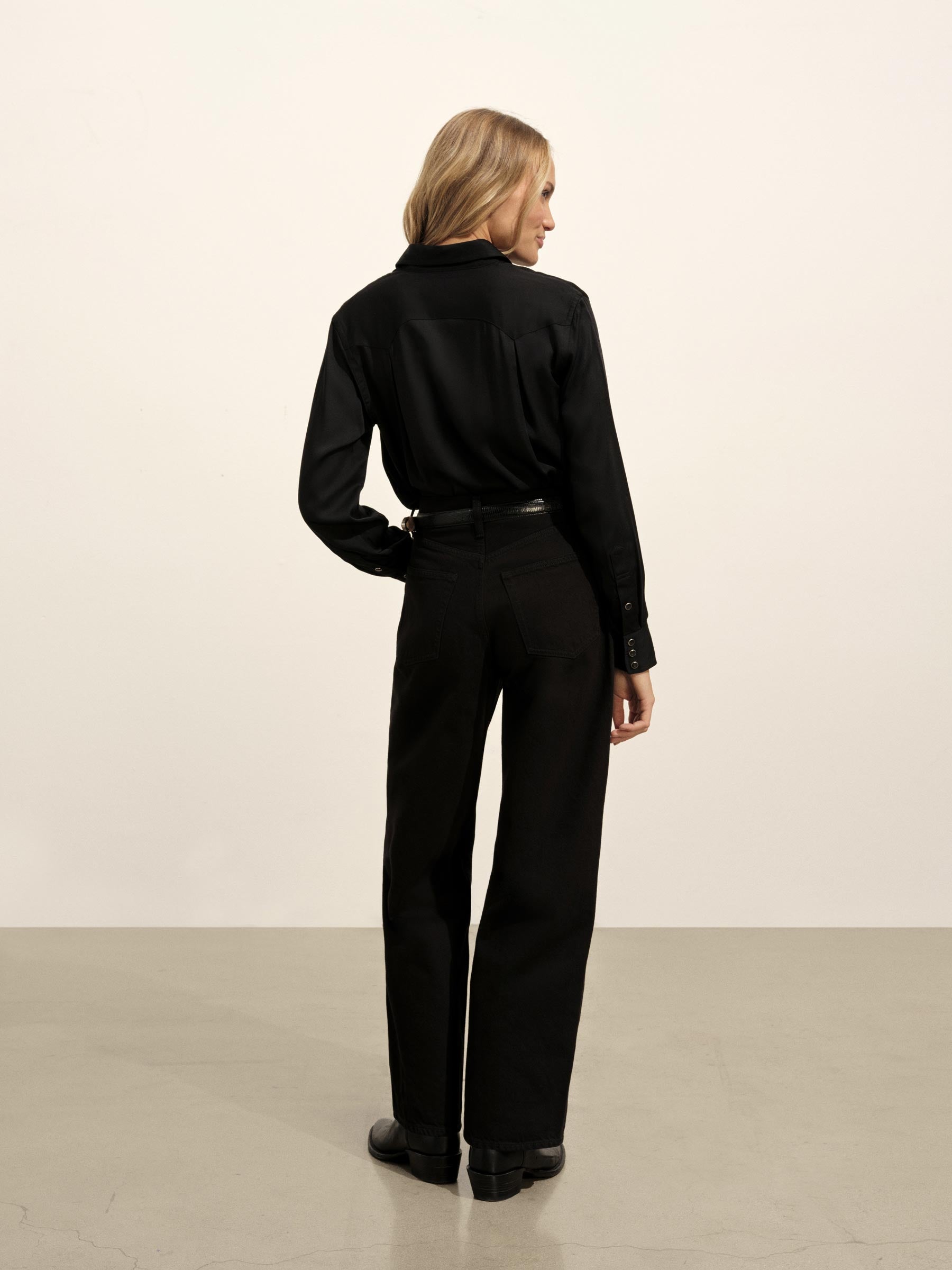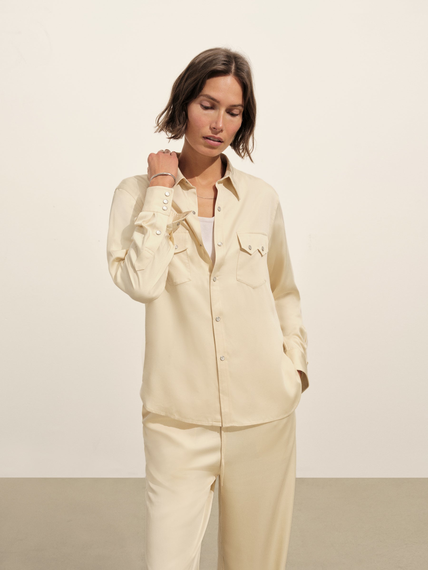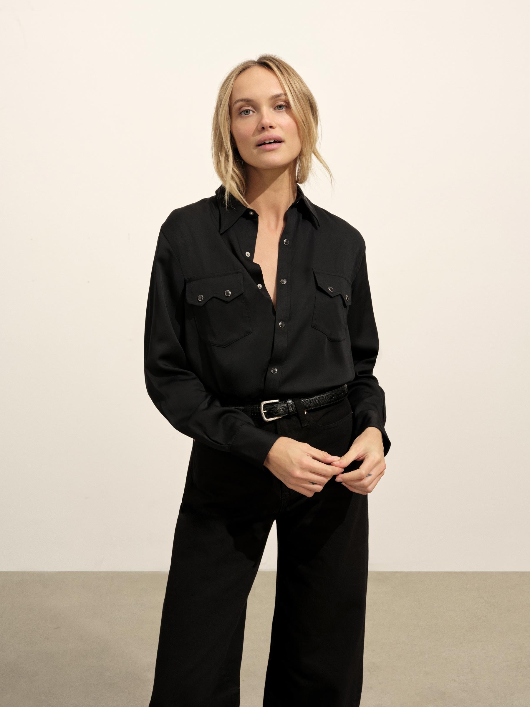 Silky rayon Western shirt with uniquely cut sawtooth pocket flaps.