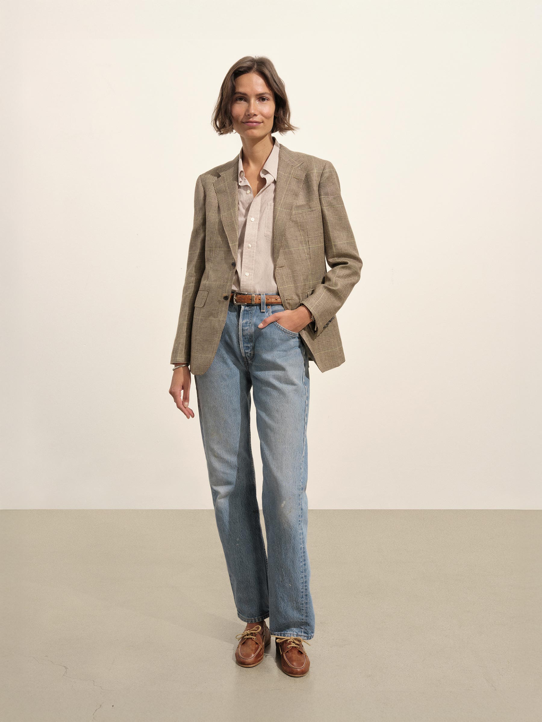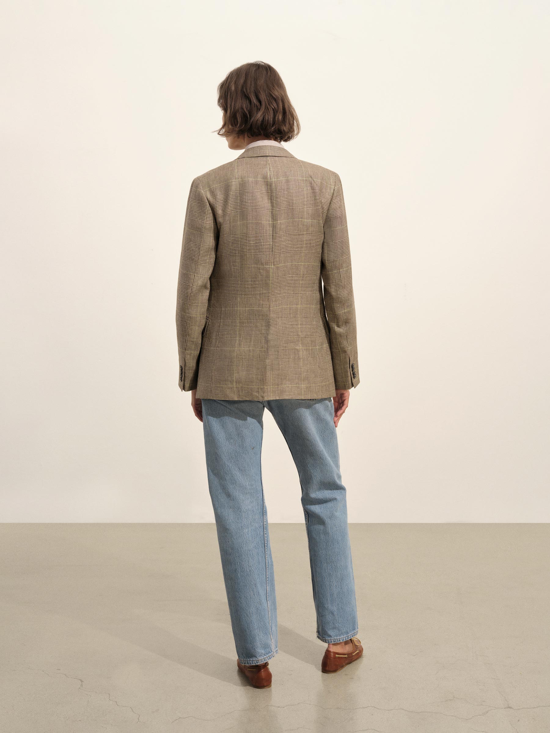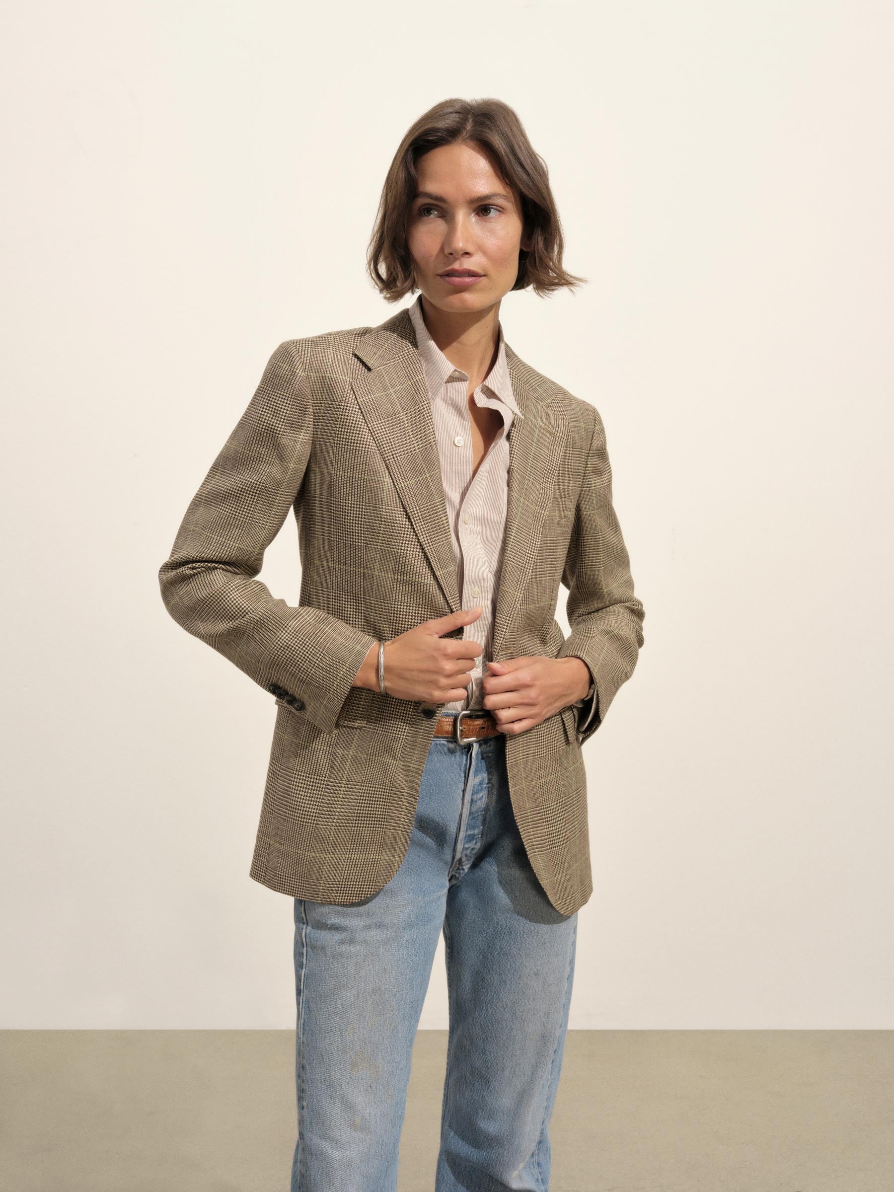 Vintage-inspired plaid blazer made from a structured English linen/wool blend with a relaxed fit.