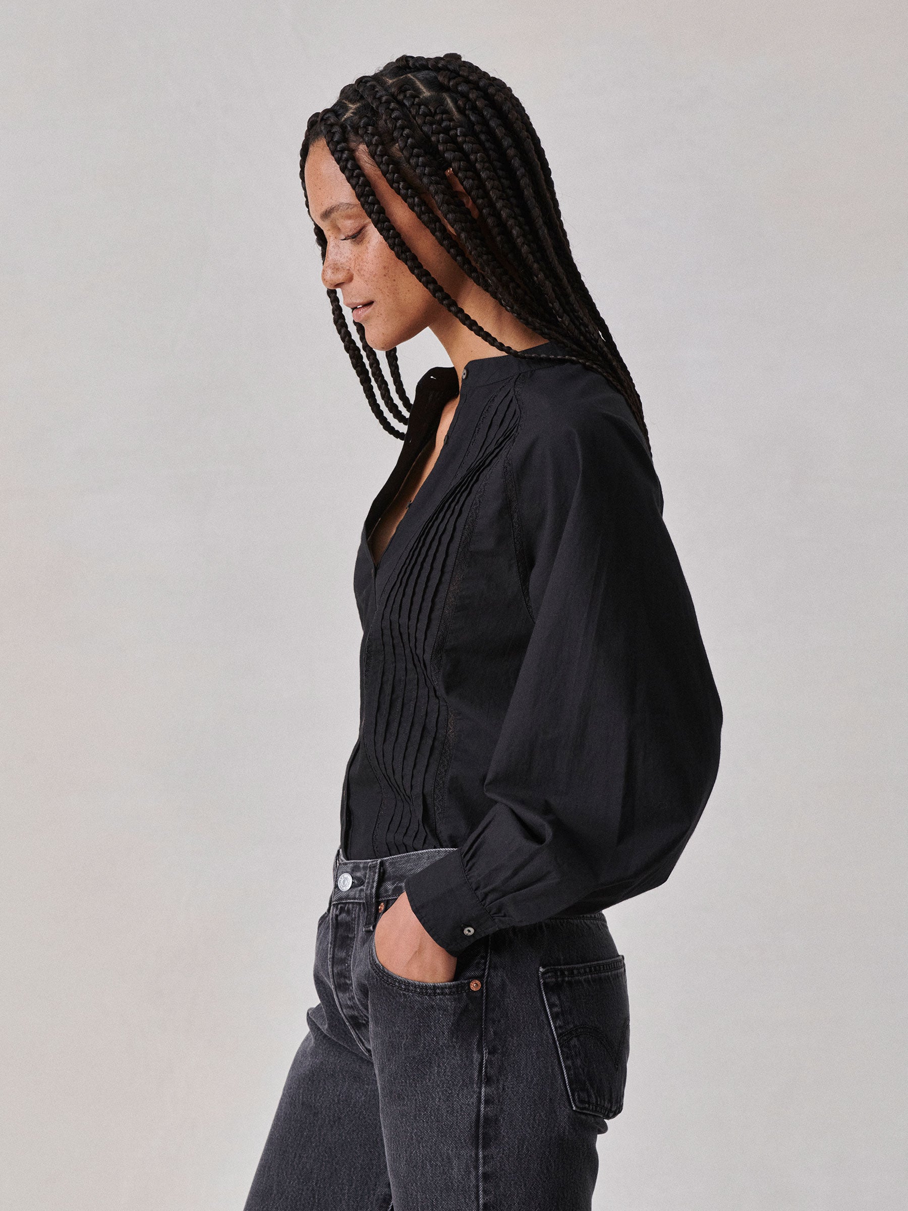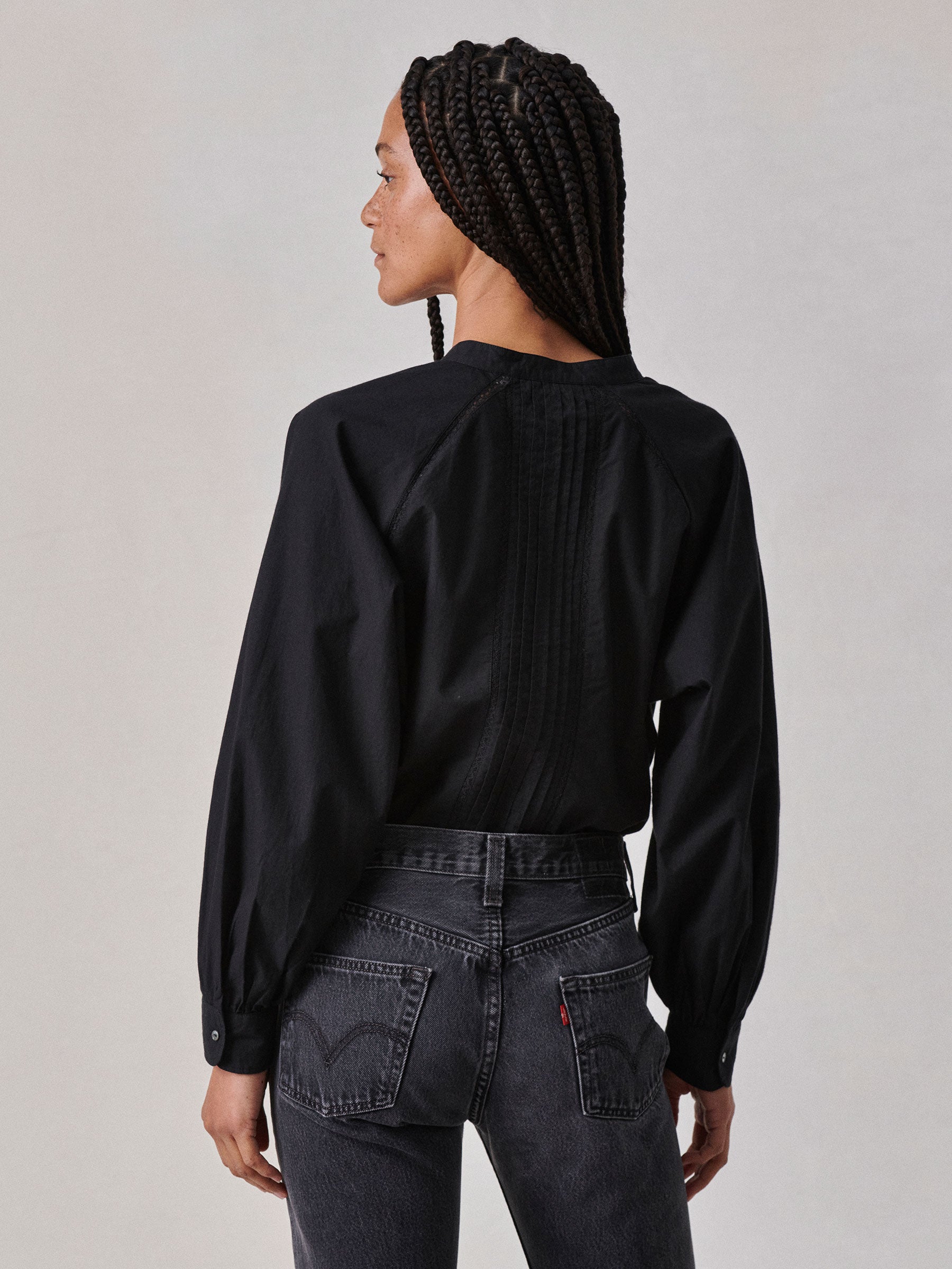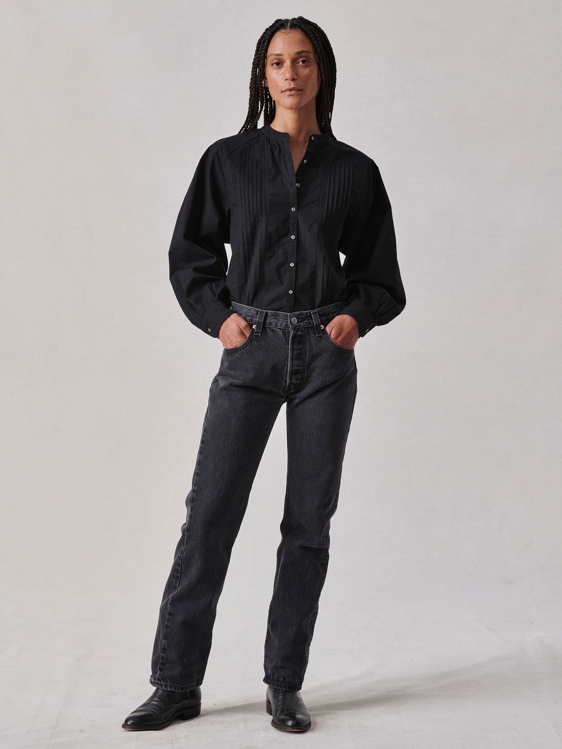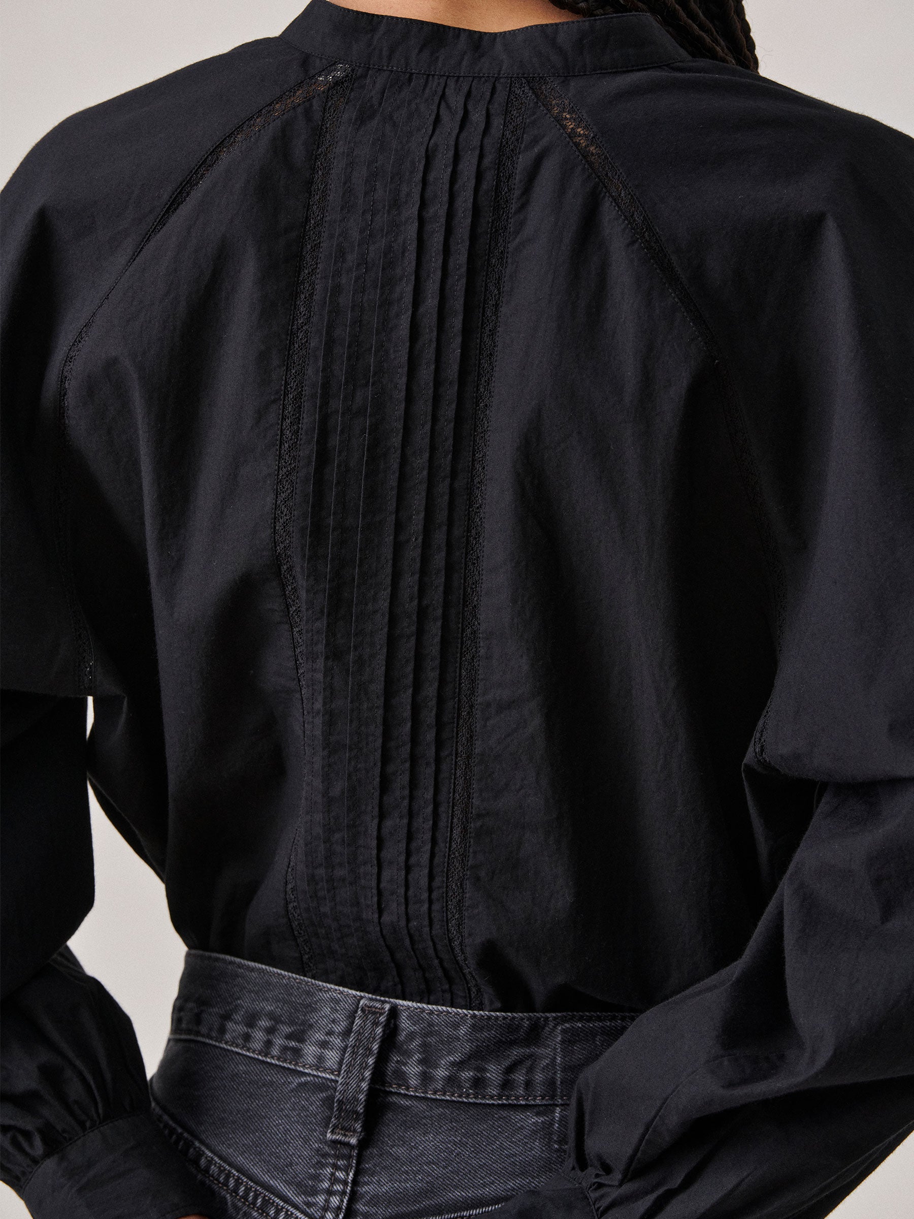 Relaxed band collar shirt inspired by a vintage Edwardian heirloom.