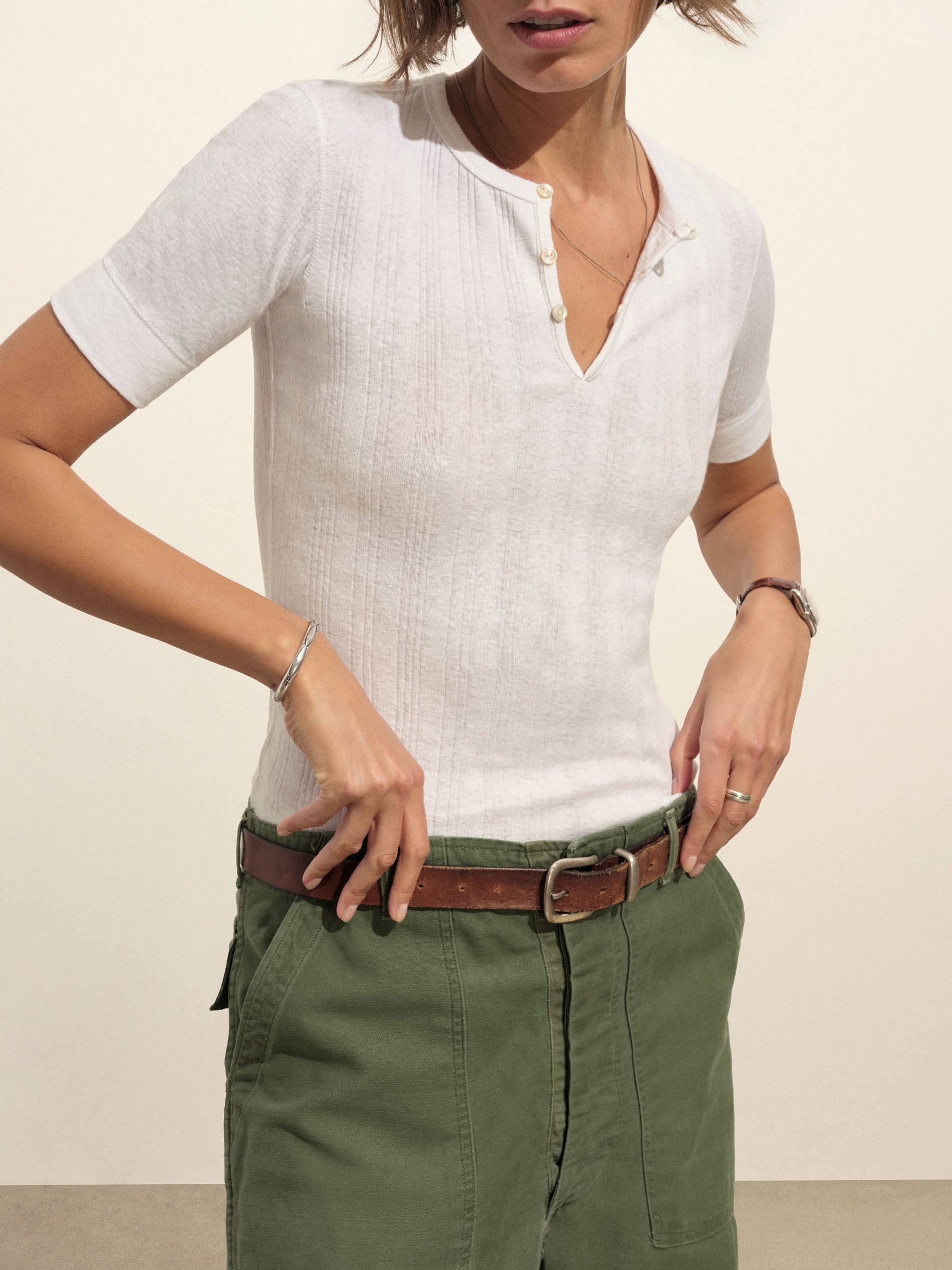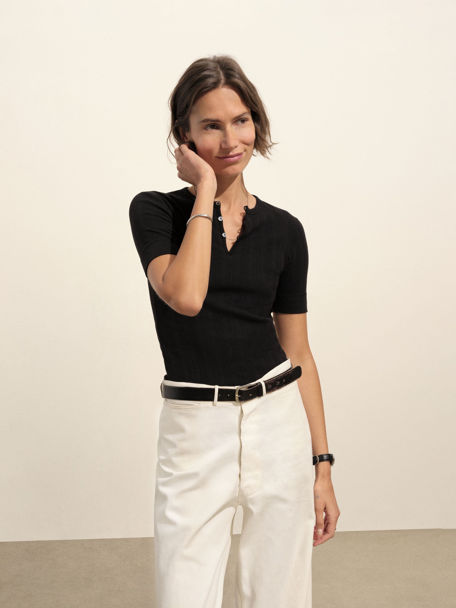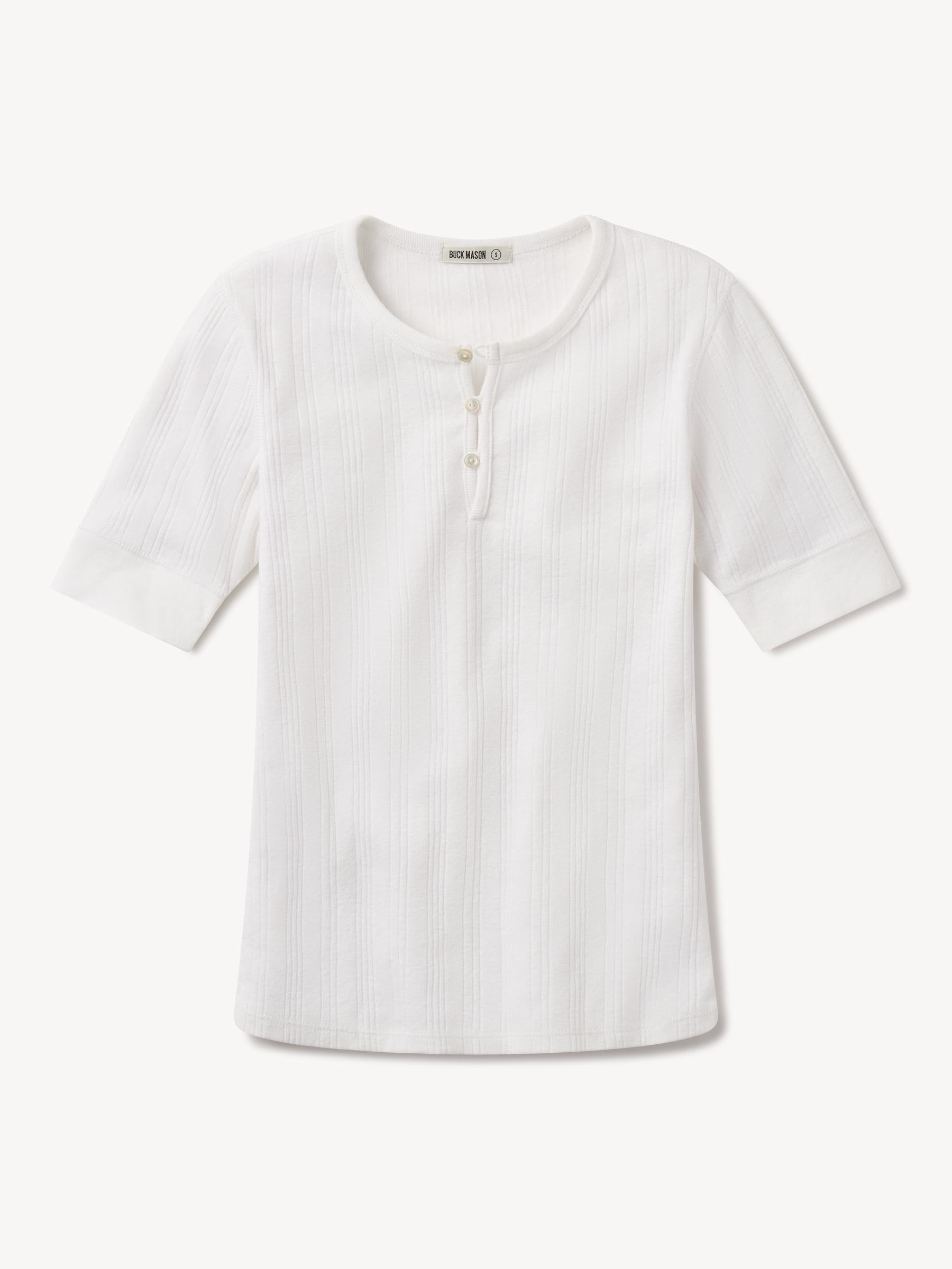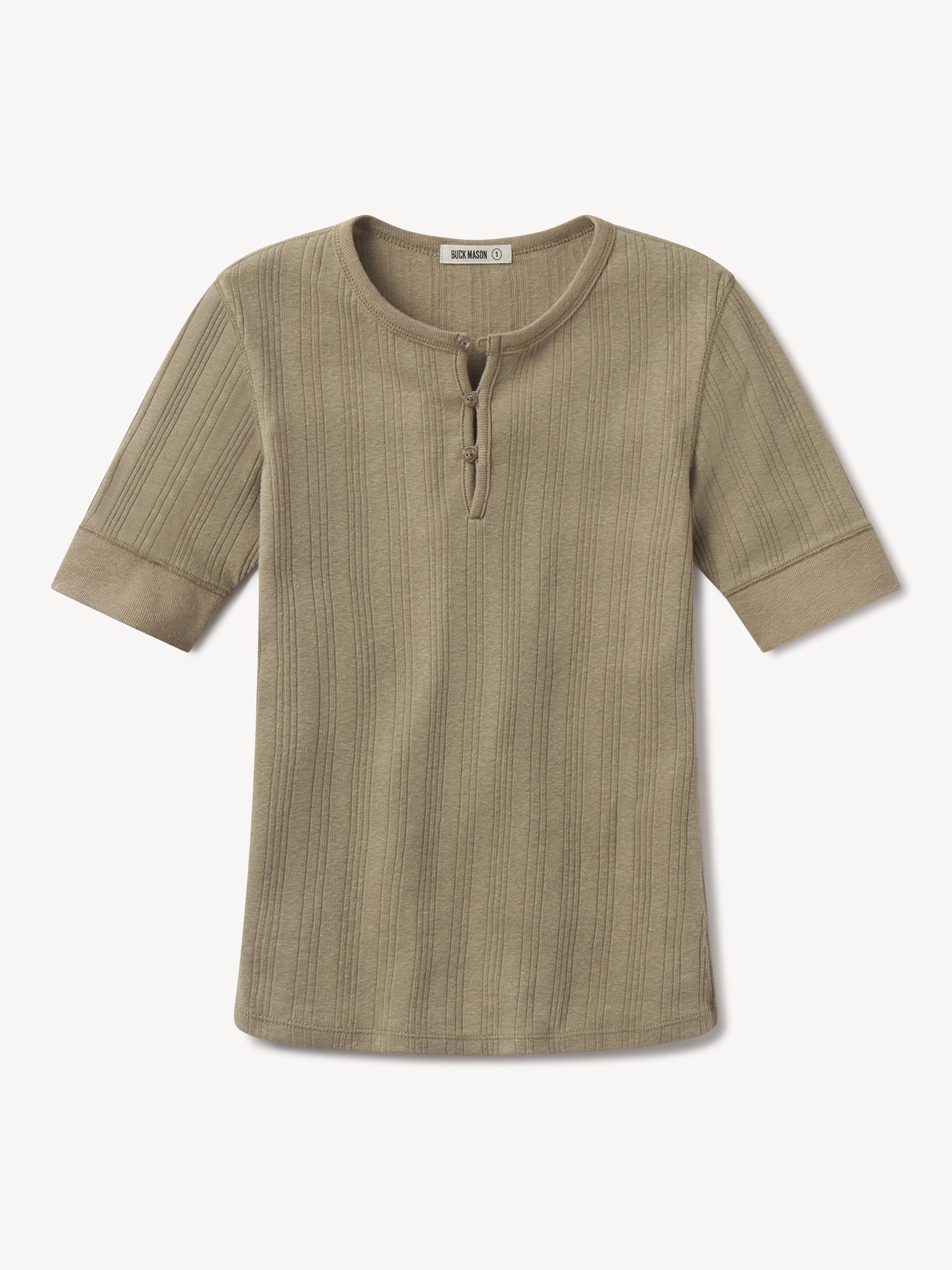 Slim-fit, military-inspired short sleeve ribbed henley, crafted from a superfine cotton blend.