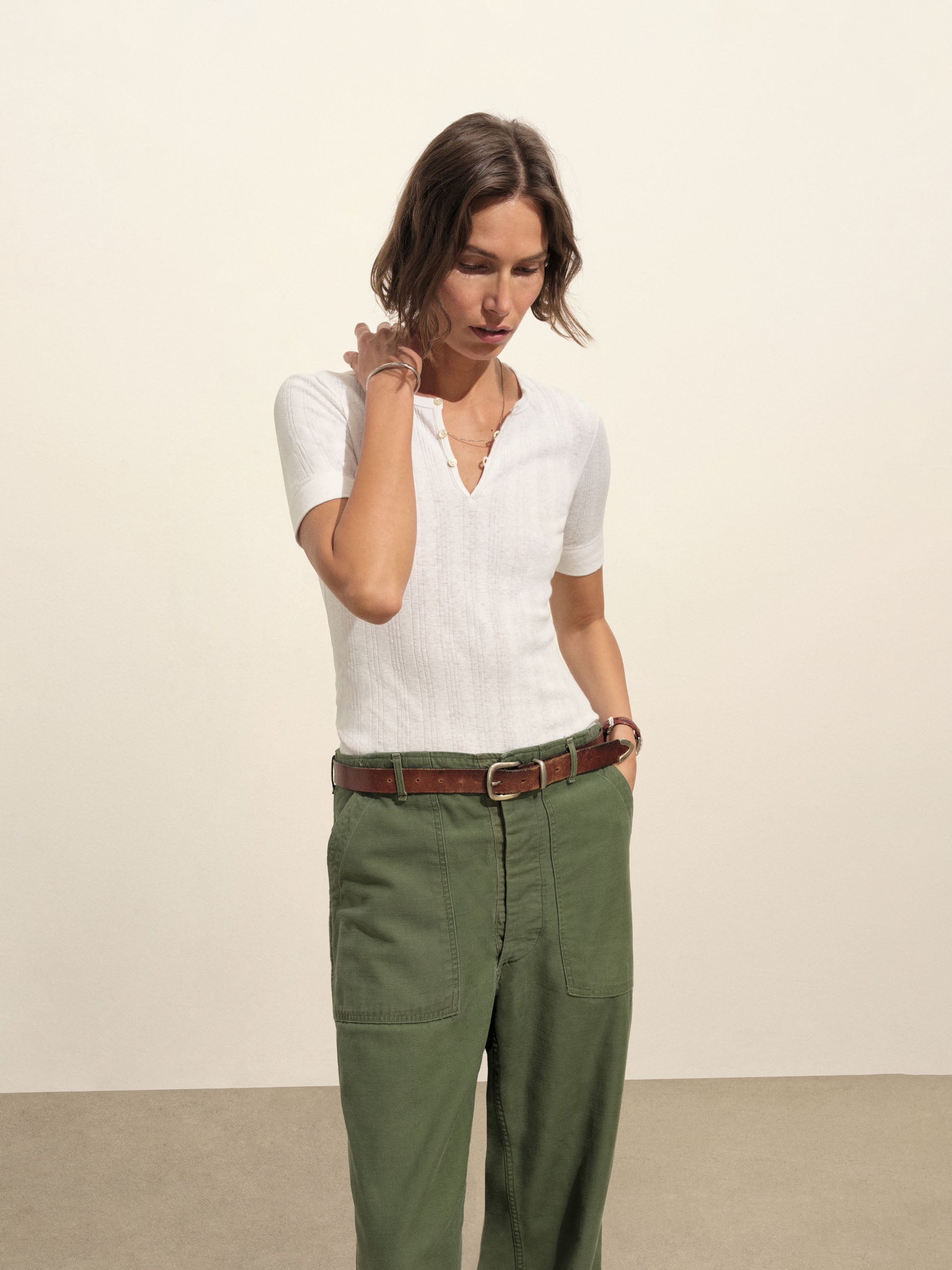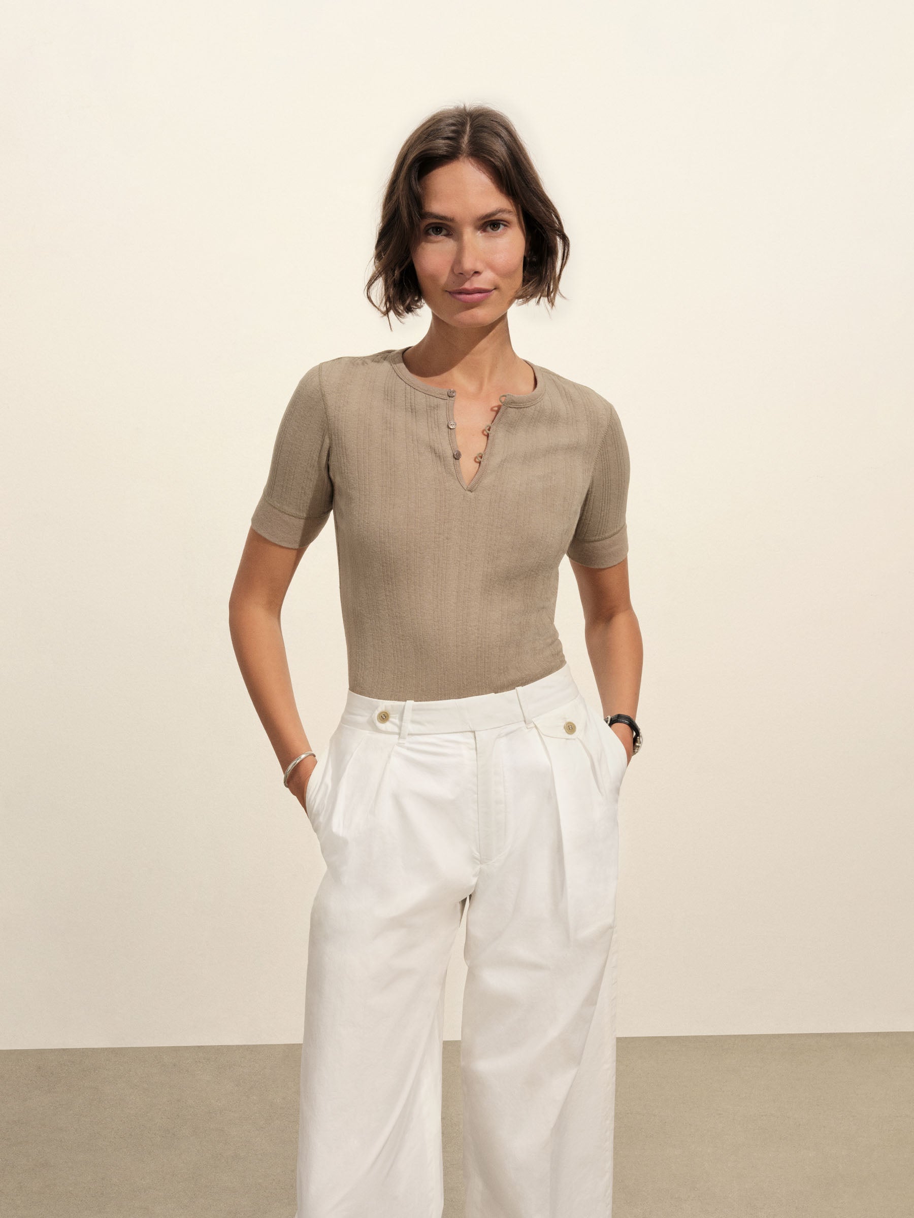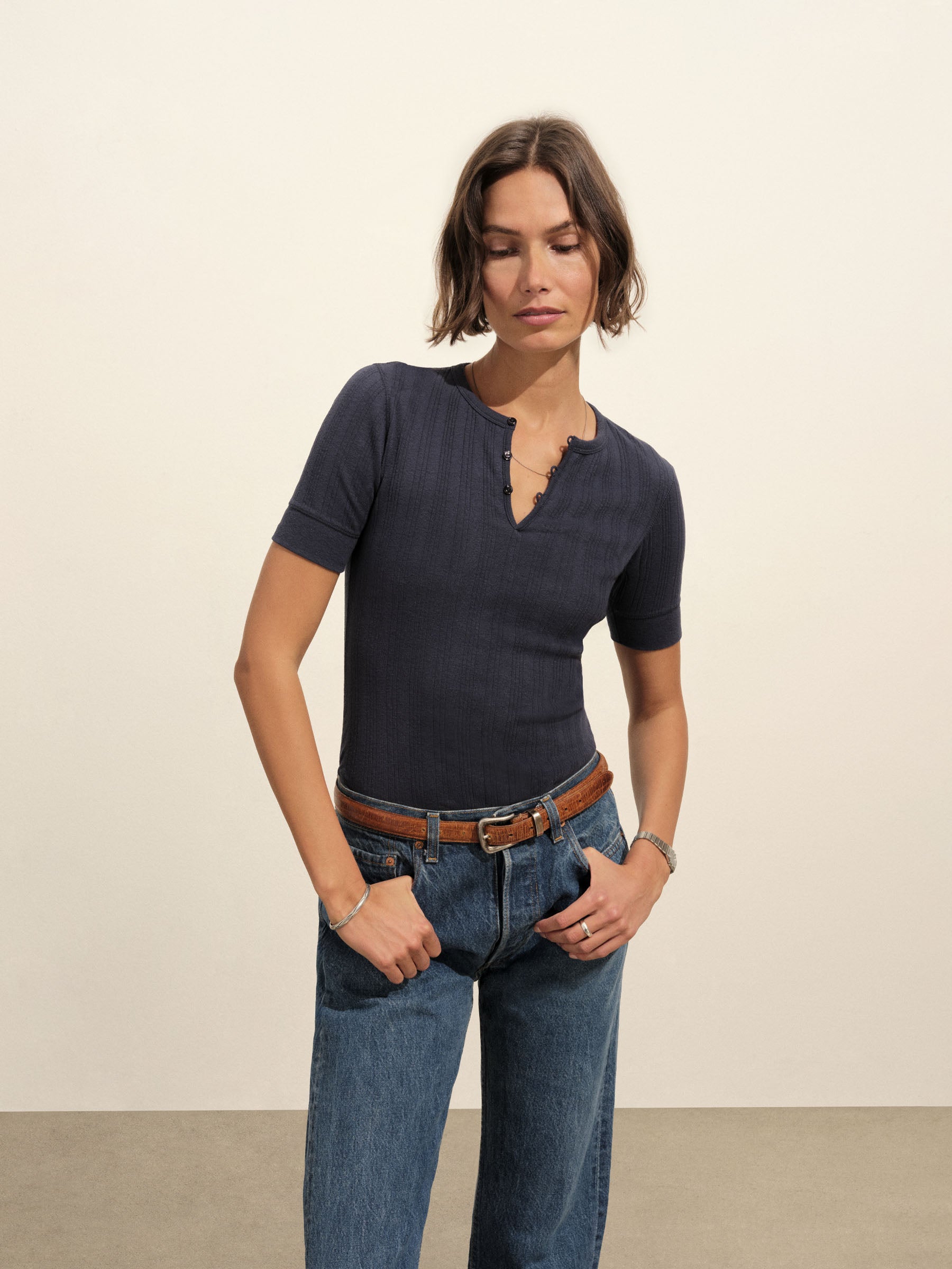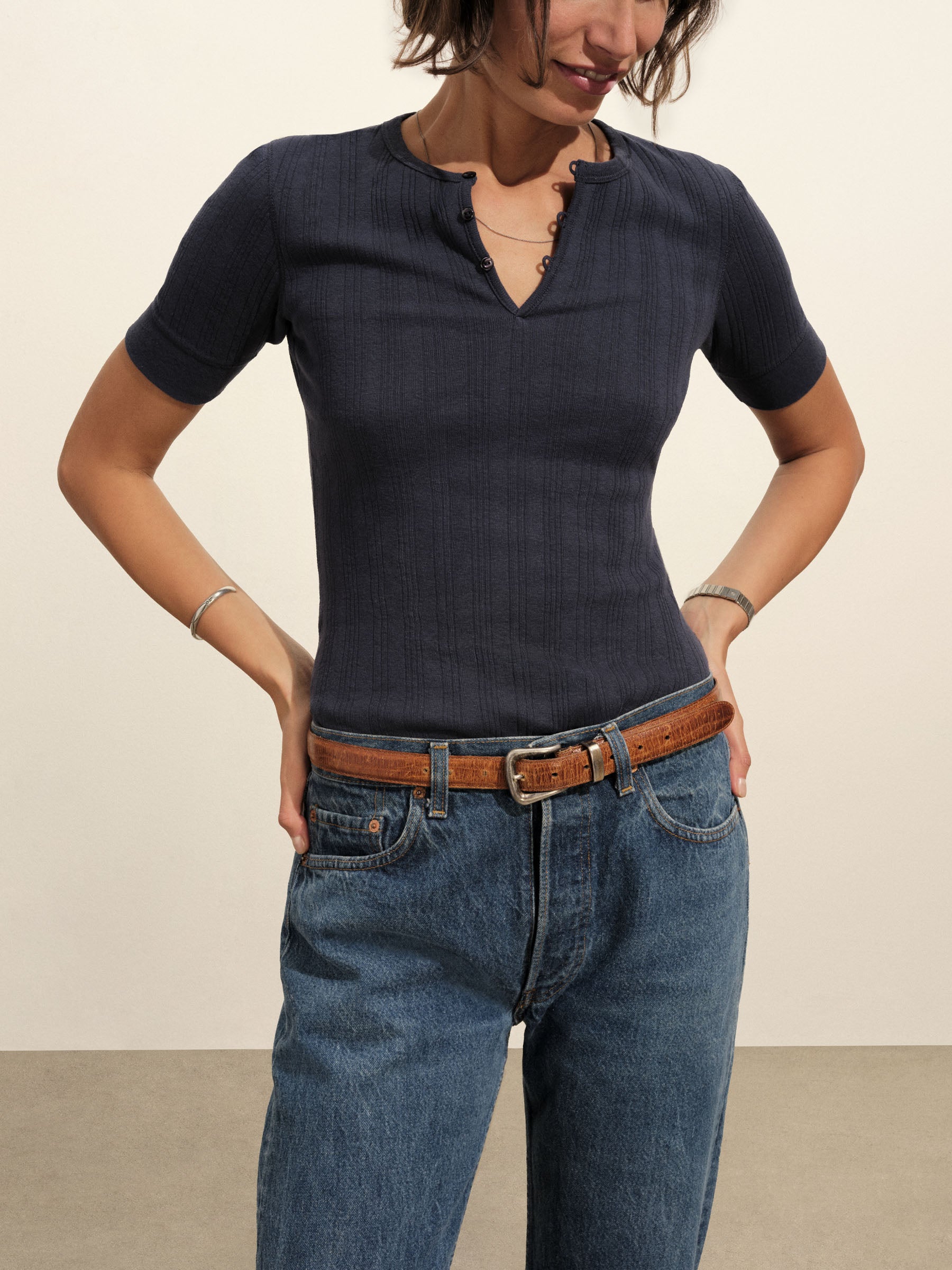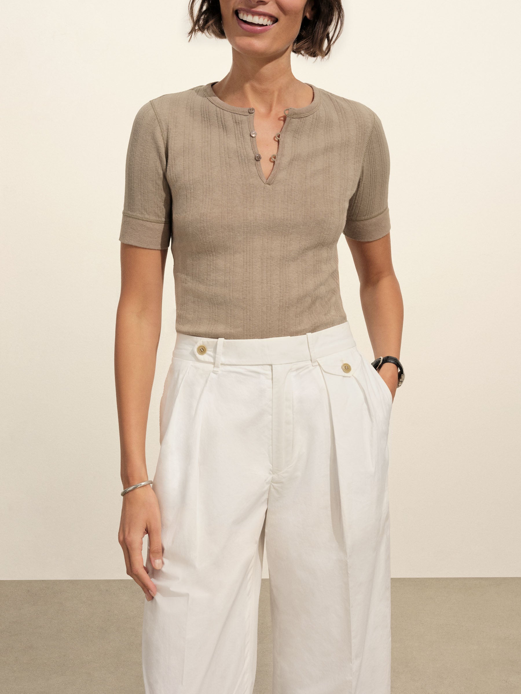Slim-fit, military-inspired short sleeve ribbed henley, crafted from a superfine cotton blend.