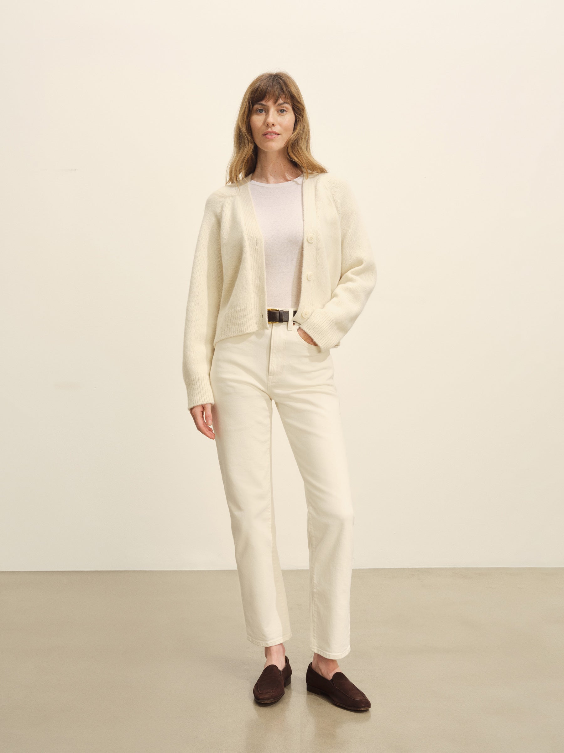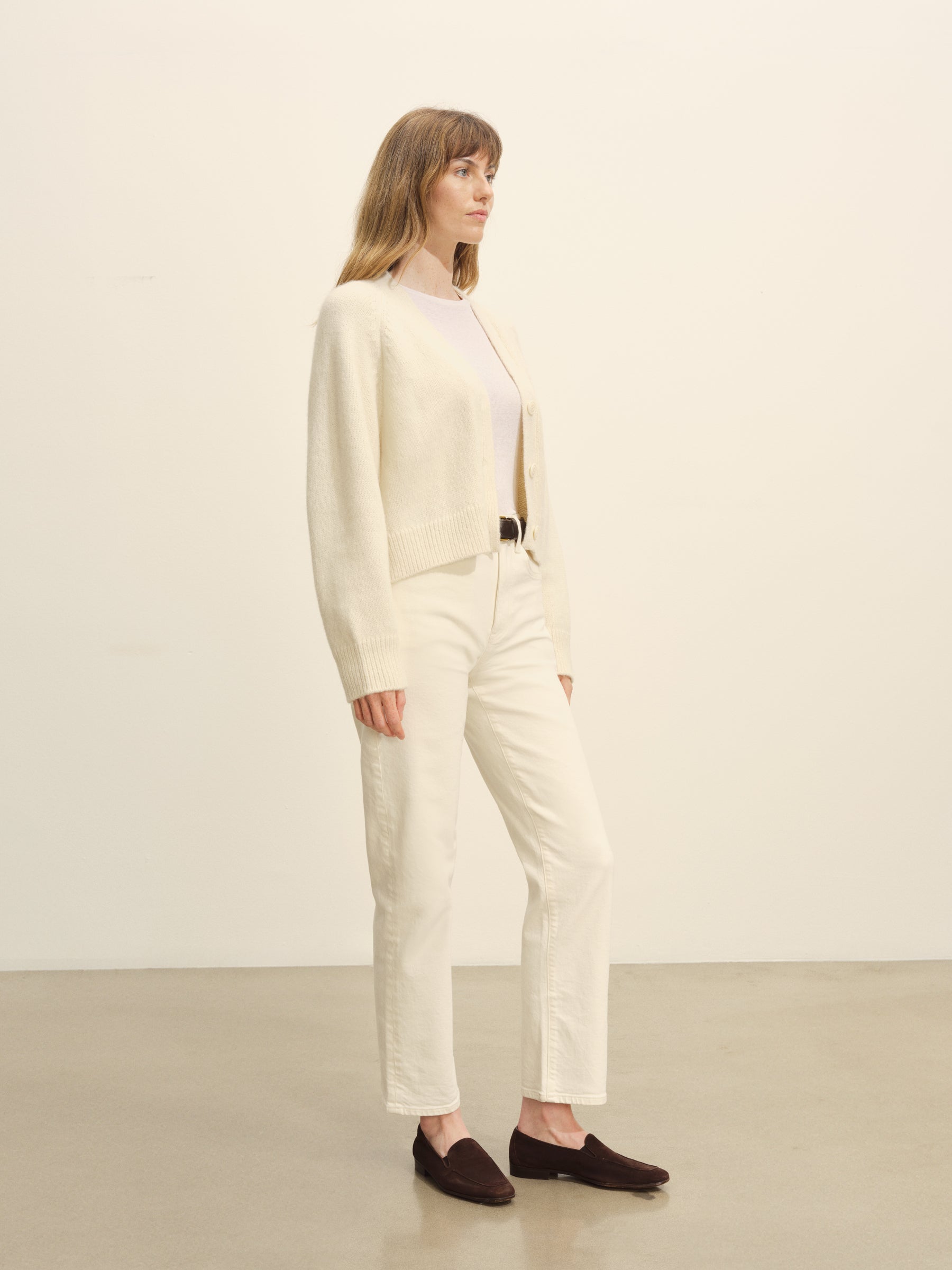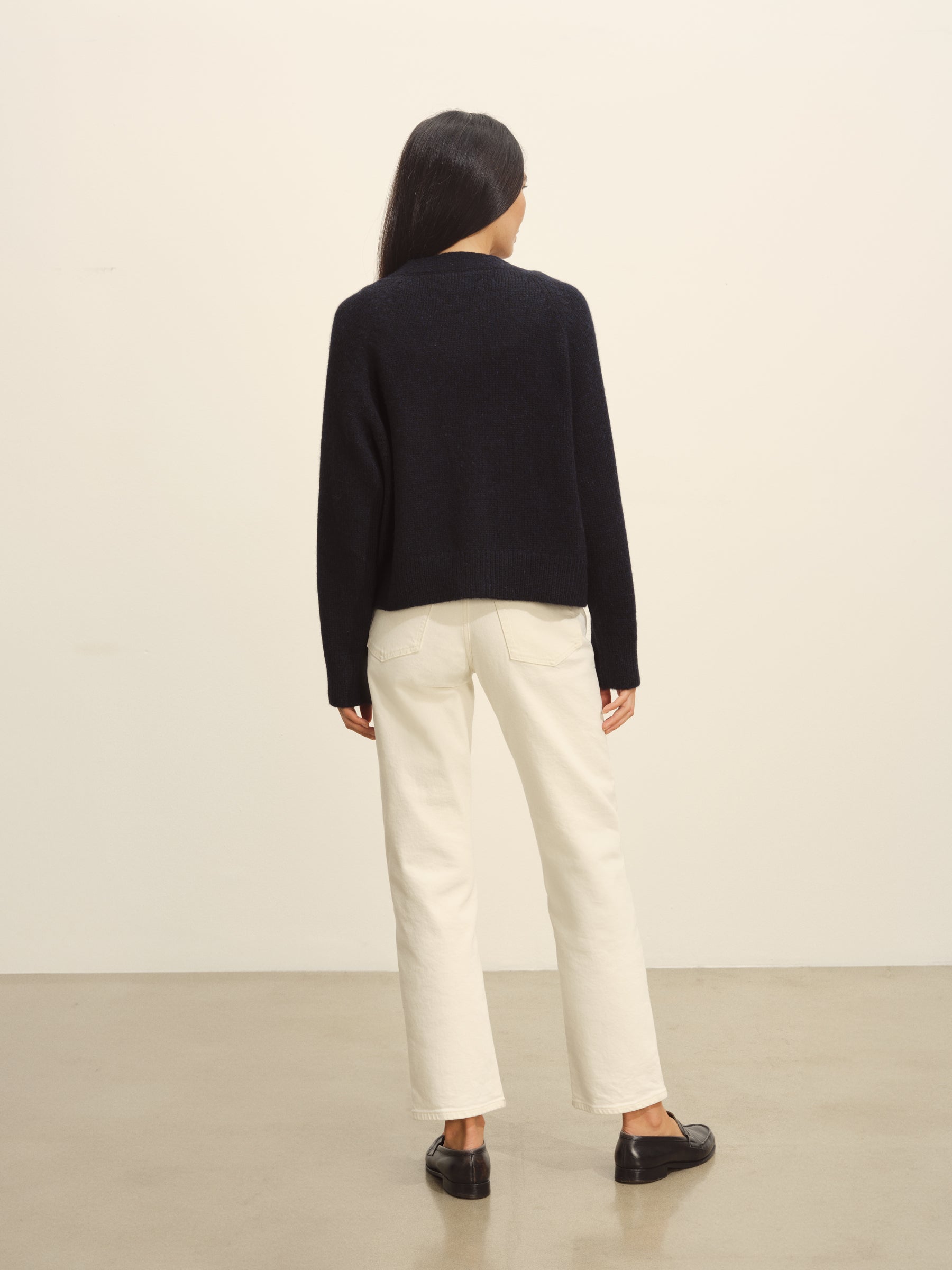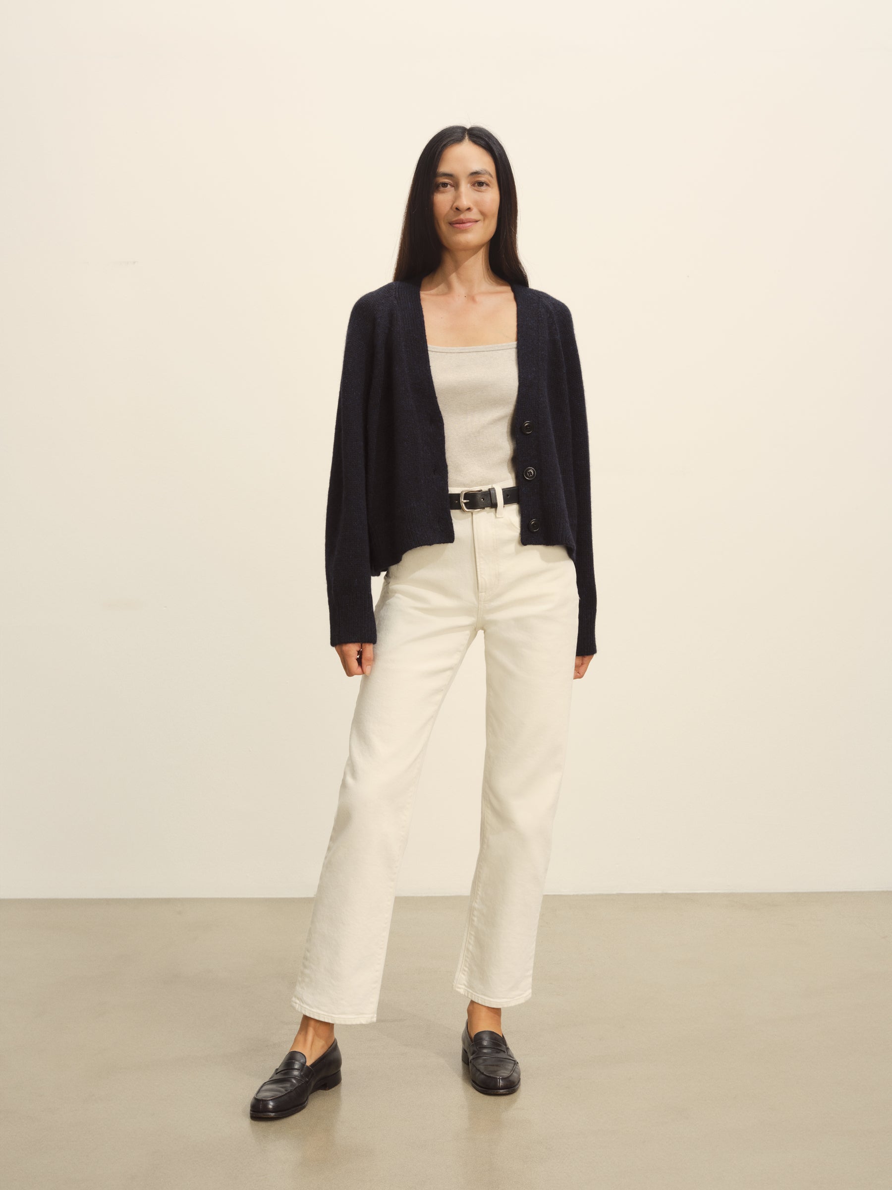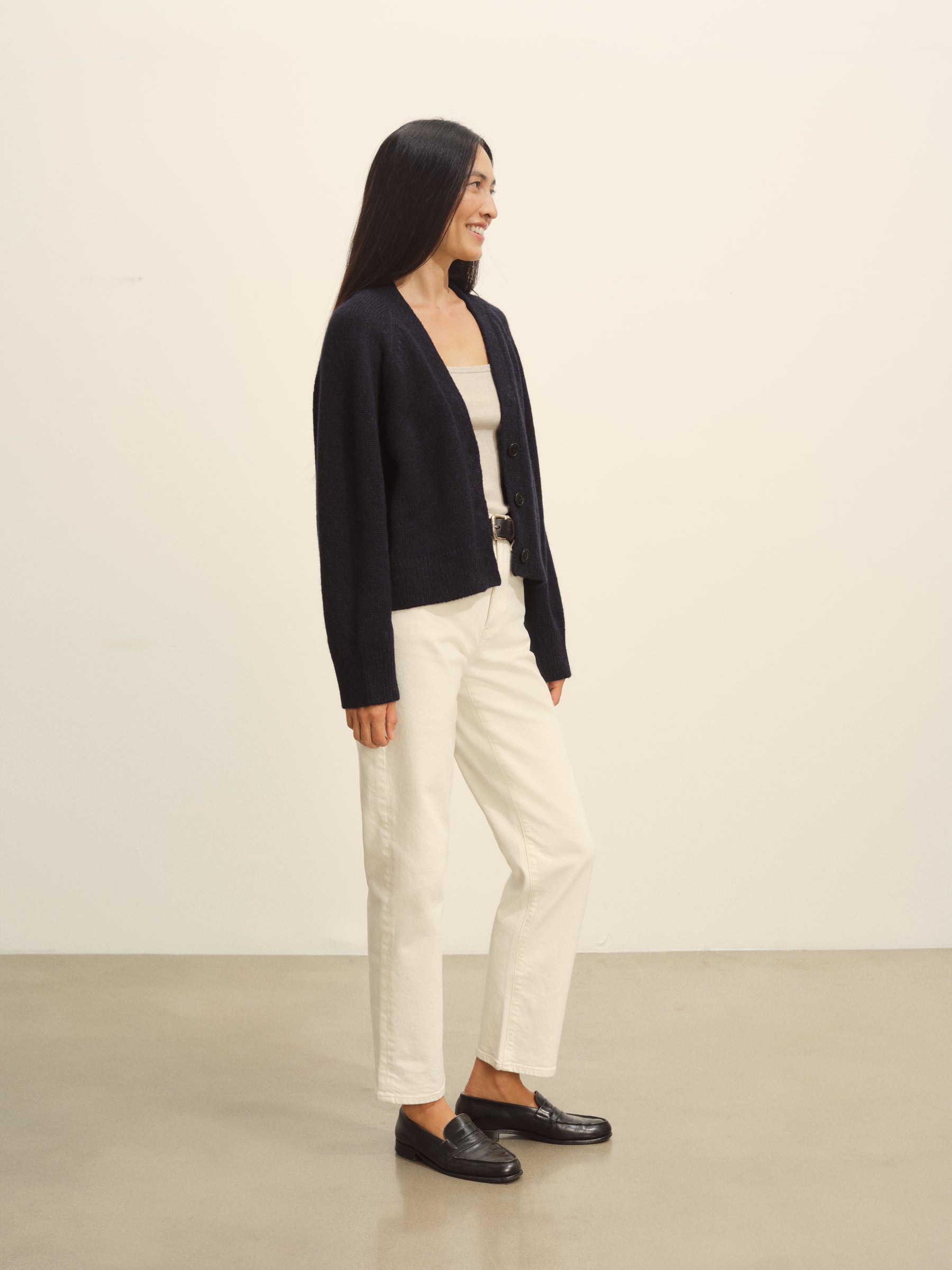 Boxy, cropped cardigan made from a soft and substantial blend of Peruvian alpaca and merino wool.