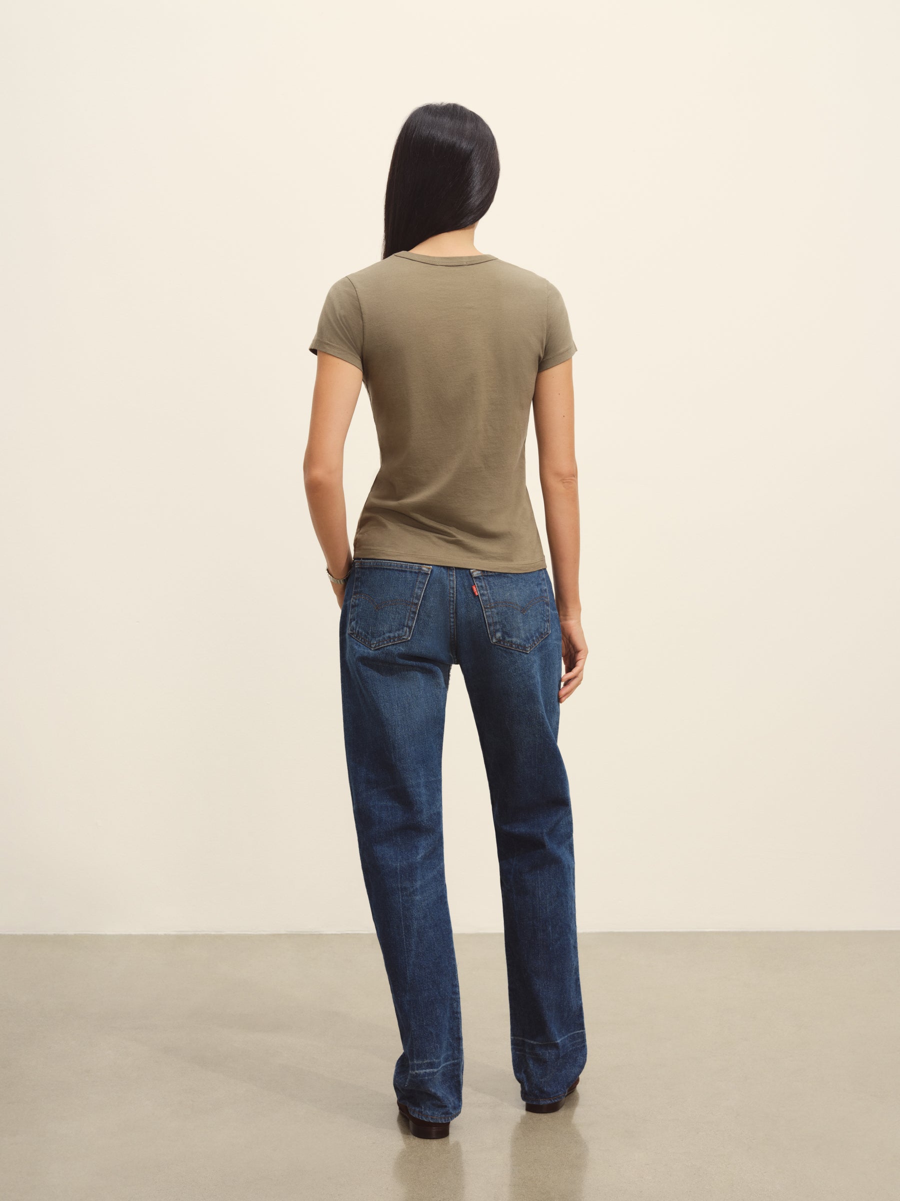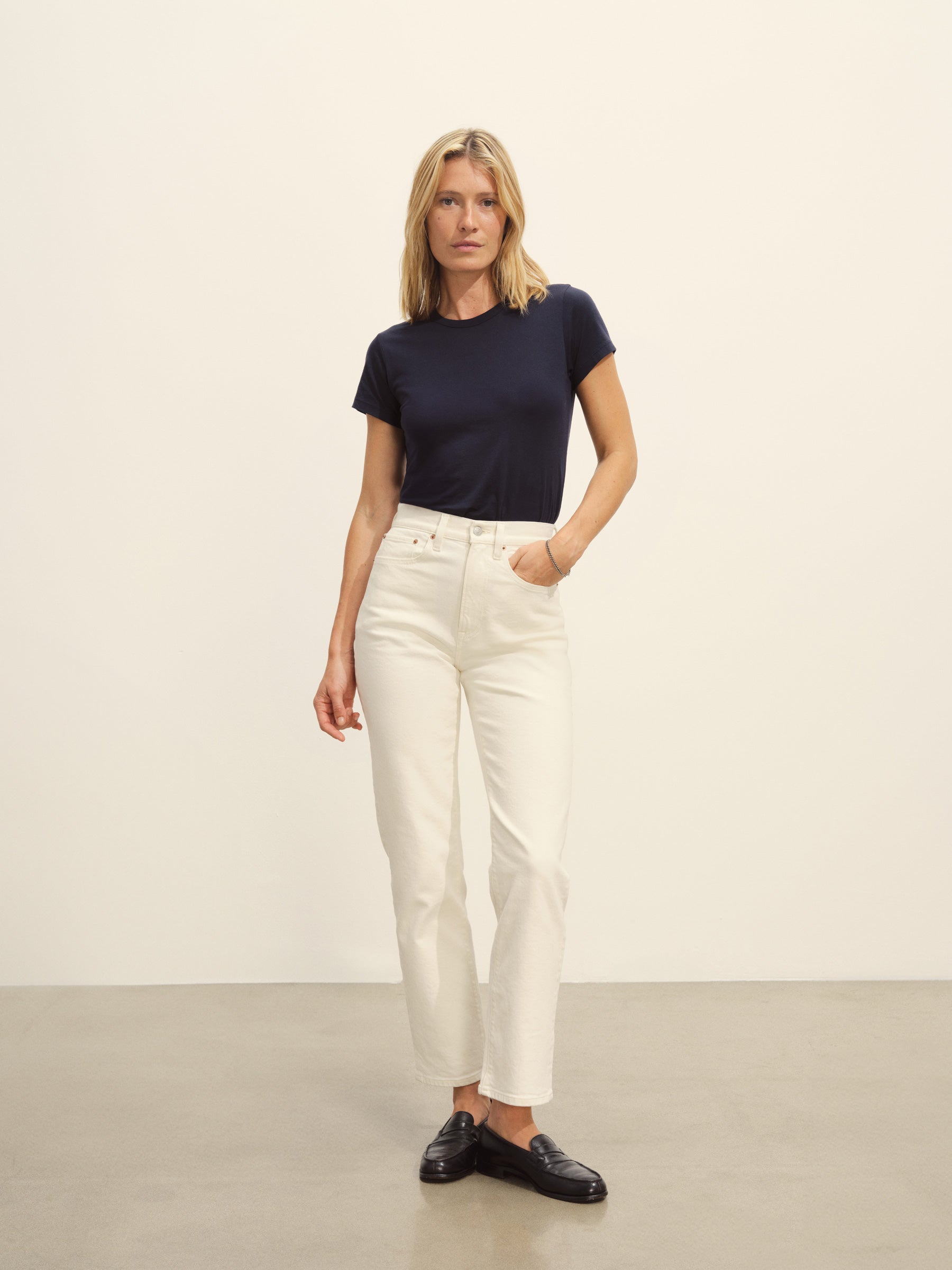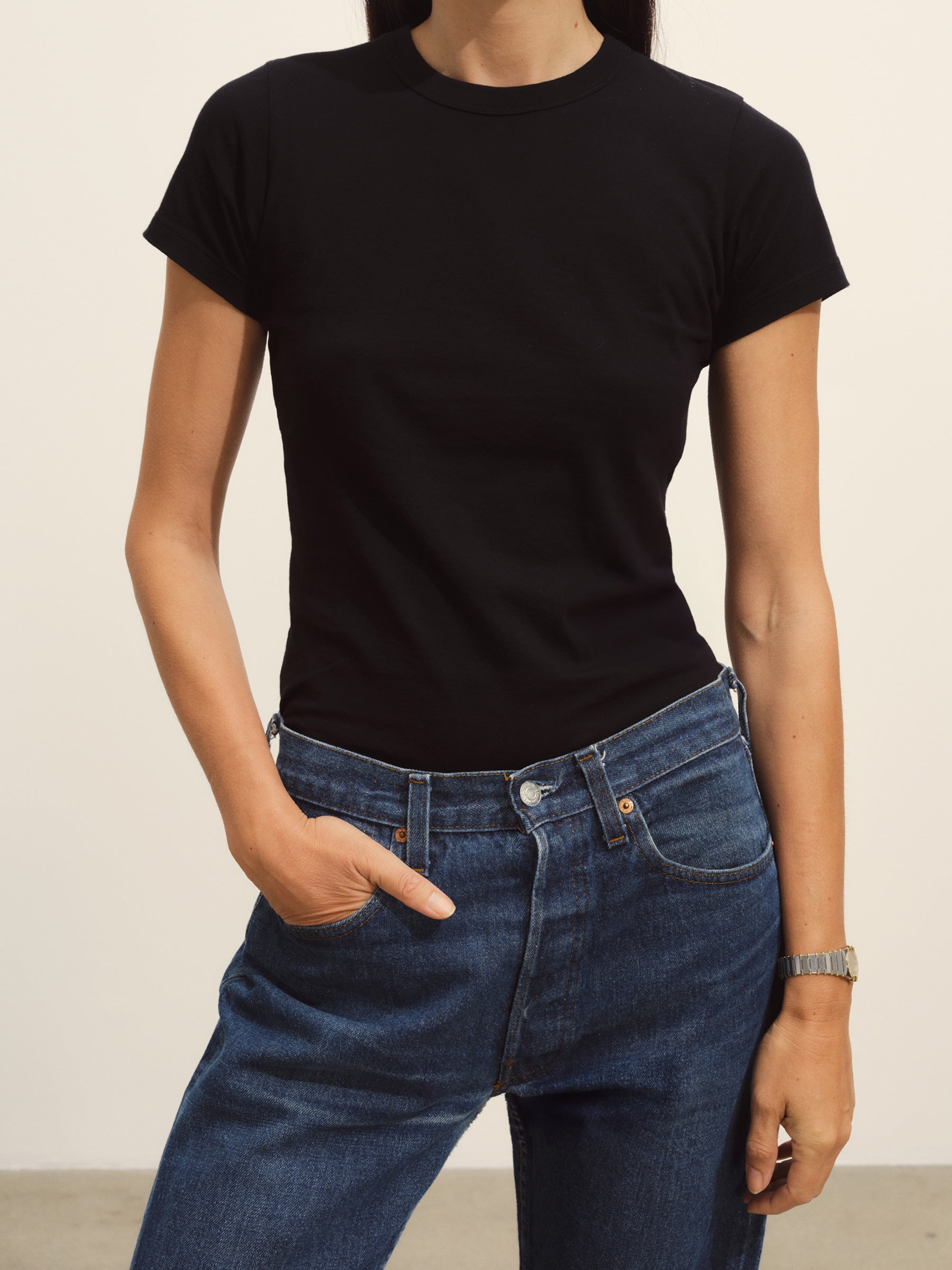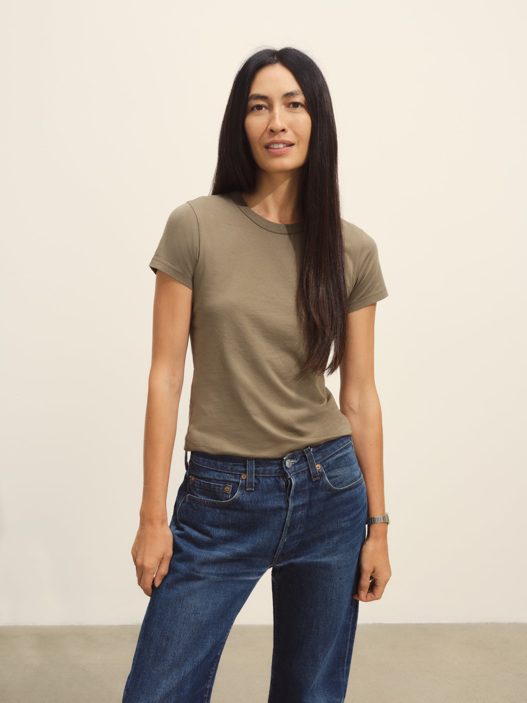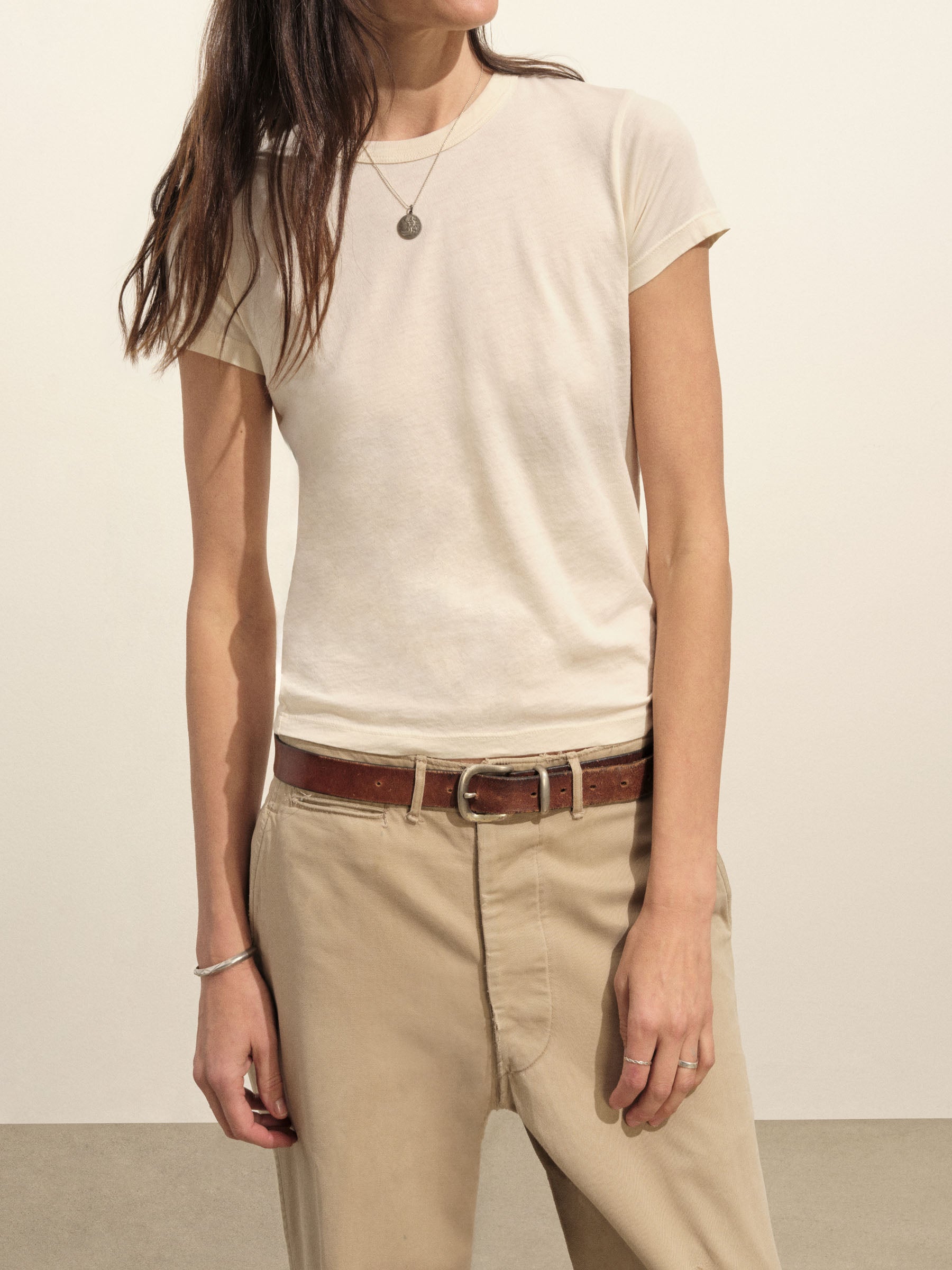 Slim fit short sleeve crewneck tee with a straight hem, cut from 120 GSM Supima cotton.