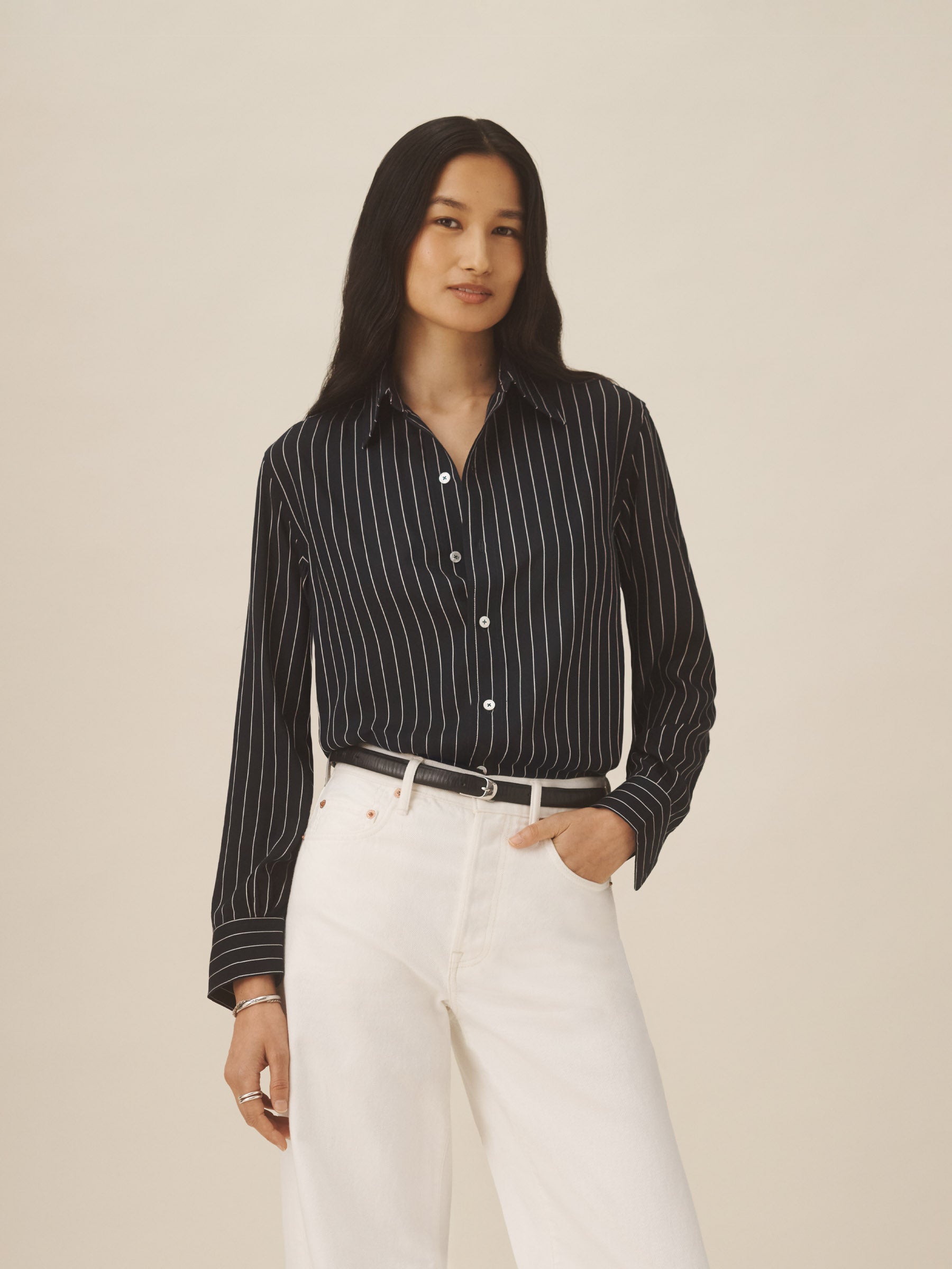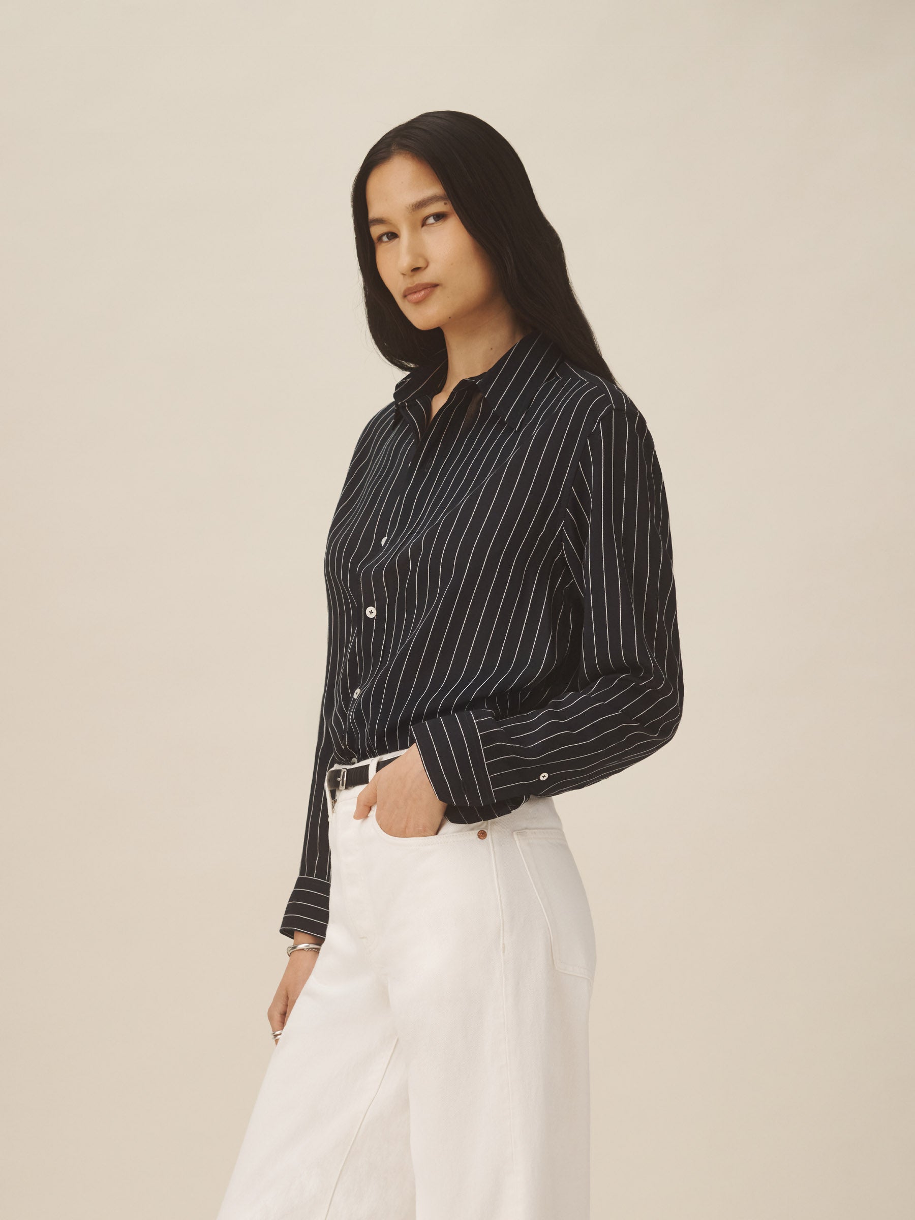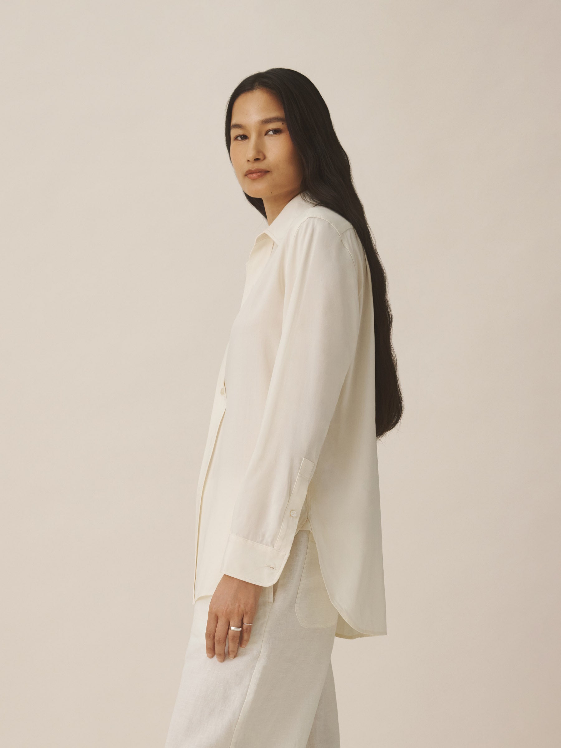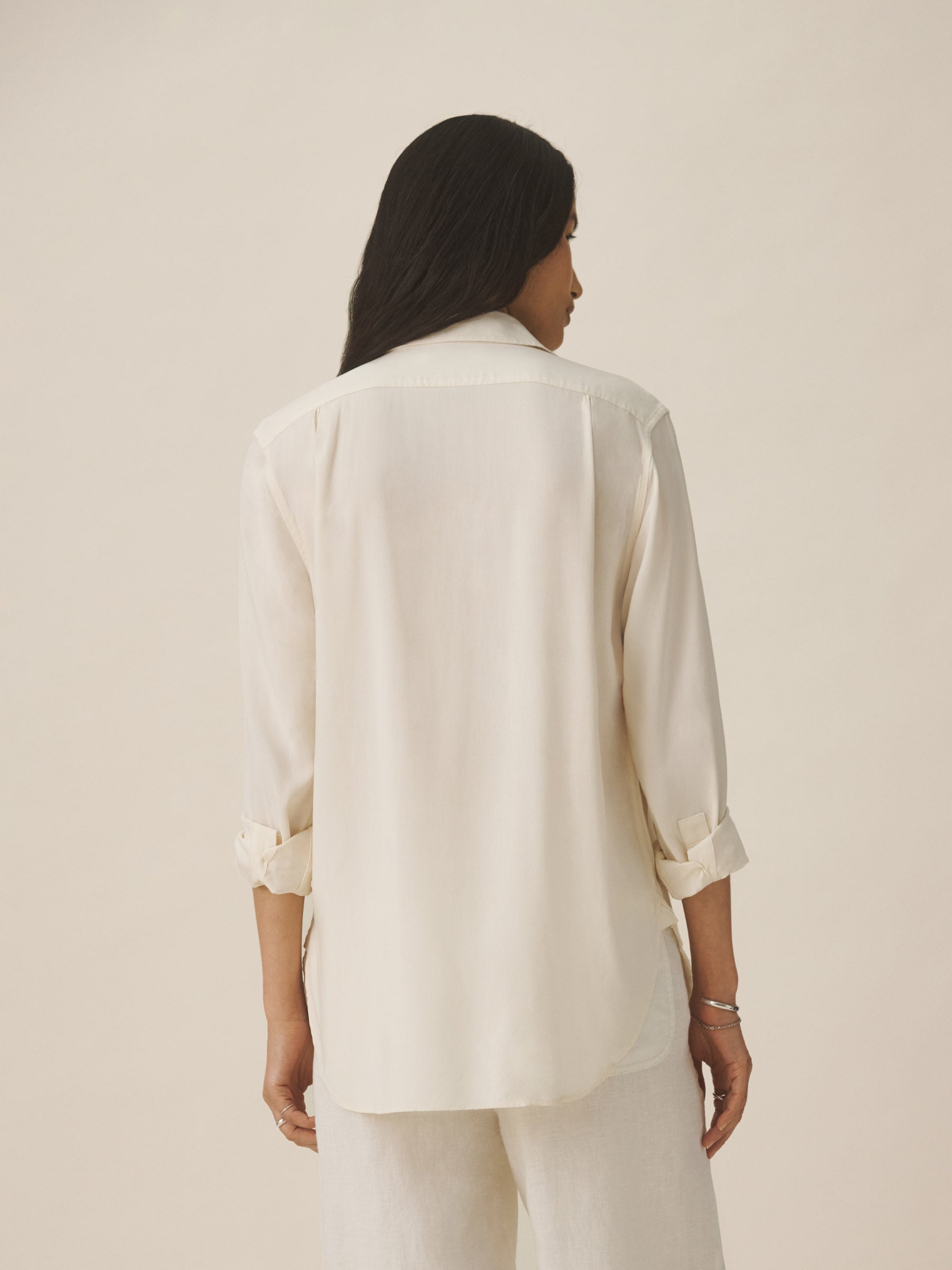 A relaxed-fit, button-down shirt in a silky rayon-jacquard weave.
