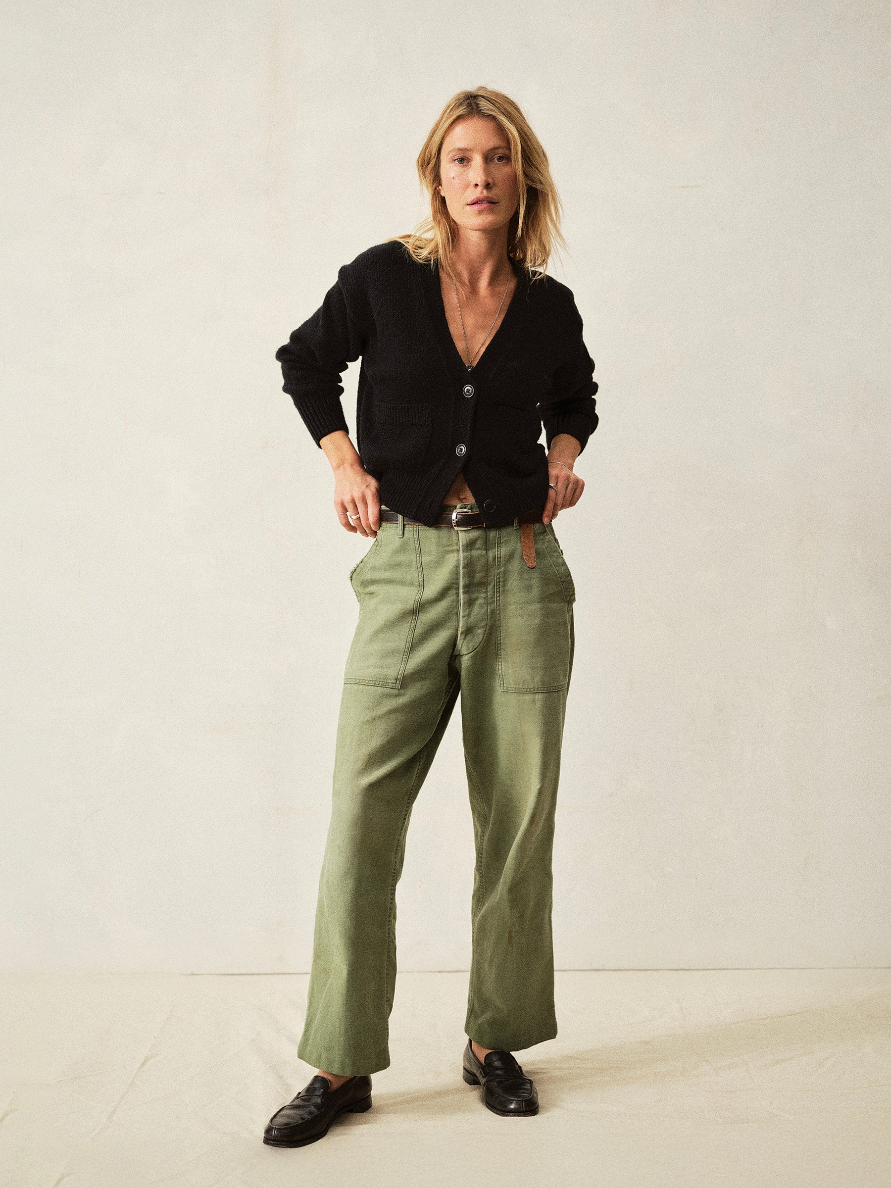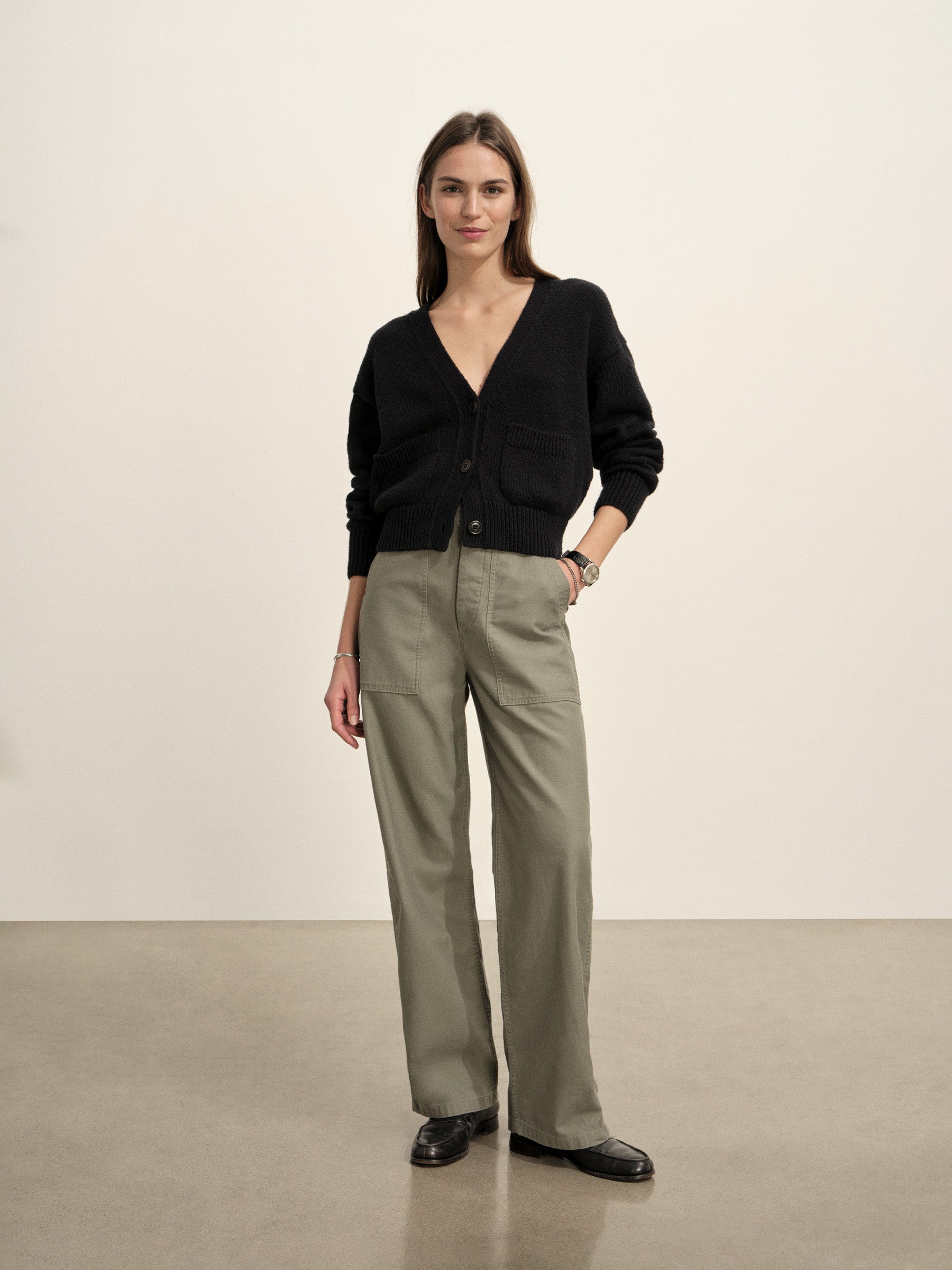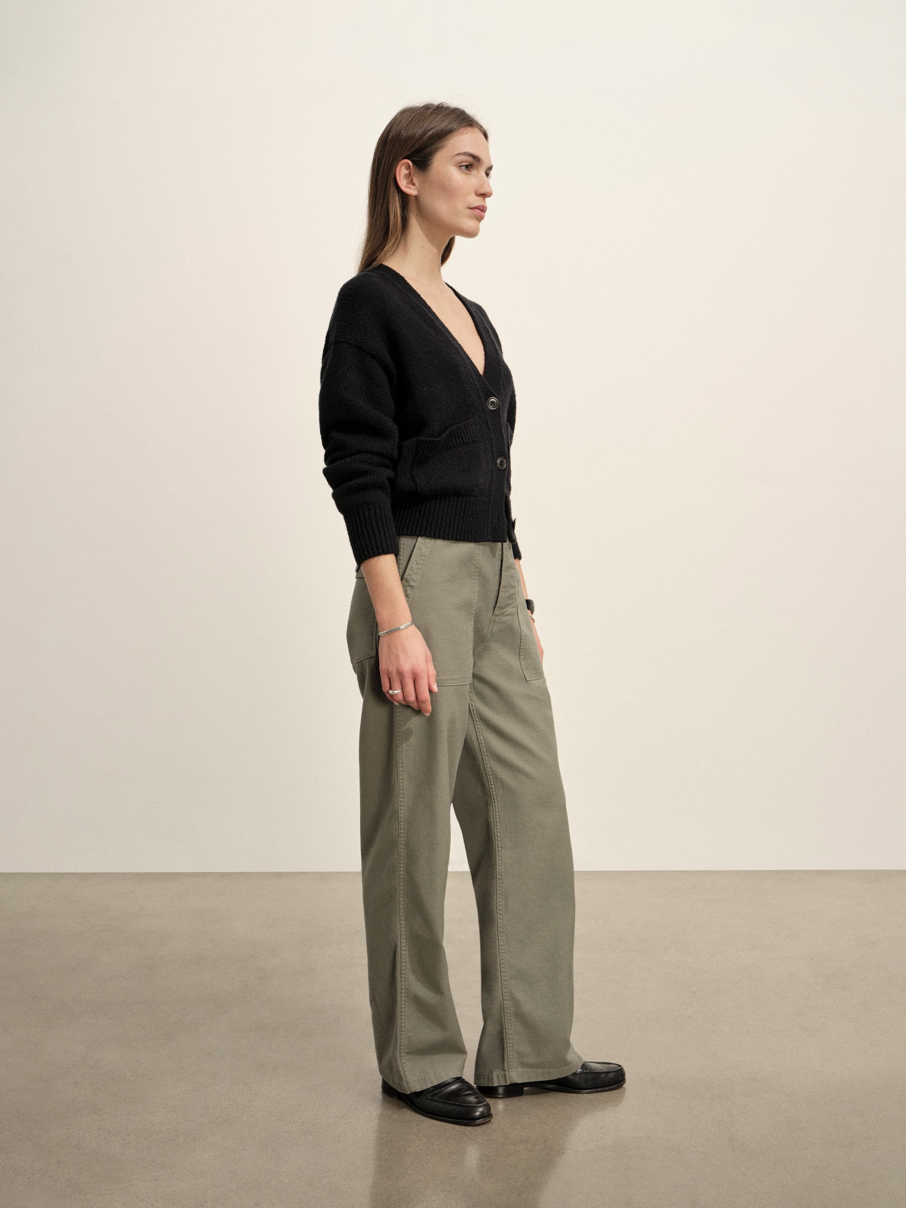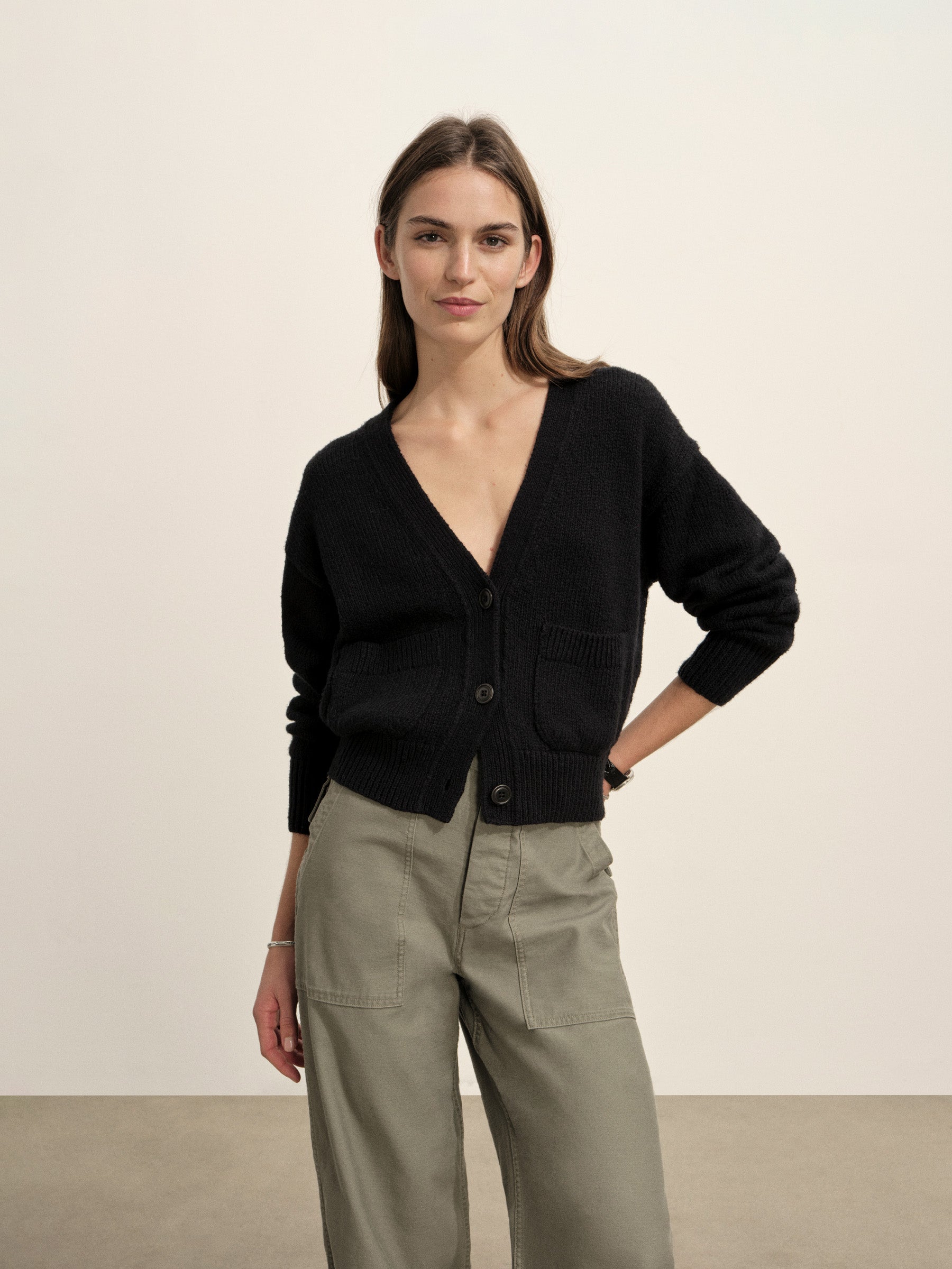 Relaxed cardigan sweater in 5 gauge lofty cotton with buttery soft finish.