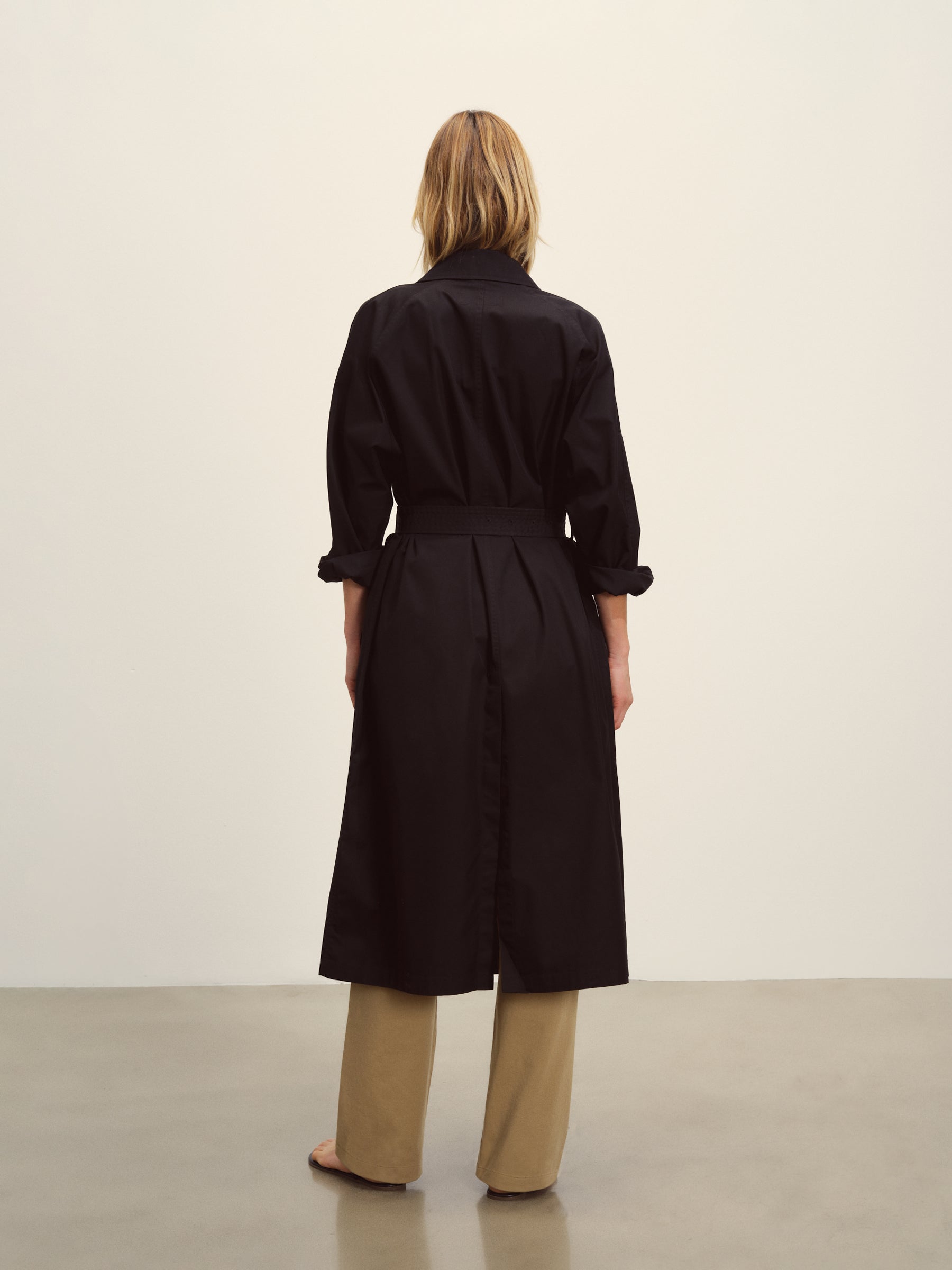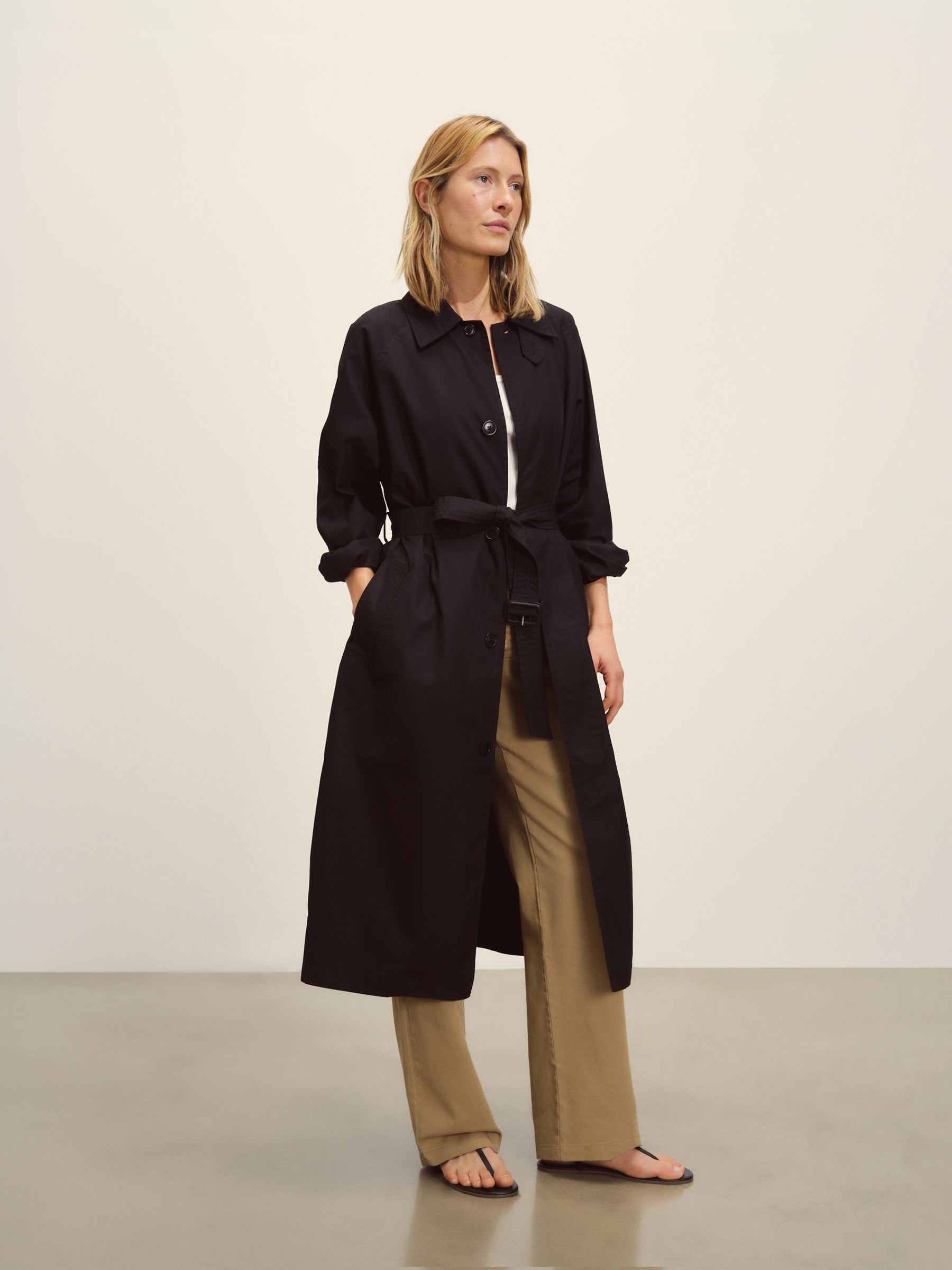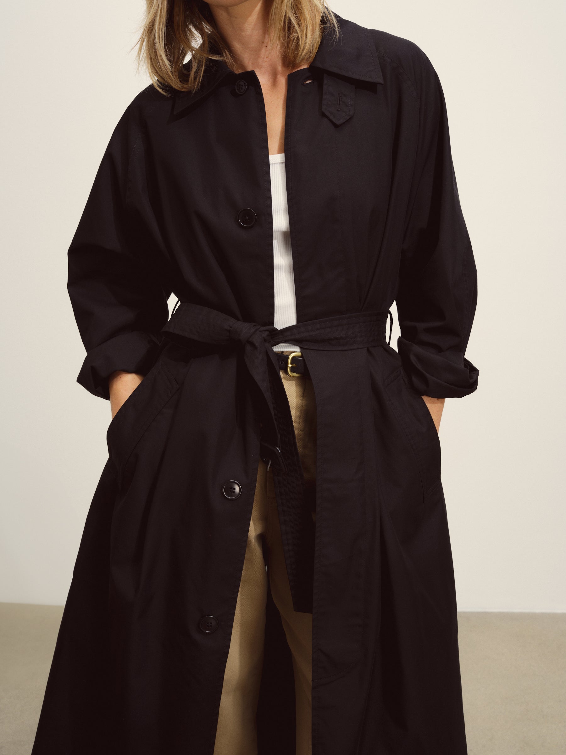 A relaxed trench coat cut from 5.7 oz. weather cloth in a classic, easy silhouette